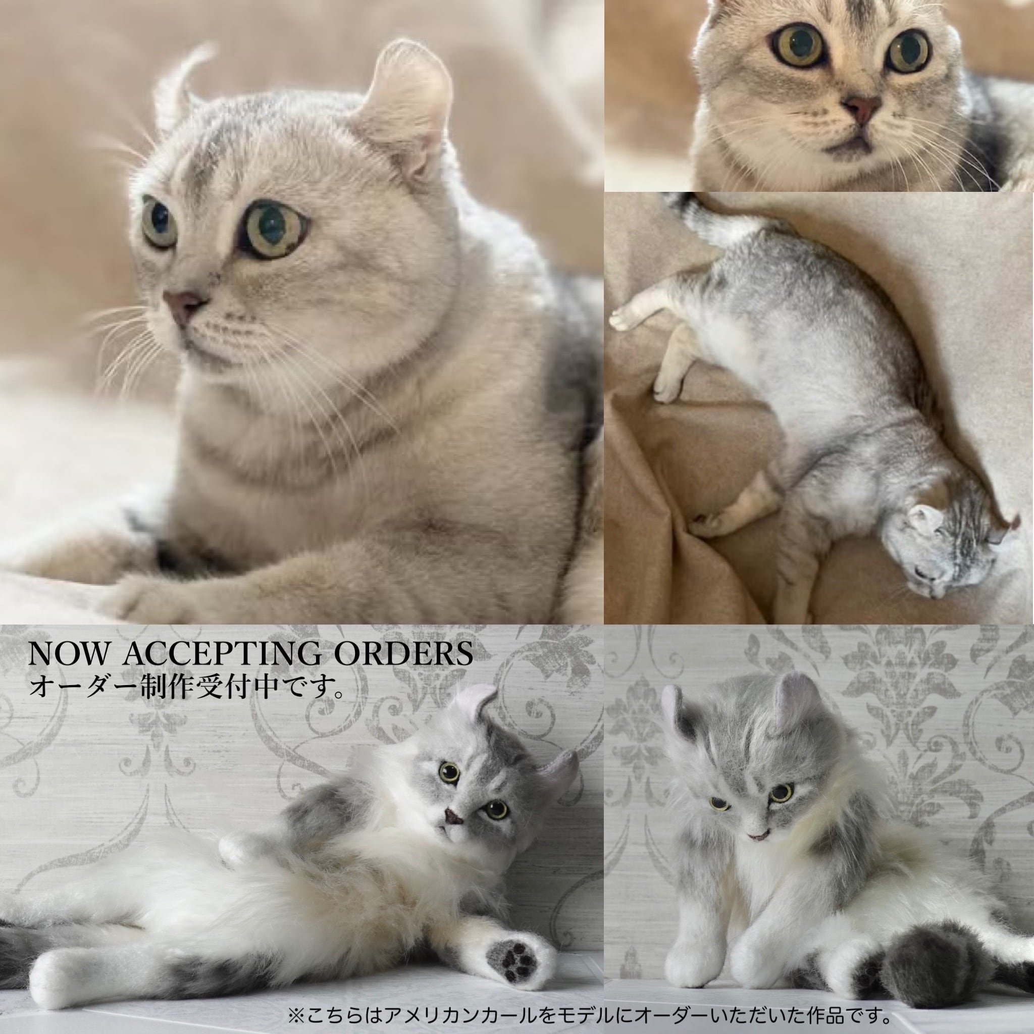 システム上「残り一点」との表記がありますが、こちらは完売しております。 Although the system says “the last one”, this item is currently sold out. 《作品名》 【YK様オーダー商品】アメリカンカール 25A3AC ※こちらは、YK様ご購入専用です。 オーダーご希望のお客様は、お手数ですが、別途capeeshまでお問い合わせください。 ⚪︎product name [Product ordered by YK] American Curl 25A3AC *This is for YK’s purchase only. If you would like to order, please contact capeesh separately. 《特徴》 アメリカンカールのぬいぐるみ。モデルはホワイト・グレー・ベージュが薄く入り混じる短毛の猫ちゃん。長短2種、8色のファーを使用(ホワイト以外は全て手染め)。ベージュは濃淡2色、グレーは濃淡5色のファーを縫い合わせることで微妙なグラデーチョンを再現。そのうちグレーのファーの一つは裏地を染めることで、毛の向きや光の加減で色味が変化するようしています。お腹や首周りの一部に長毛を使用することでフォルムにメリハリを付け、四肢・尻尾・胸にはタビー(縞模様)を配しています。肉球はニードルフェルト(ダークブラウン)で表現しています。目の色はイエローが入ったグリーンです。 関節を固定しないホネ(ステンレス、タングステン等)と流動性のあるガラスペレットを内蔵することで、リアリティとくったり感を再現しています。重量感があり、そのバランスによりいろいろなポージングが可能です。 ⚪︎features An American Curl stuffed toy. The model is a short-haired cat with a light mix of white, gray, and beige. Two types of long and short fur and eight colors are used (all except the white are hand-dyed). The beige fur is sewn together in two shades, and the gray fur is sewn together in five shades to create a subtle gradation. One of the gray furs has a dyed lining, so that the color changes depending on the direction of the fur and the amount of light. The long fur is used on parts of the belly and neck to give the cat a more defined form, and the limbs, tail, and chest have tabby (striped) patterns. The paws are made of needle felt (dark brown). The eyes are green with yellow. By incorporating bones (stainless steel, tungsten, etc.) that do not fix the joints and glass pellets with fluidity, it reproduces reality and a feeling of softness. It has a sense of weight, and various poses can be made depending on the balance. 《素材》 ・ファー:アクリル、ポリエステル ・ボーン等内蔵物:ステンレス、タングステン、木材、布、ガラスペレット、ポリエステル ・目:アクリル ・肉球:ニードルフェルト ・タグ:真鍮 他 ⚪︎material ・fur: acrylic, polyester ・bones and other internal materials: stainless steel, tungsten, wood, cloth, glass pellets, polyester ・eyes: acrylic ・paw pads: needle felt ・tag: brass etc. 《サイズ》耳から尻尾まで 36cm ⚪︎size from ear to tail 36cm 《重さ》 223g ⚪︎weight 223g 《その他》 ・画像の色味が実物と若干異なる場合があります。 ・ファーの質感には個体差があります。 ・デリケートな作品のため、抱き続けたり、遊んだり、一緒に寝たりするのには適しません。 ・特に顔と手足はデリケートなため、粘着クリーナー等は使用しないでください。 ・生地の性質上、繊維が抜けることがあります。取扱いにはご注意ください。 ・お子様の手の届かない所でご利用ください。 ・洗濯はしないでください。 ・色落ちする可能性があるため置き場所等にはご注意ください。 ・湿度等でファーが寝てきた場合は、優しく温風のドライヤーをかけるとふわっとなります。 ⚪︎others ・The color of the image may differ slightly from the actual product. ・The texture of the fur varies from piece to piece. ・This is a delicate item, so it is not suitable for hugging, playing, or sleeping with. ・Do not use sticky cleaners, etc., as the face and limbs are particularly delicate. ・Due to the nature of the fabric, fibers may come off. Please handle with care. ・Keep out of reach of children. ・Do not wash. ・Please be careful about where you place it as the color may fade. ・If the fur becomes flat due to humidity, etc., gently use a warm air dryer to fluff it up.