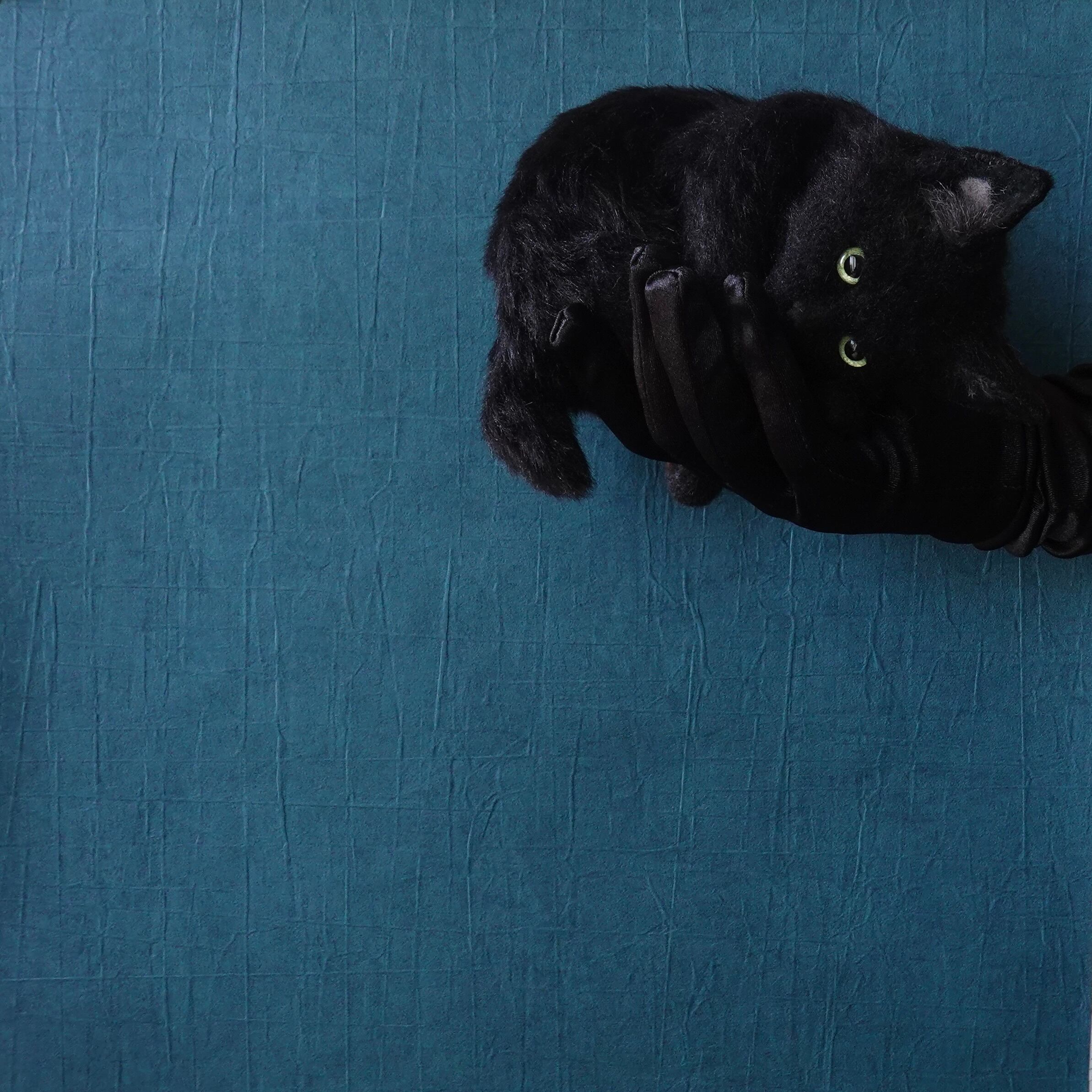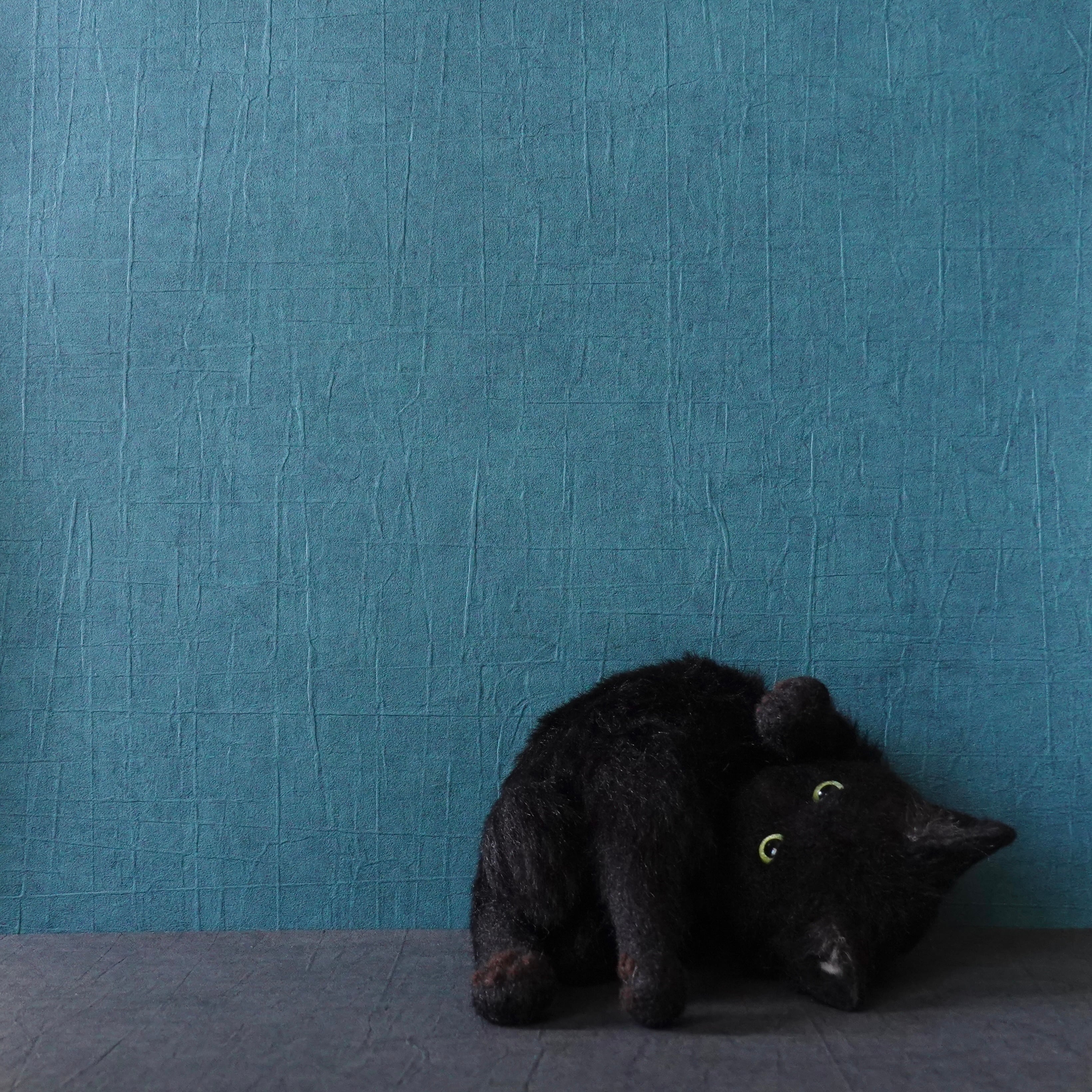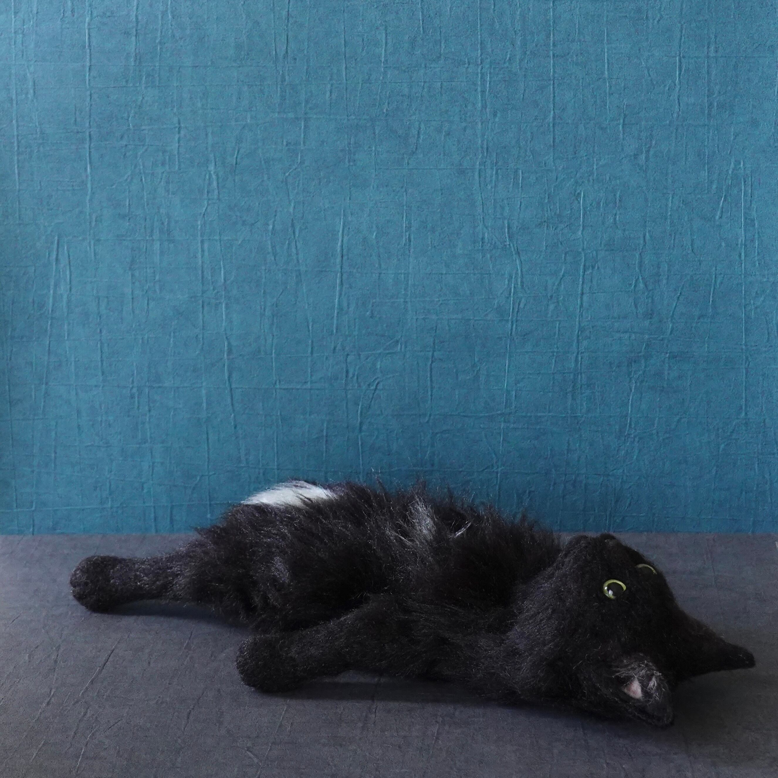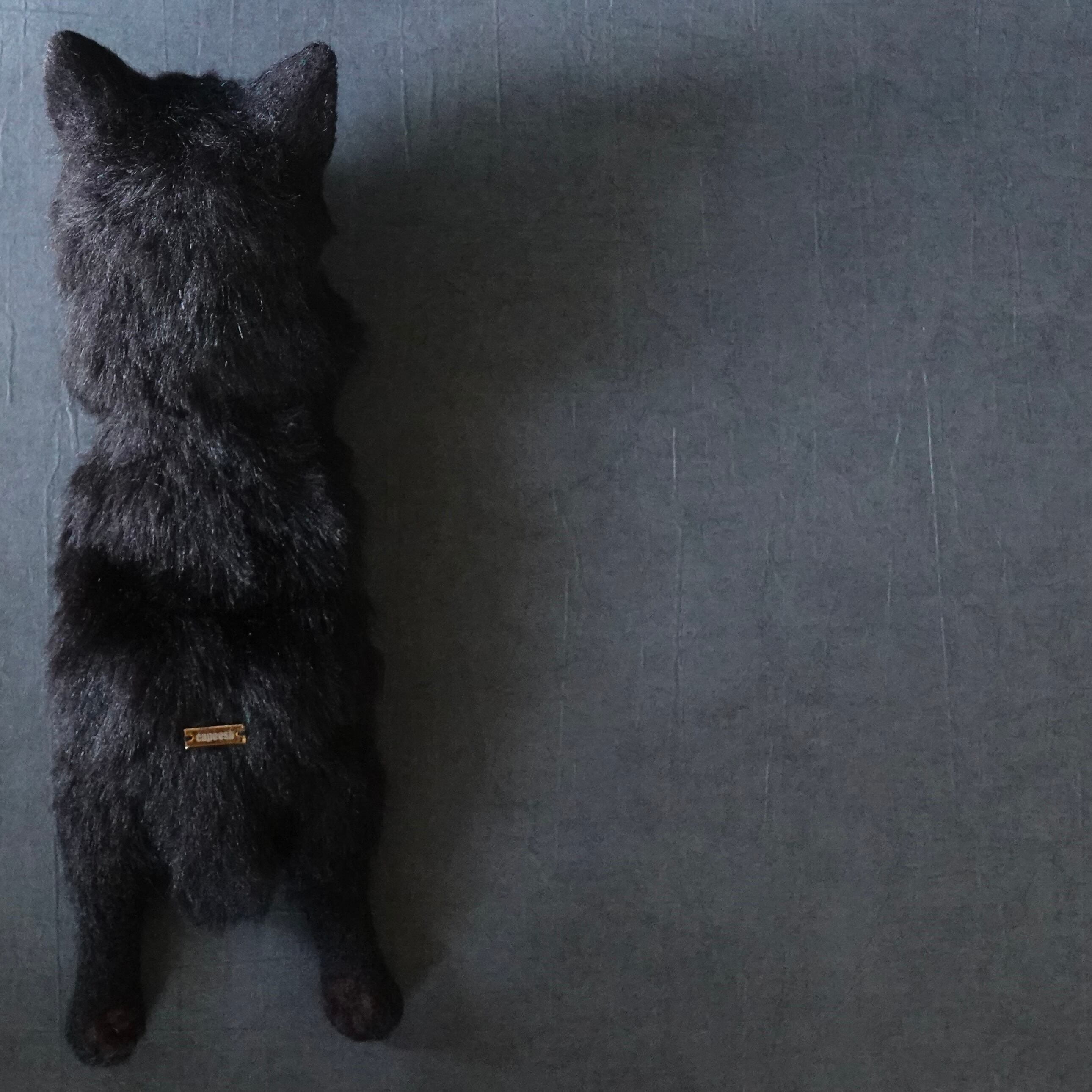 黒猫(ミックス)のぬいぐるみ。モデルの猫ちゃんは、骨格的には小柄ながらも5kgのややぽっちゃり。胸とお腹に少しだけ白毛があり、下向きでやや太めのカギしっぽ。4種3色のファーを使用。お腹側は長短2種の黒を配しメリハリを付け、耳や顔の一部にブラウンと白が混じったファーを配しています。お腹の側面をややふっくらとさせ、魅力的な胸とお腹の白毛の範囲を少し広めに強調しています。肉球はニードルフェルト(ダークブラウン)で表現しています。目の色はイエローが入ったグリーンです。
