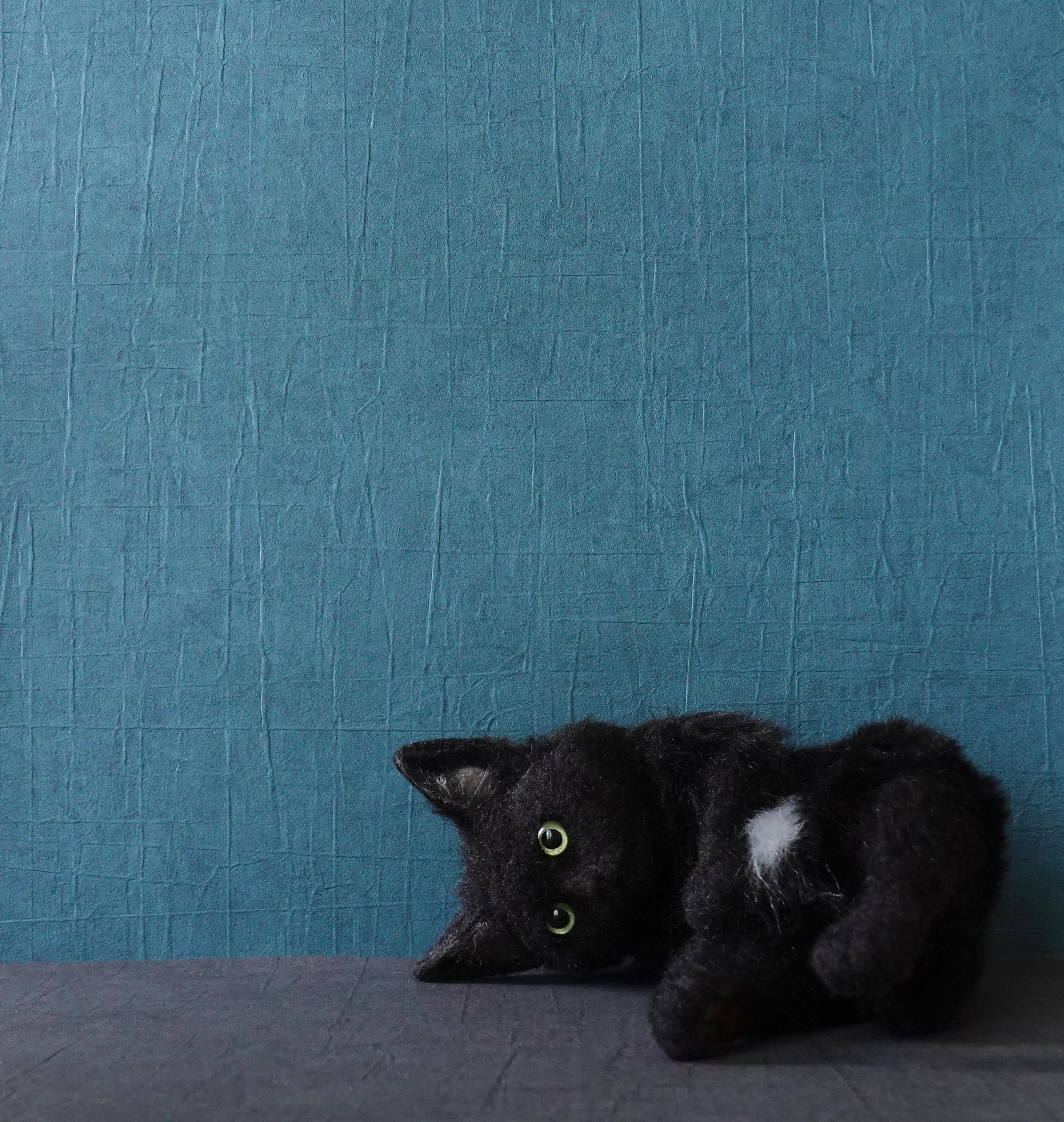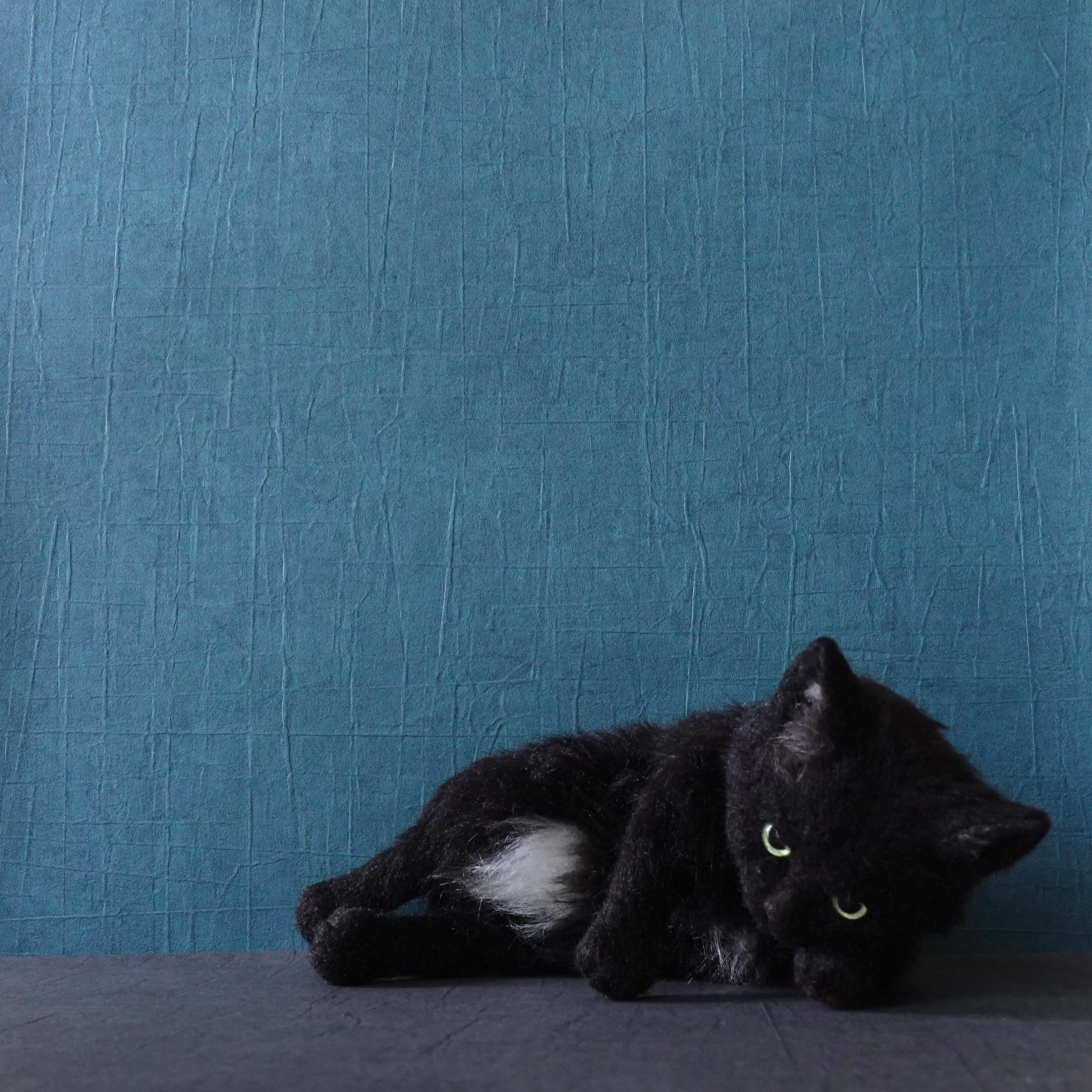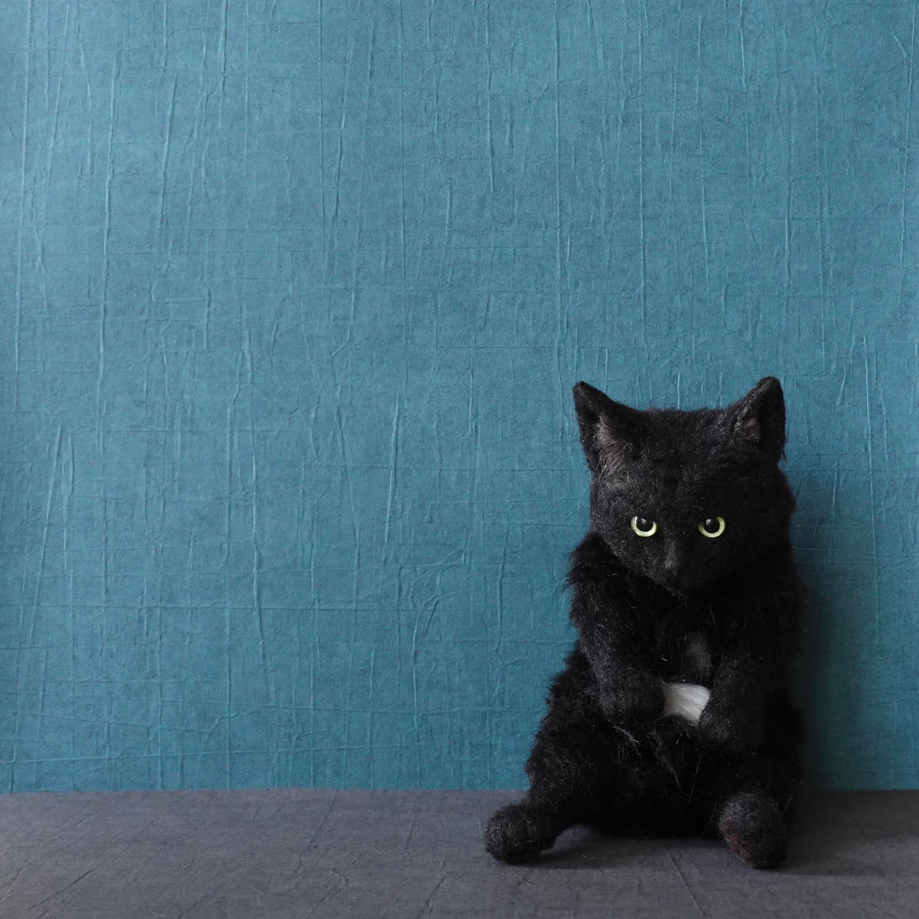 A stuffed toy of a black cat (mixed breed). The model cat is small in skeletal size but a little chubby at 5kg. There is a little bit of white fur on the chest and belly, and a slightly thick, curled tail that points downward. It uses four types of fur in three colors. The belly side is made with two types of black, one long and one short, to add definition, and the ears and part of the face are made with a mix of brown and white fur. The sides of the belly are slightly plump, and the attractive white fur on the chest and belly is slightly larger to emphasize it. The paws are made with needle felt (dark brown). The eyes are green with yellow in them.