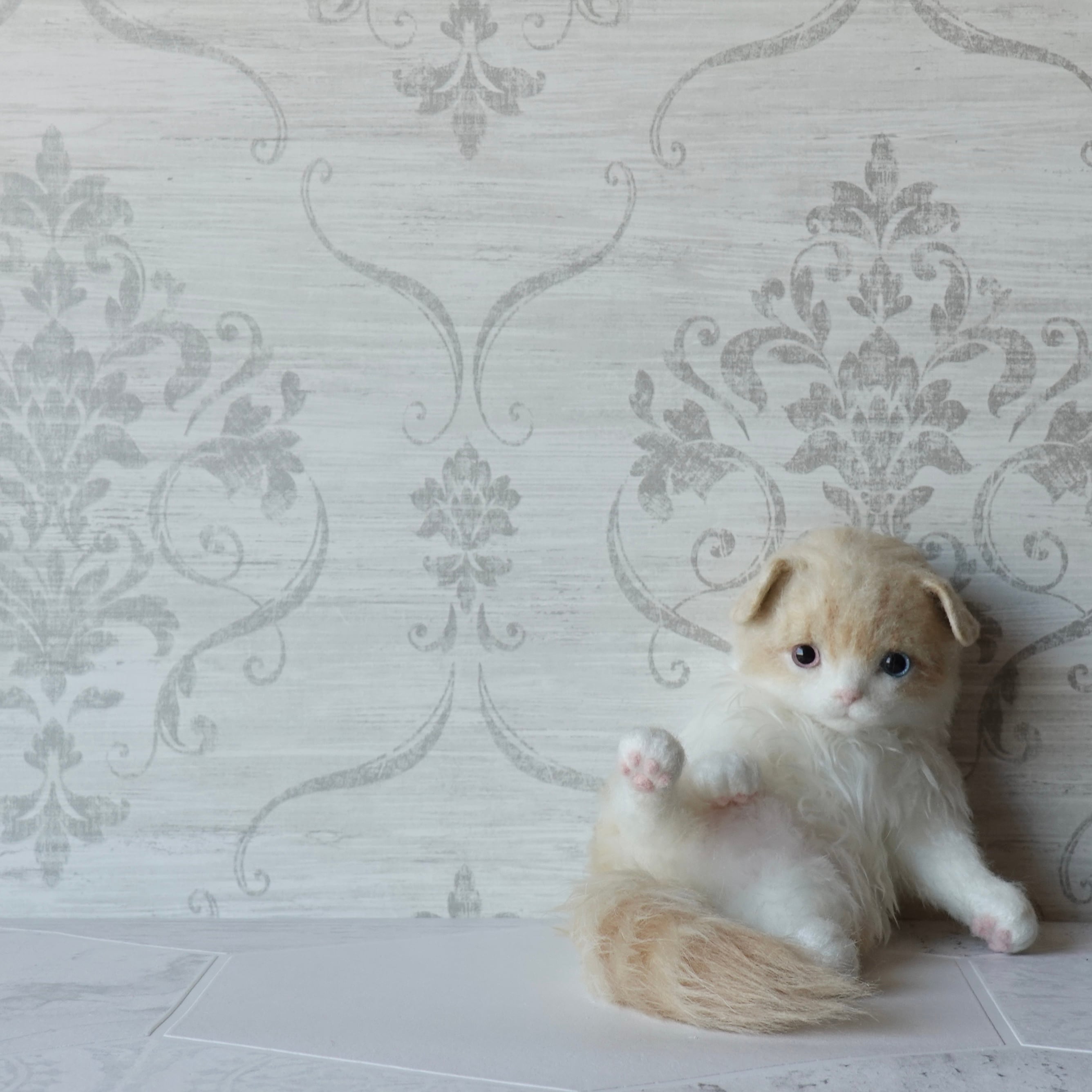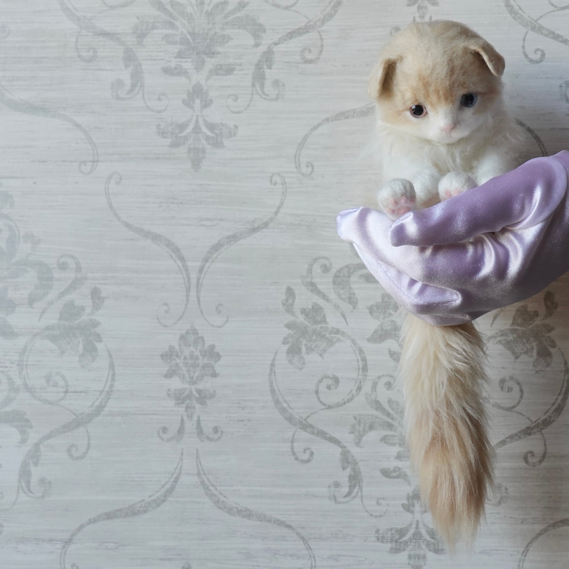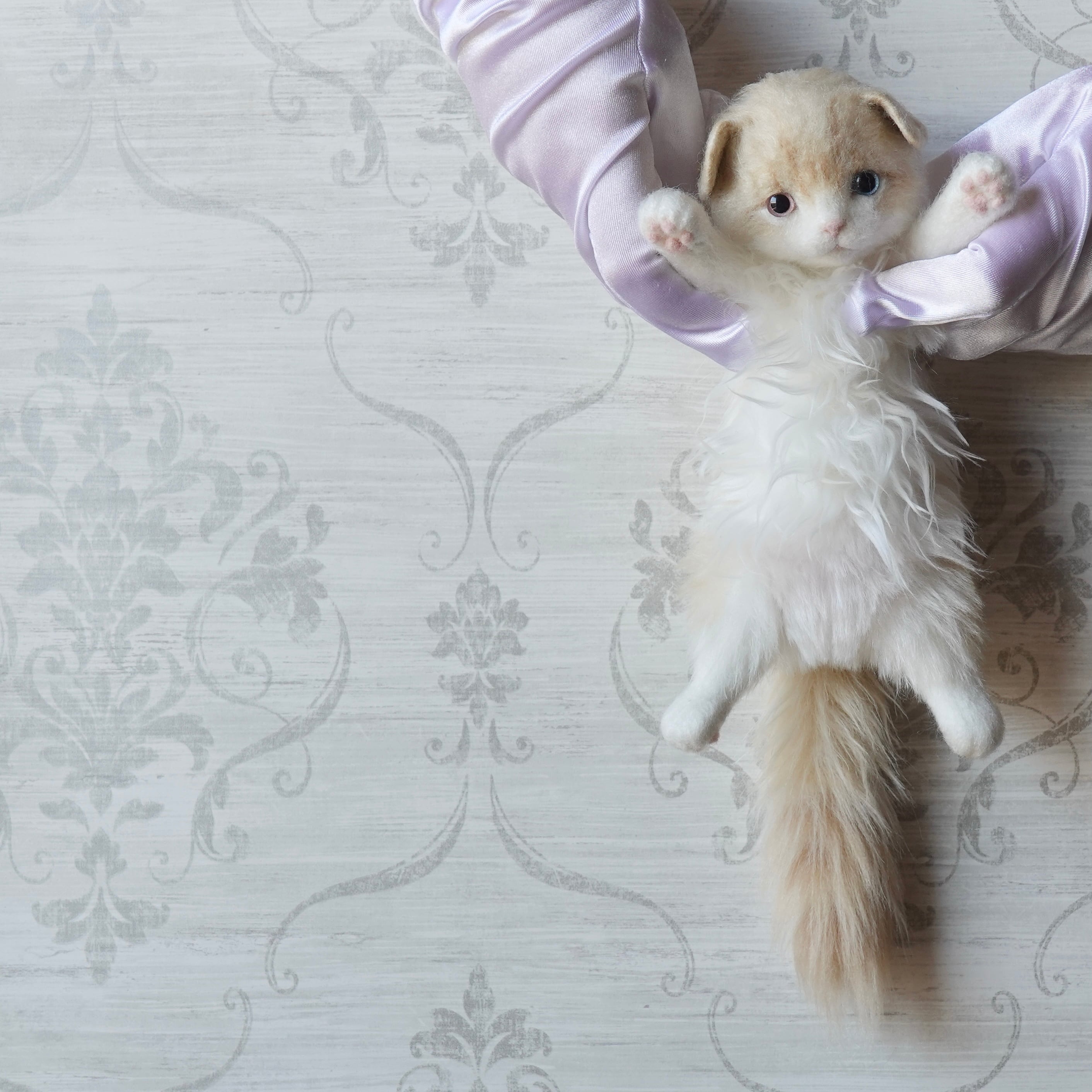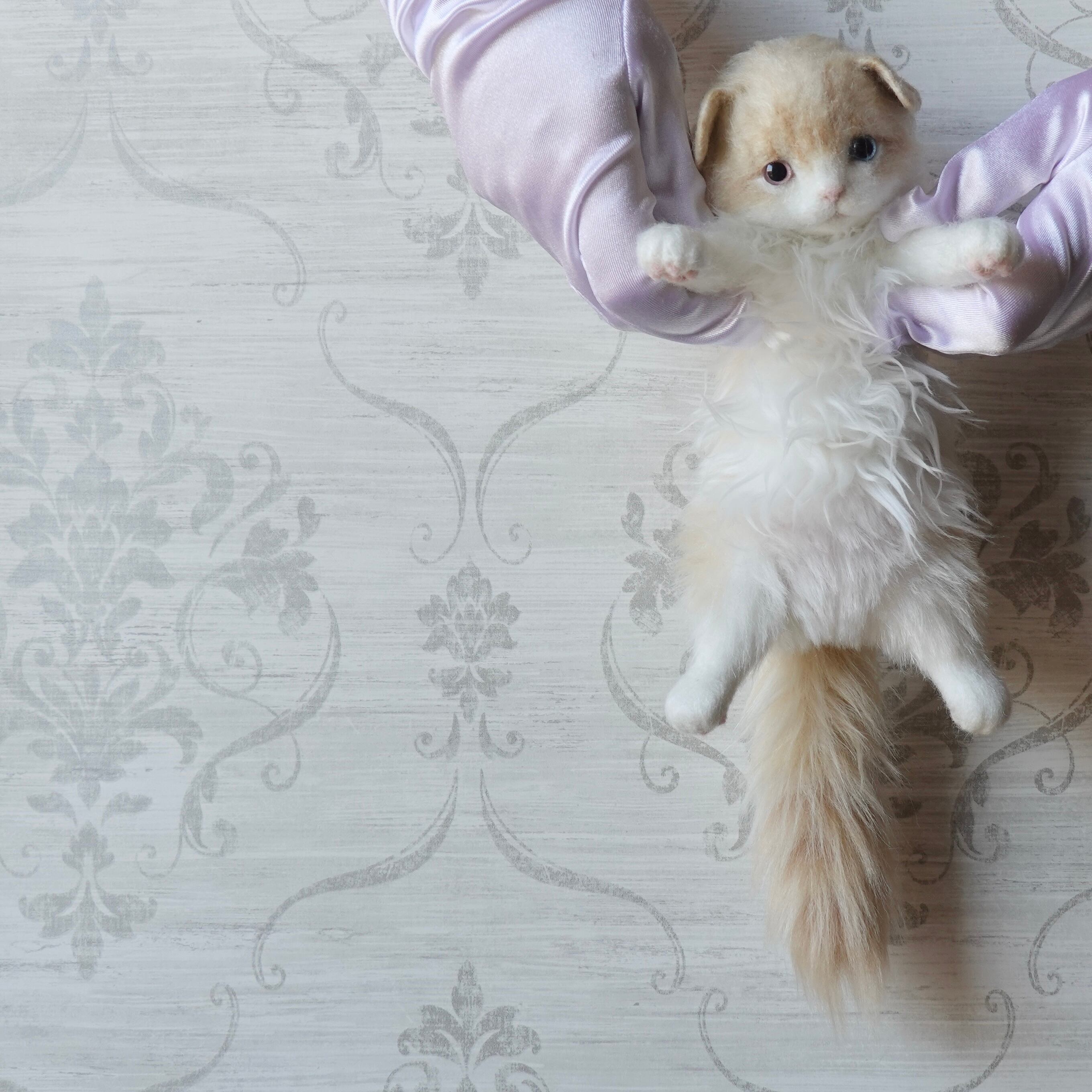 A stuffed toy of a Scottish Fold kitten. It is made by sewing together three different types of fur in three different colors, including hand-dyed ones. The lining of the fur on the belly is dyed pink, allowing a pale pink color to show through the white fur. The tail has a faint tabby (striped) pattern, and the ears are folded forward. The paw pads are made of needle felt (pink). The cat has heterochromatic eyes, with a light red right eye and a light blue left eye.