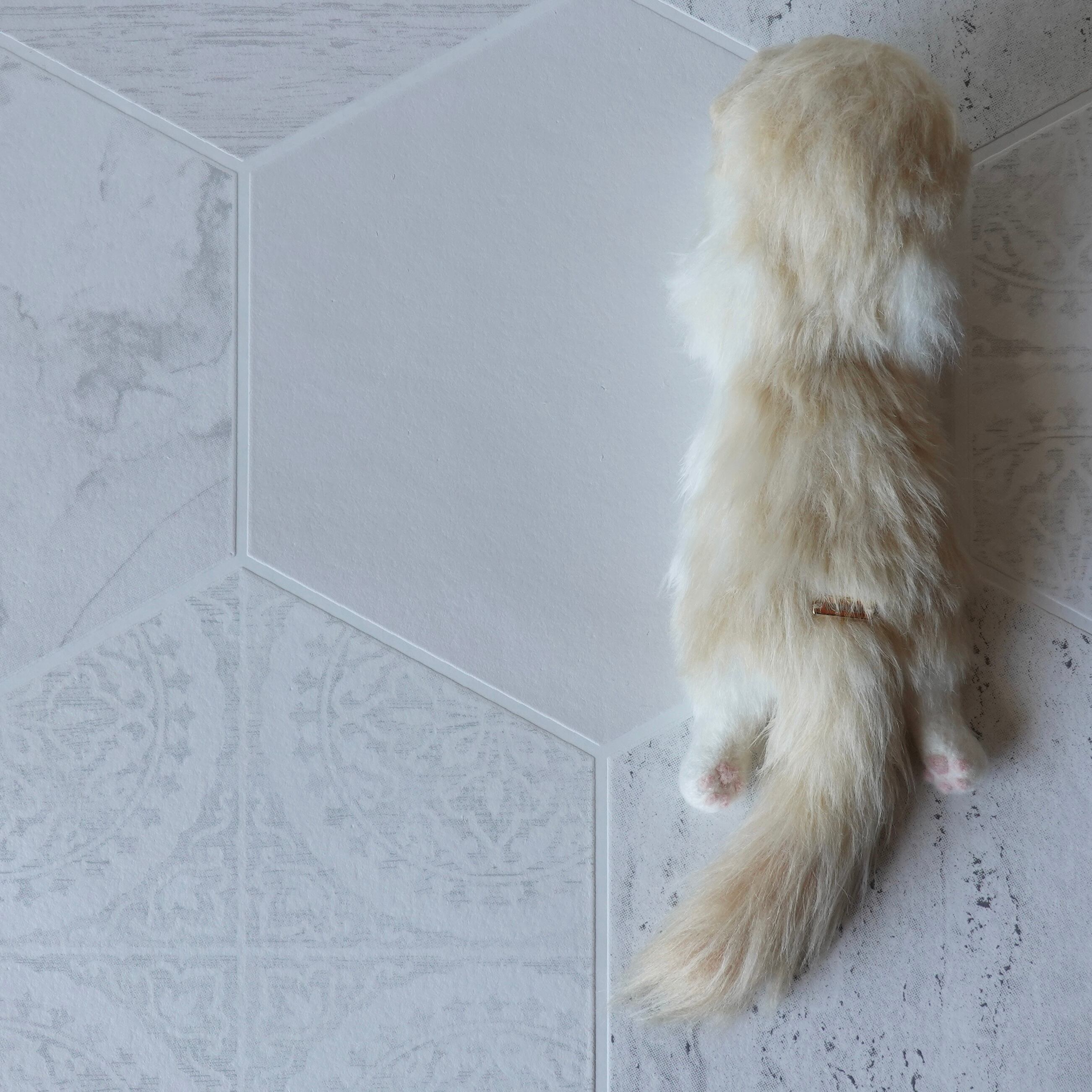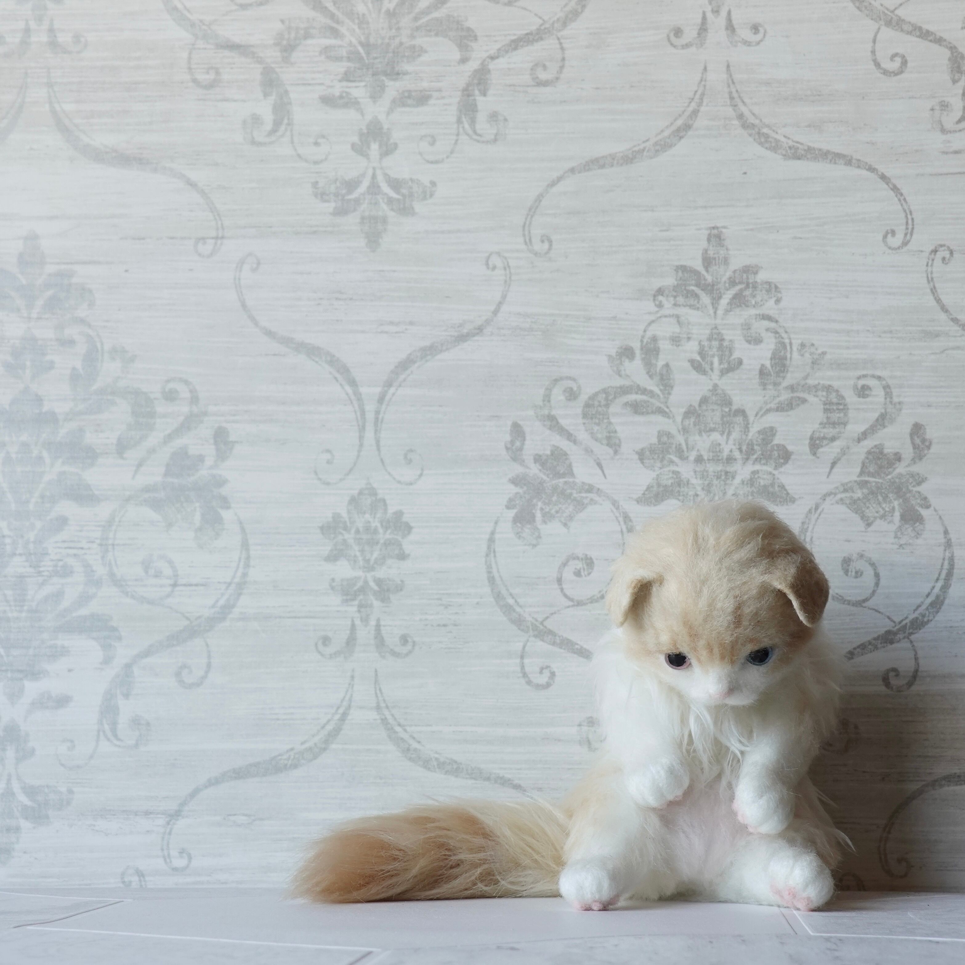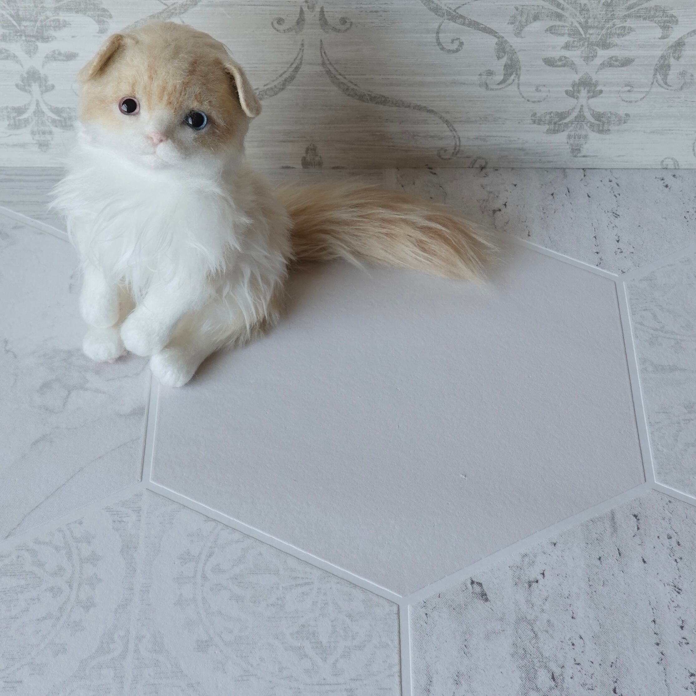 A stuffed toy of a Scottish Fold kitten. It is made by sewing together three different types of fur in three different colors, including hand-dyed ones. The lining of the fur on the belly is dyed pink, allowing a pale pink color to show through the white fur. The tail has a faint tabby (striped) pattern, and the ears are folded forward. The paw pads are made of needle felt (pink). The cat has heterochromatic eyes, with a light red right eye and a light blue left eye.