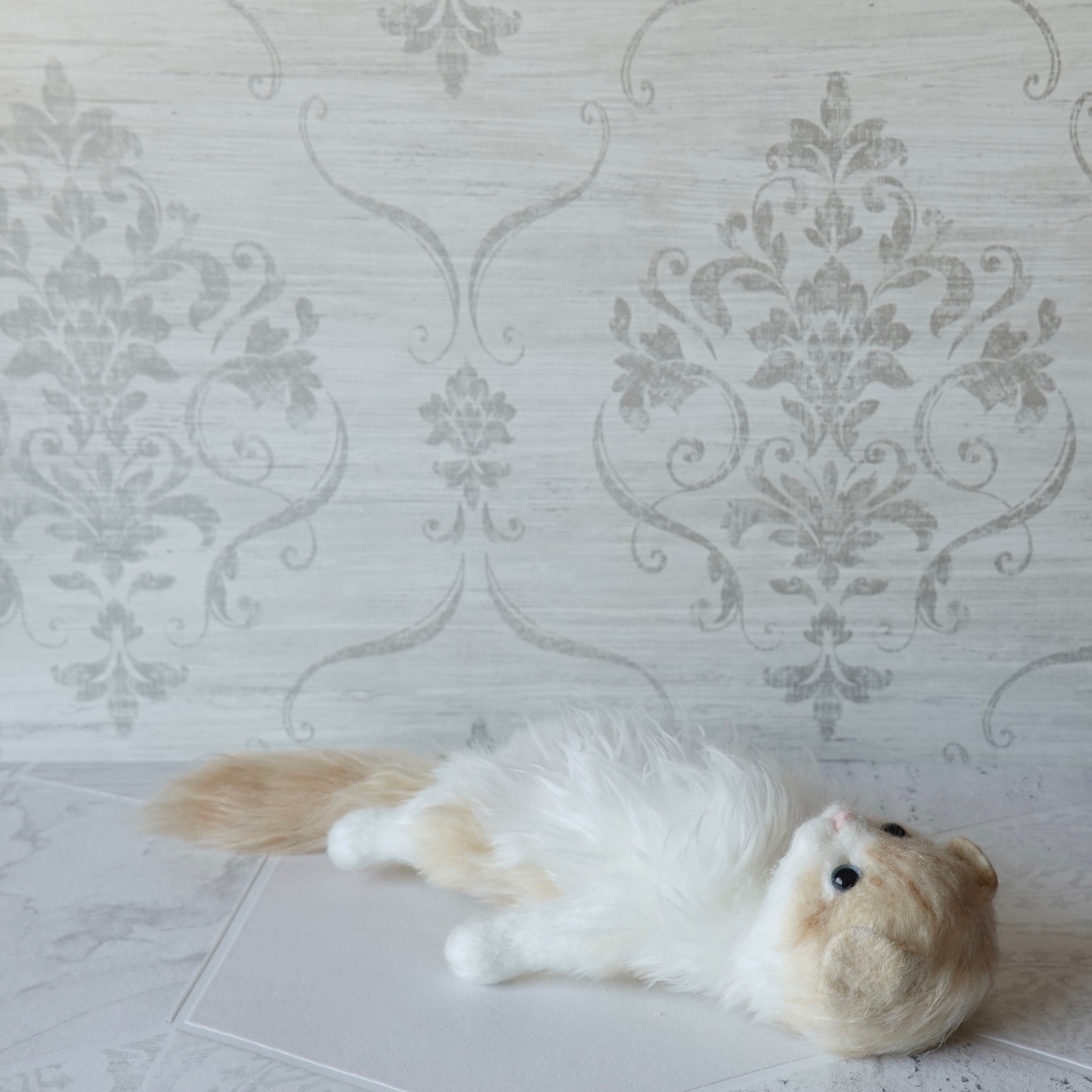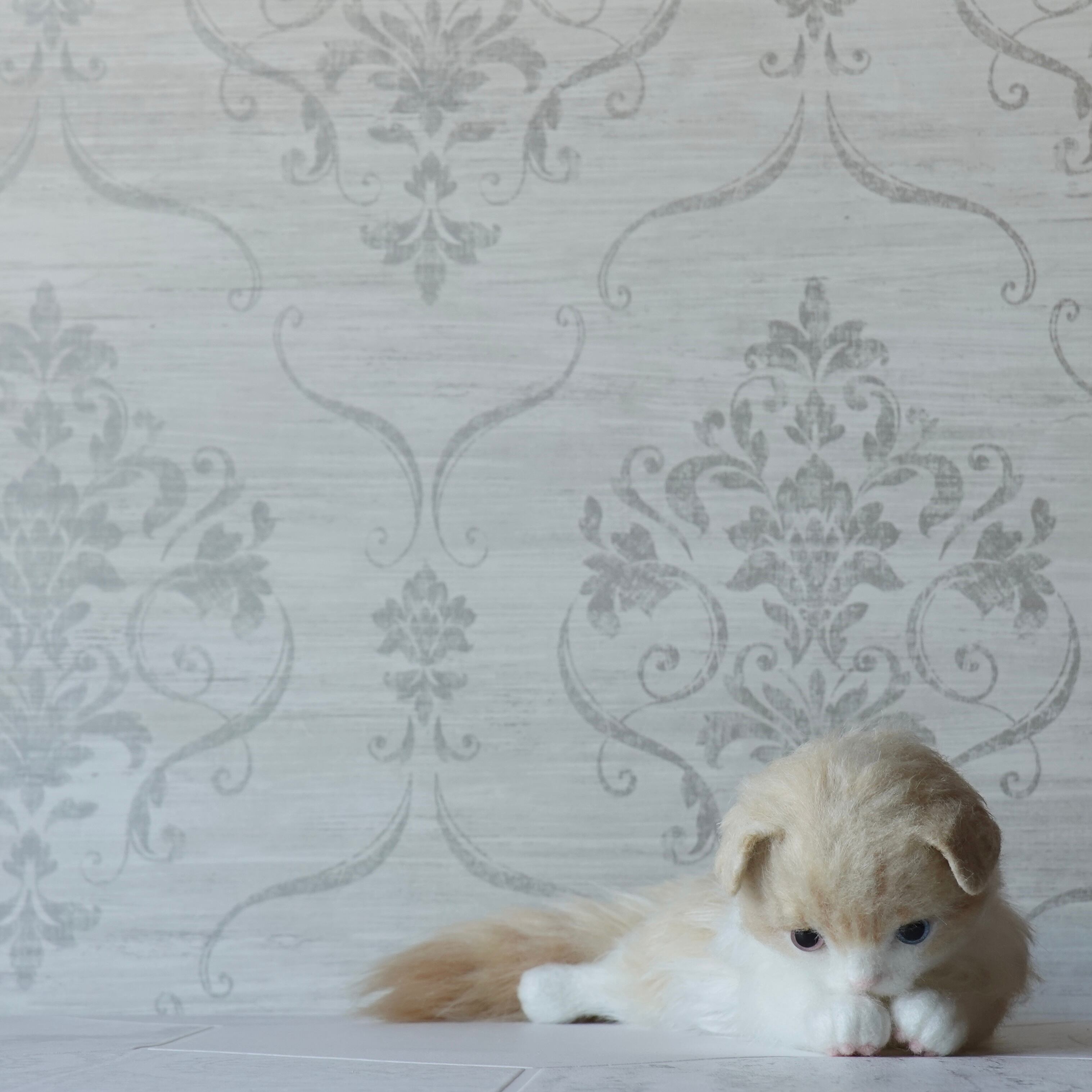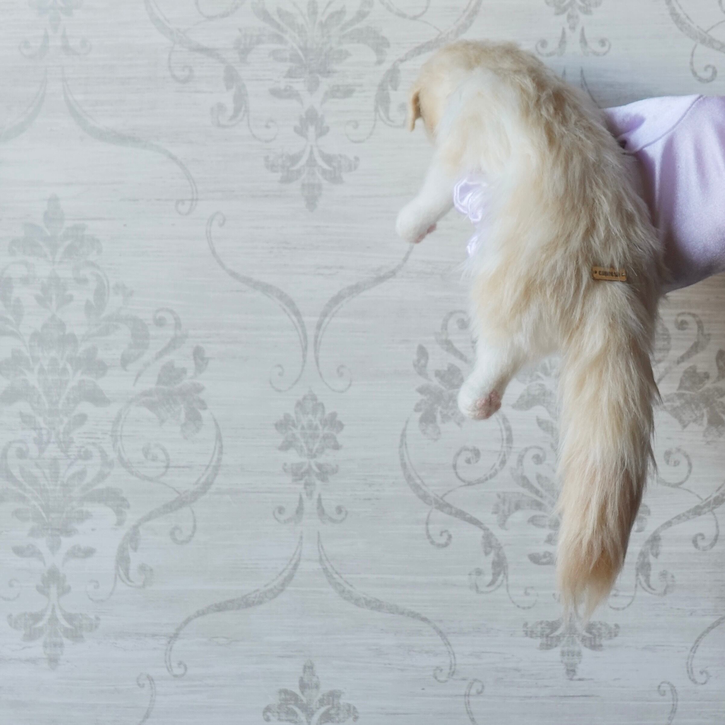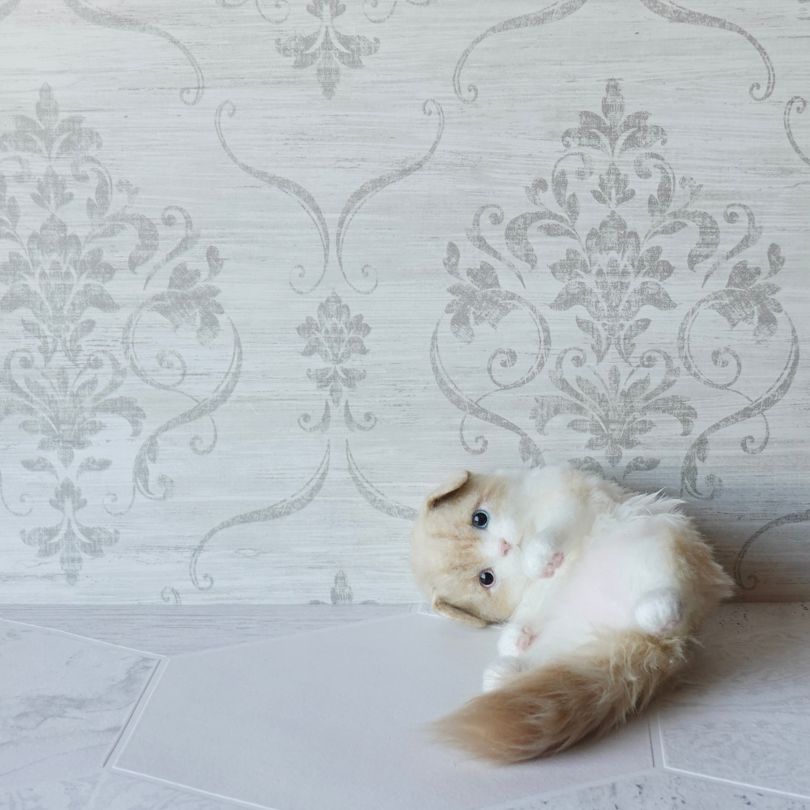 A stuffed toy of a Scottish Fold kitten. It is made by sewing together three different types of fur in three different colors, including hand-dyed ones. The lining of the fur on the belly is dyed pink, allowing a pale pink color to show through the white fur. The tail has a faint tabby (striped) pattern, and the ears are folded forward. The paw pads are made of needle felt (pink). The cat has heterochromatic eyes, with a light red right eye and a light blue left eye.