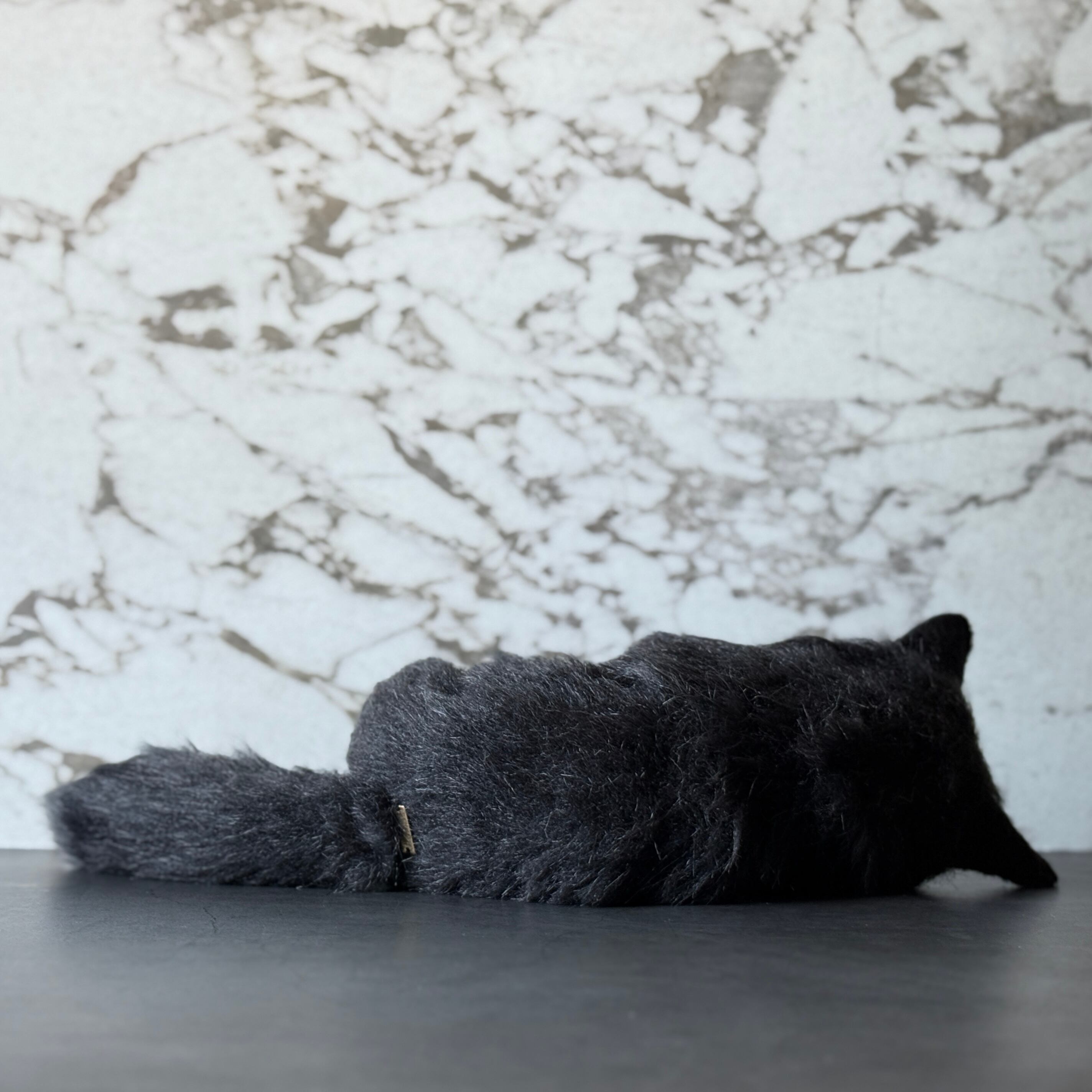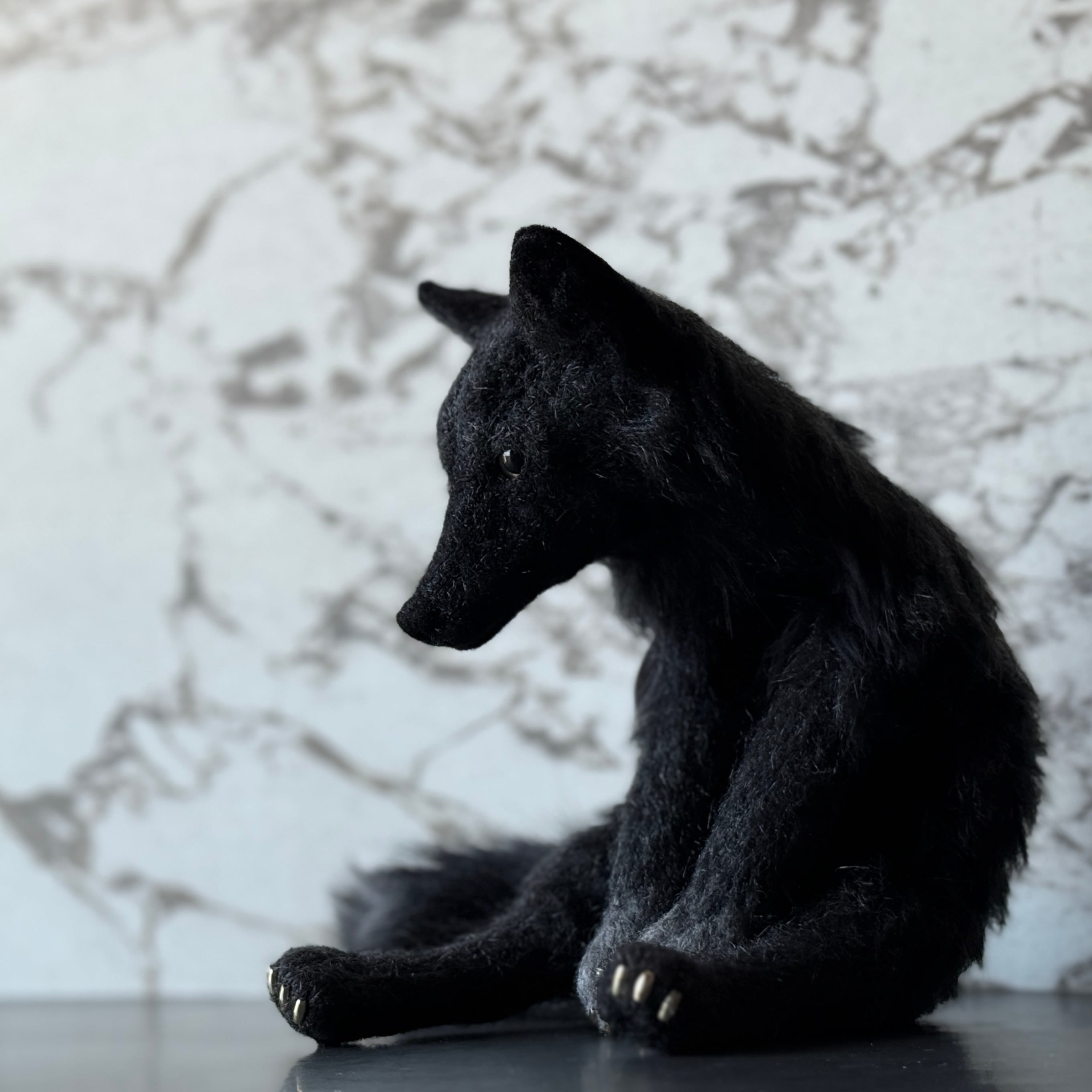 黒いオオカミのぬいぐるみ。どこかキツネのようなニュアンスも感じさせる佇まいです。