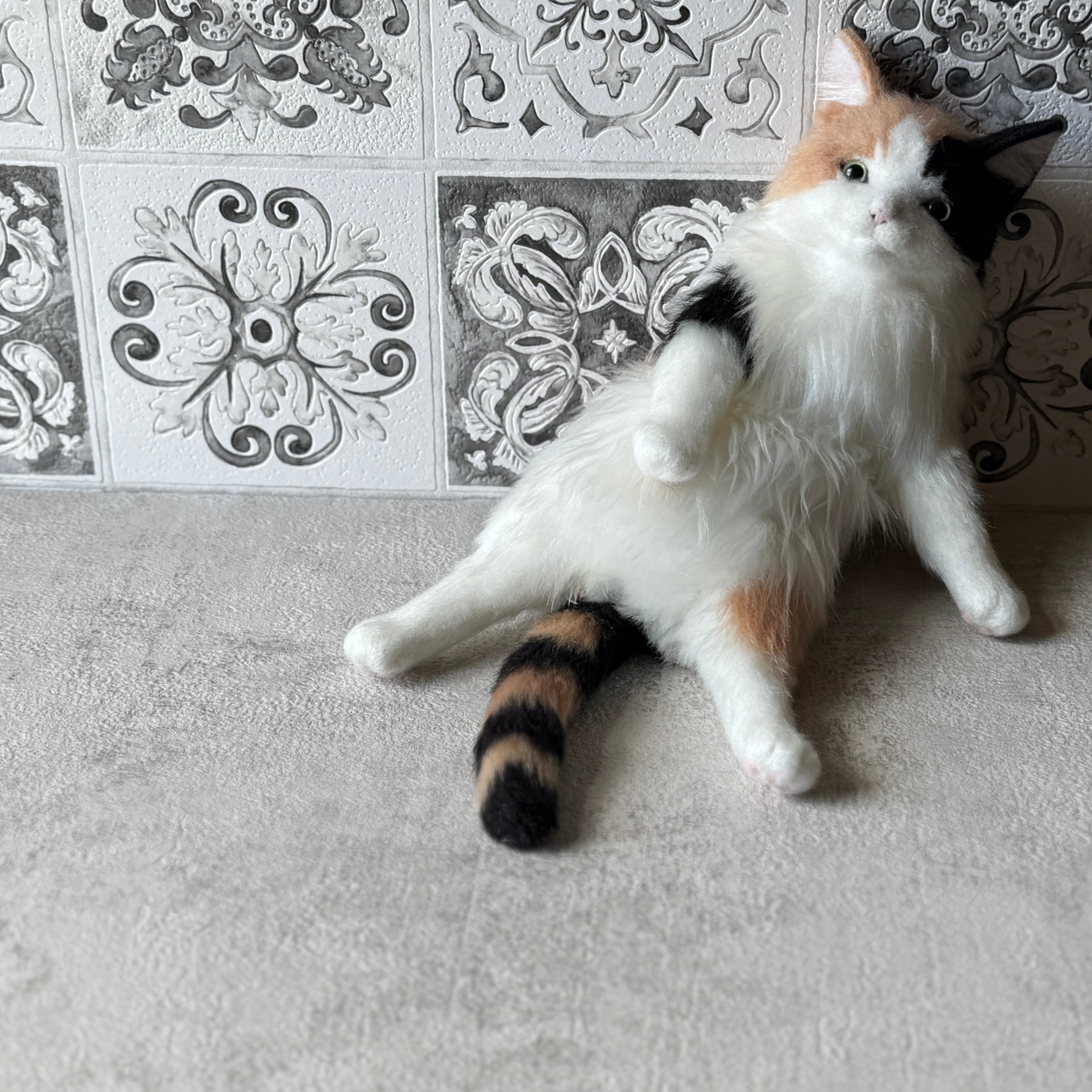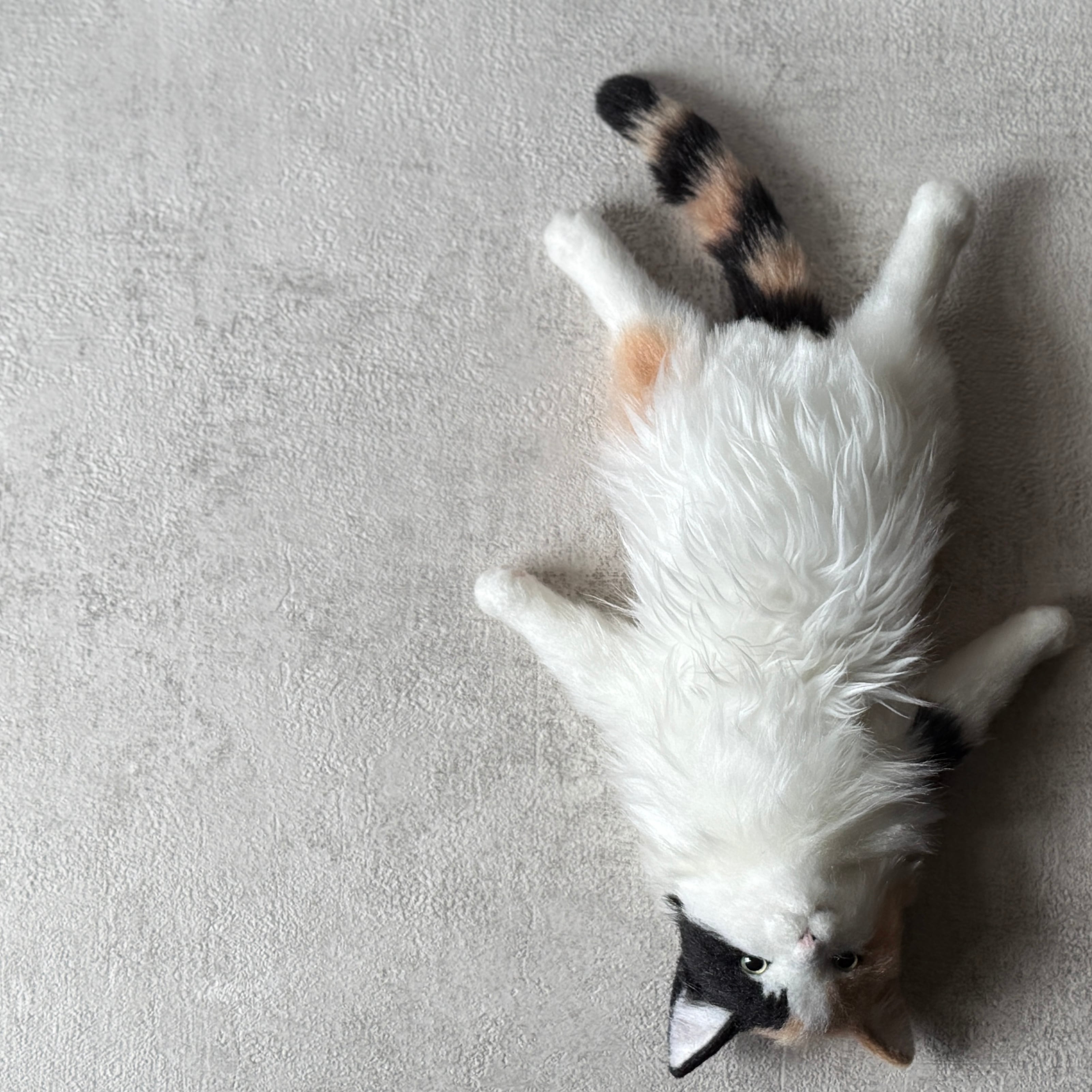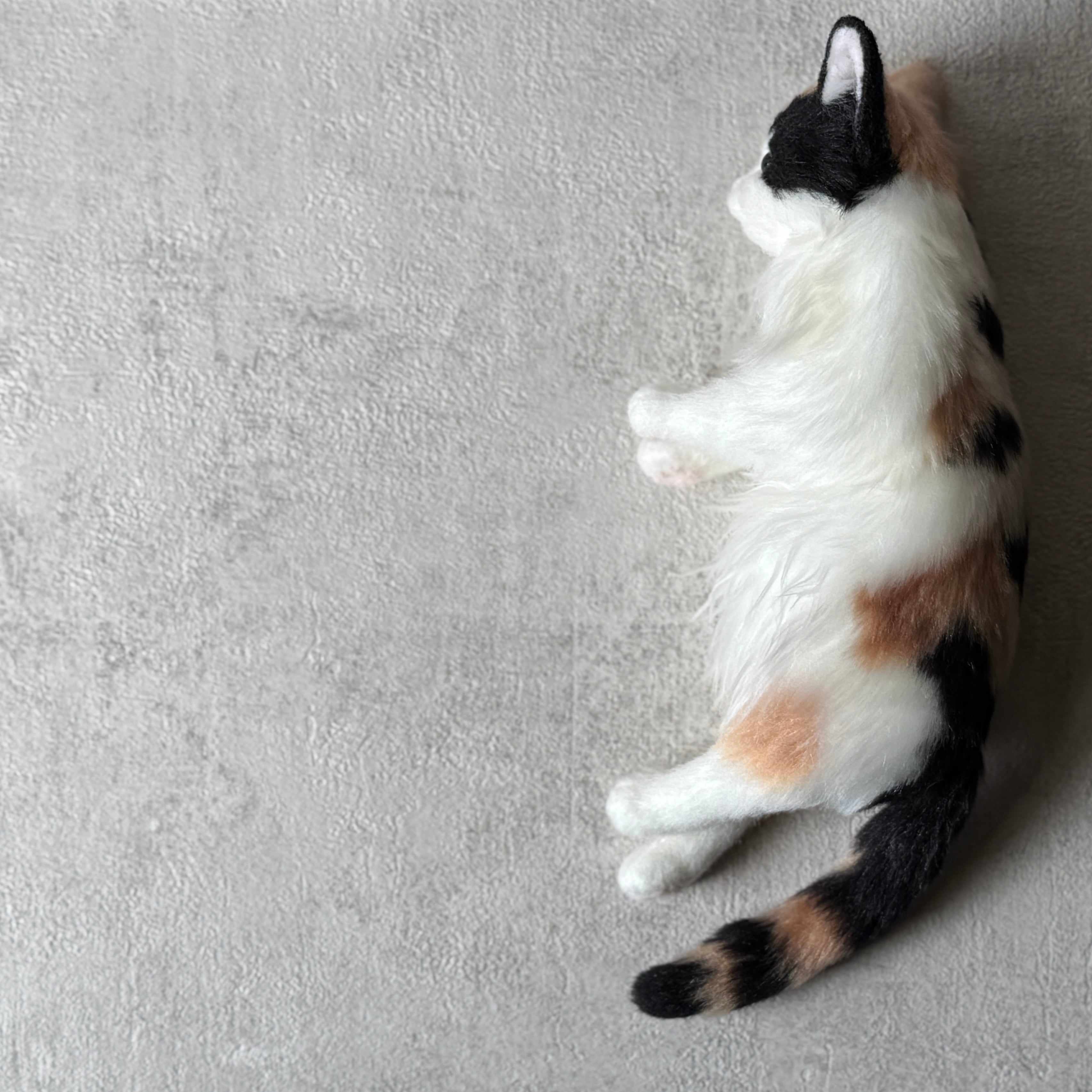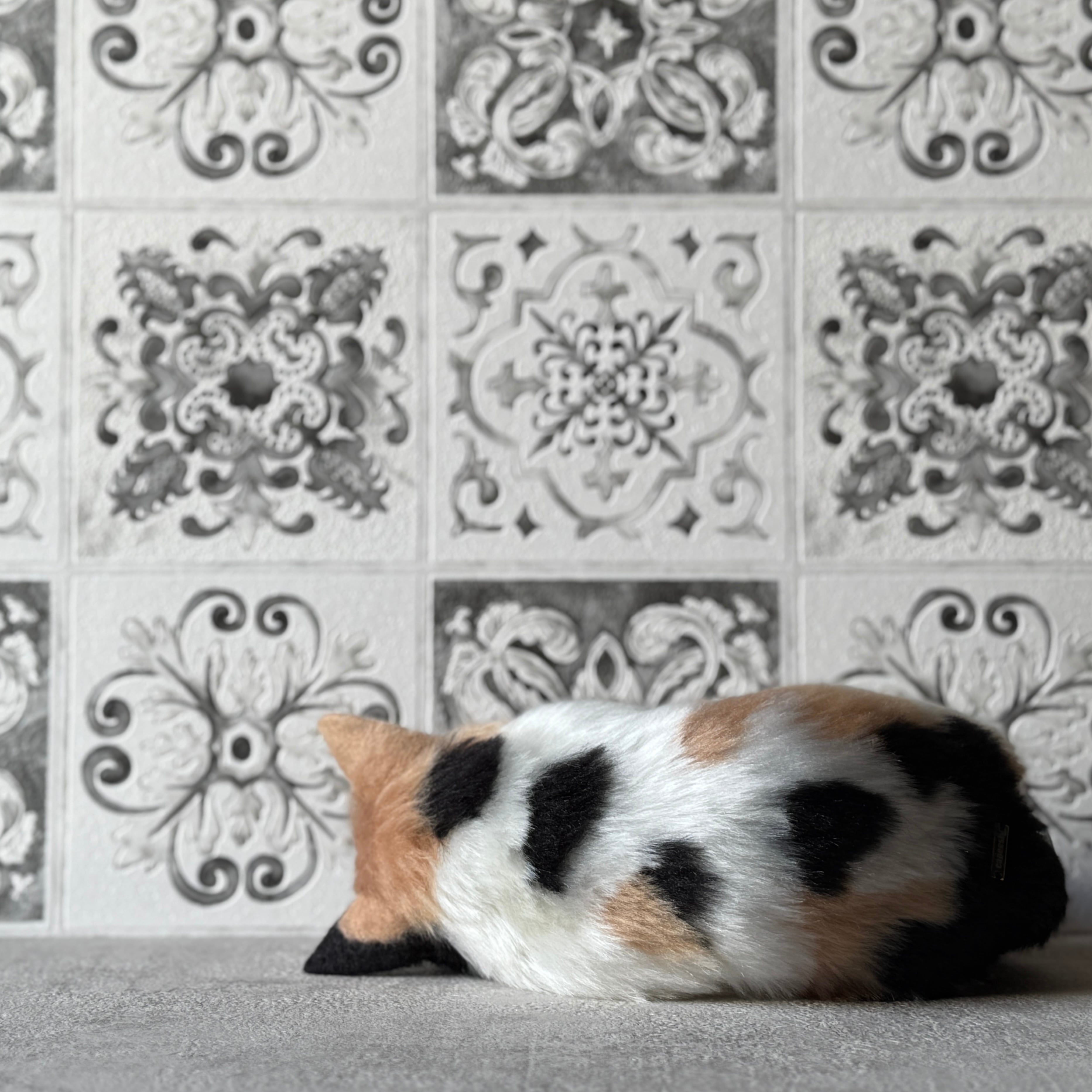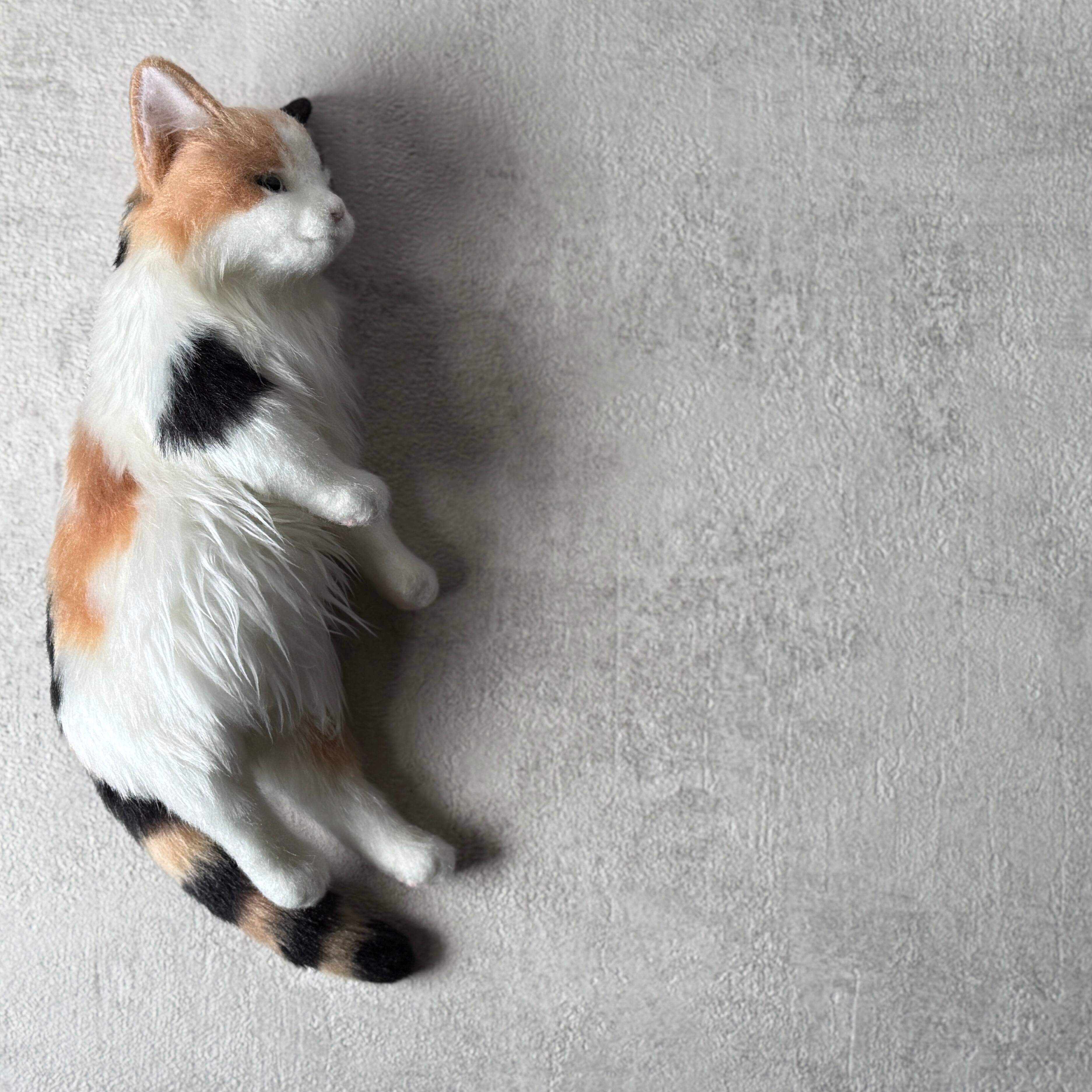 An art-craft plush of a calico cat.With its plump body and satisfying weight, this piece offers a comforting, lifelike presence.Compared to previous works, its limbs are slightly thicker, resulting in a more stable and endearing silhouette.The round, full belly further enhances the impression of gentle warmth, as if life quietly resides within.