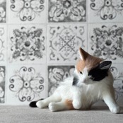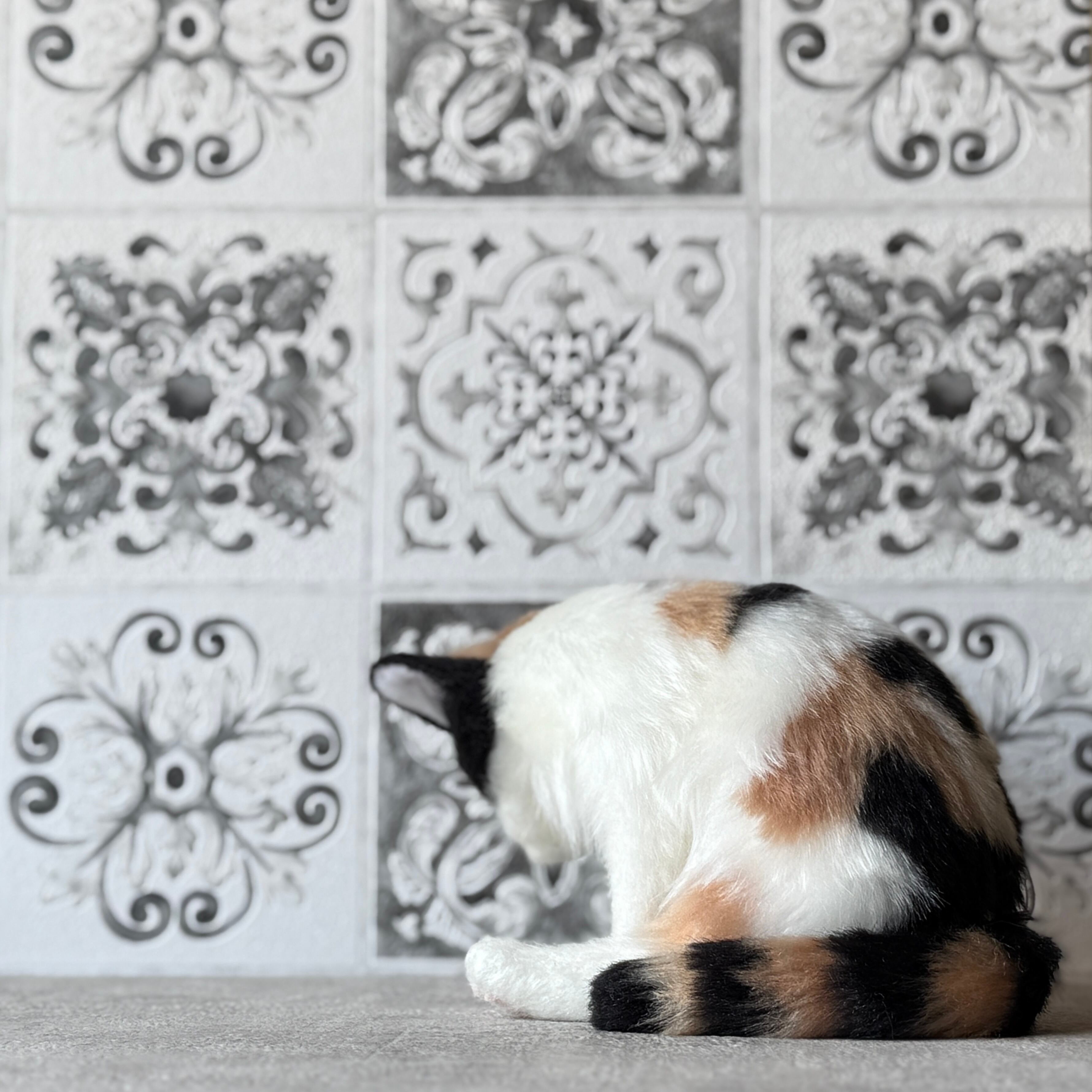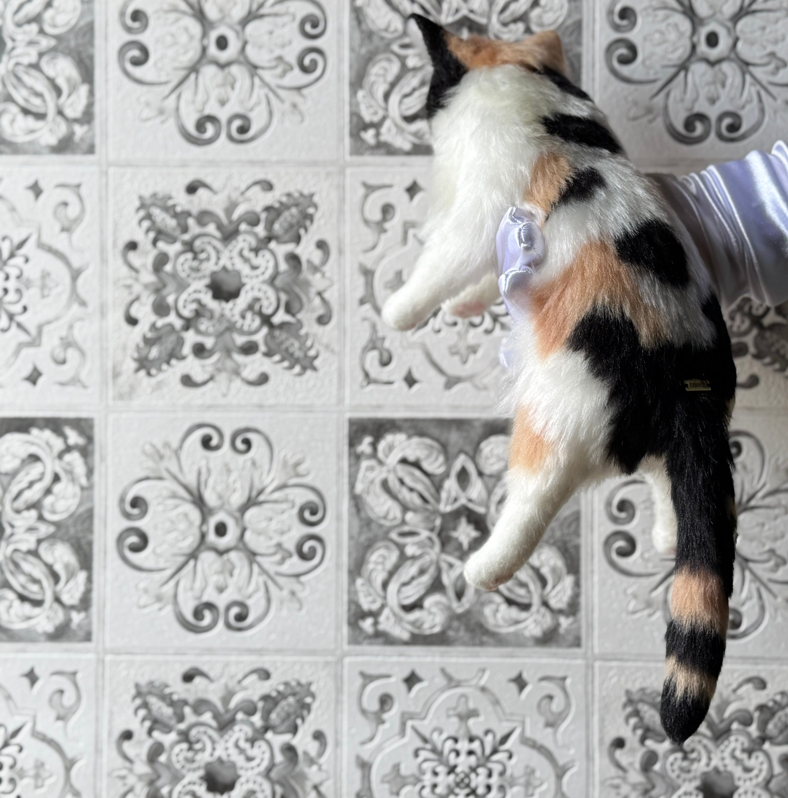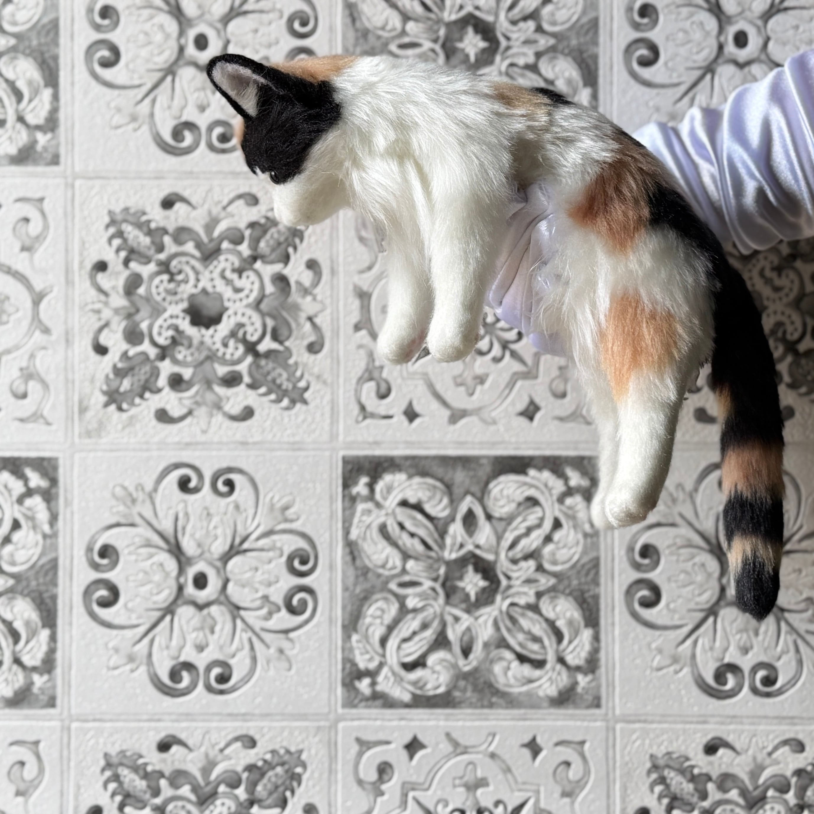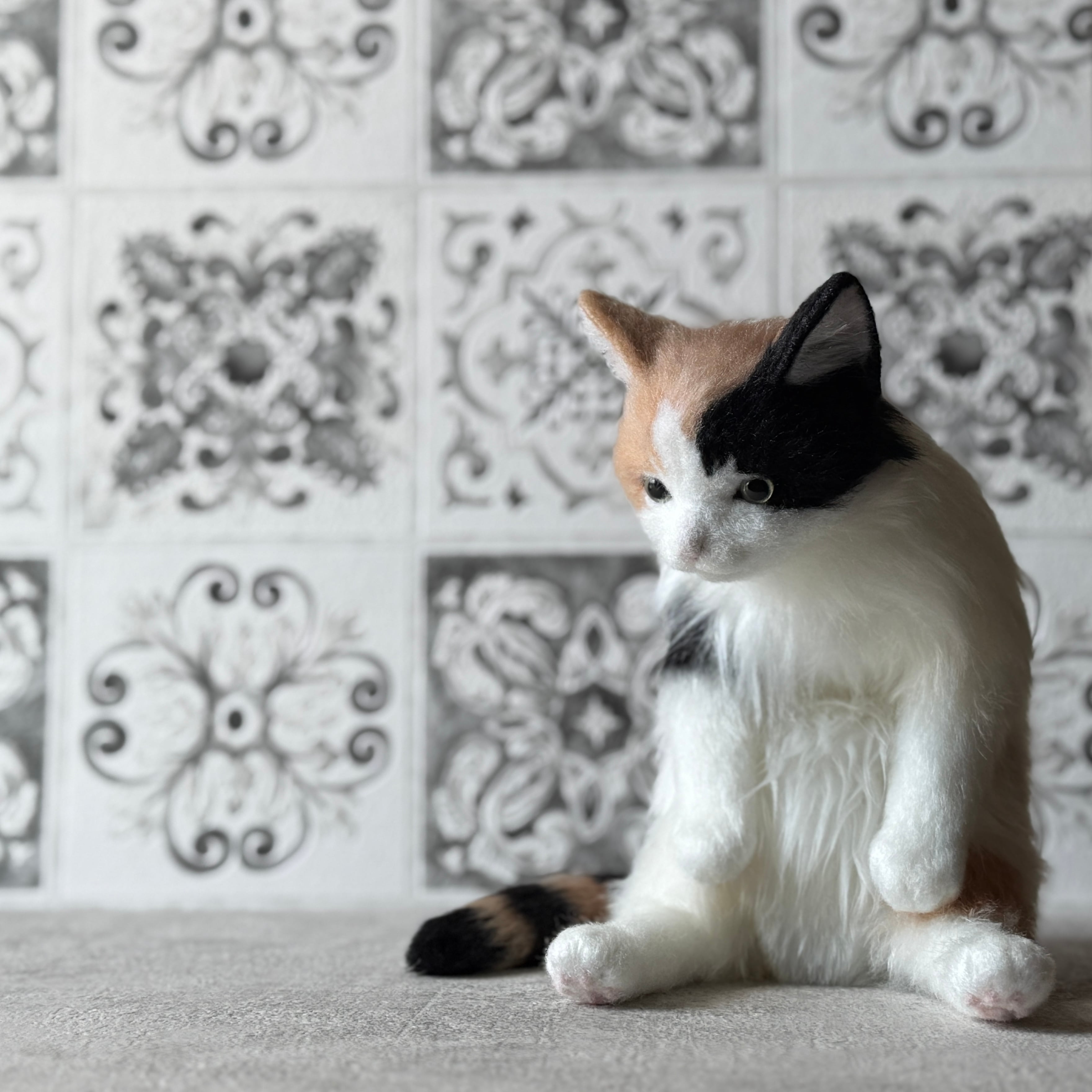 An art-craft plush of a calico cat.With its plump body and satisfying weight, this piece offers a comforting, lifelike presence.Compared to previous works, its limbs are slightly thicker, resulting in a more stable and endearing silhouette.The round, full belly further enhances the impression of gentle warmth, as if life quietly resides within.