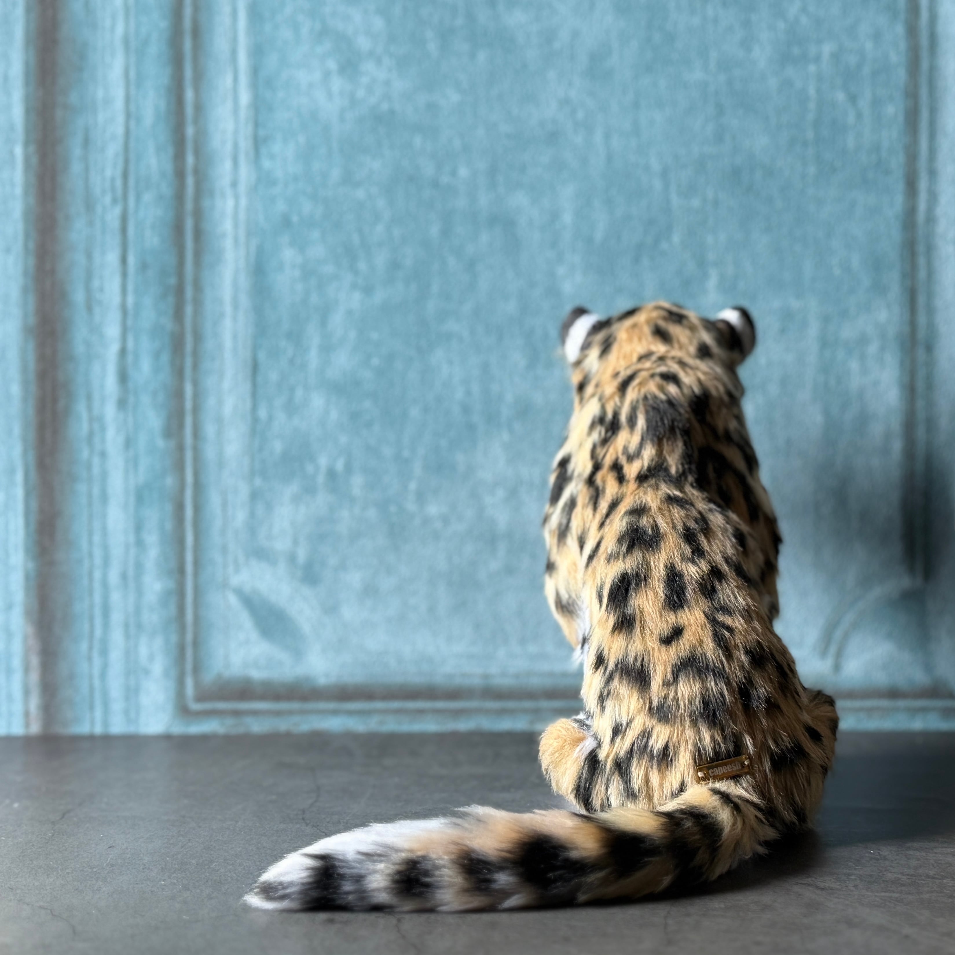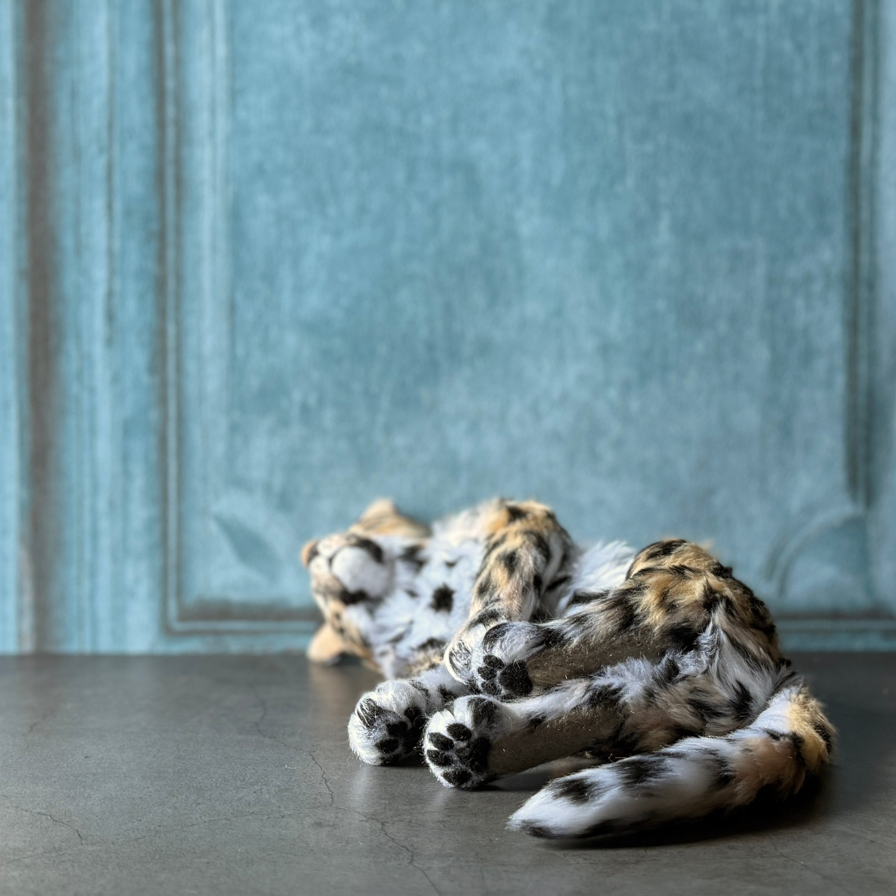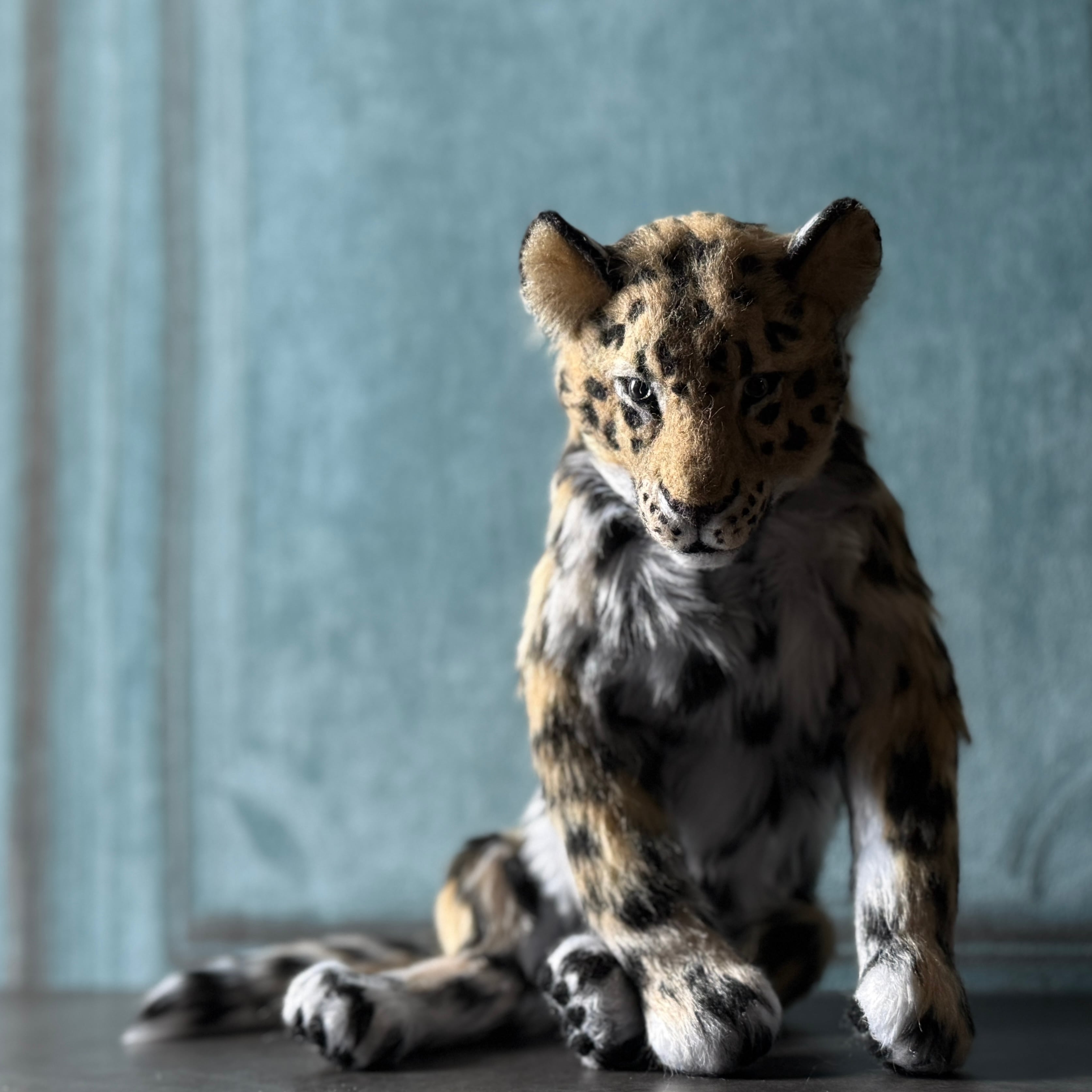 An art plush inspired by the Amur leopard.Its distinctive coat is recreated by sewing together white faux fur with black spots and leopard-print fur.The back features a sculpted form that highlights the trapezius muscles over the shoulder blades—capturing the supple tension and fluid grace unique to feline anatomy.The soft, moist gaze and moderately firm fur convey a mysterious presence, blending wildness with an ethereal allure.