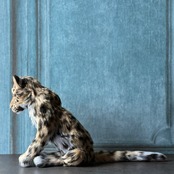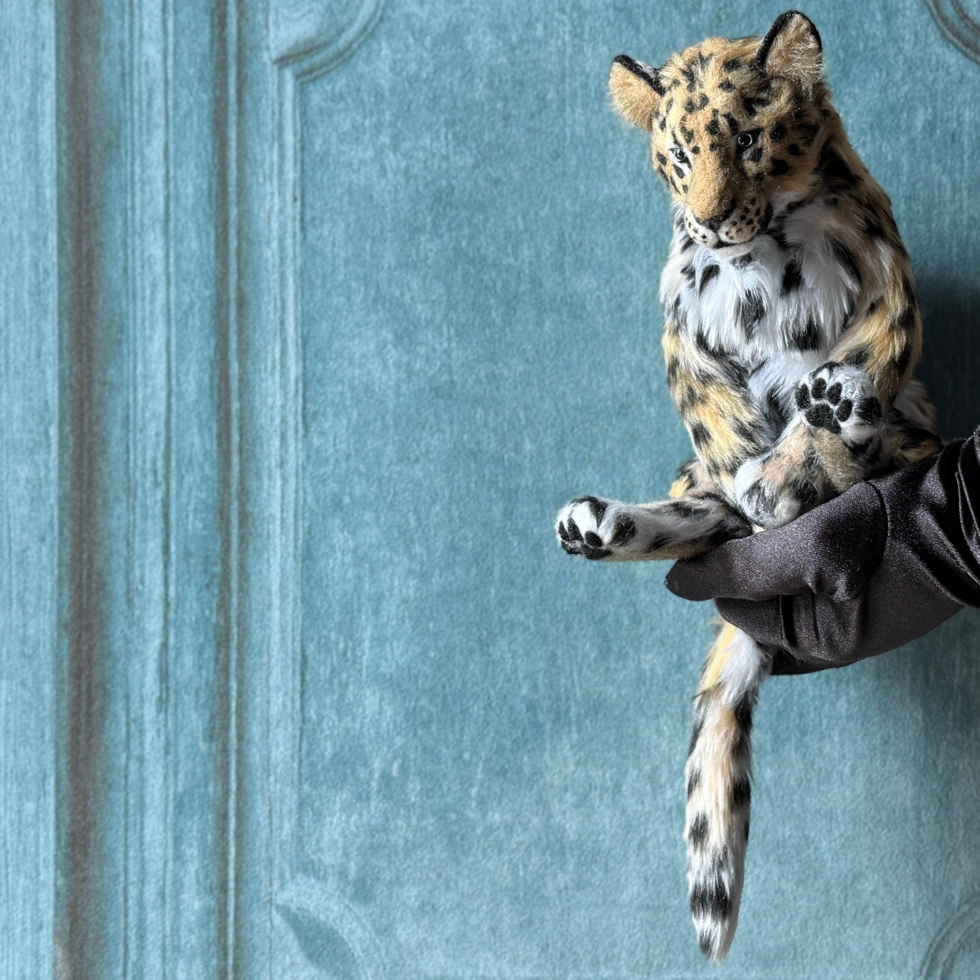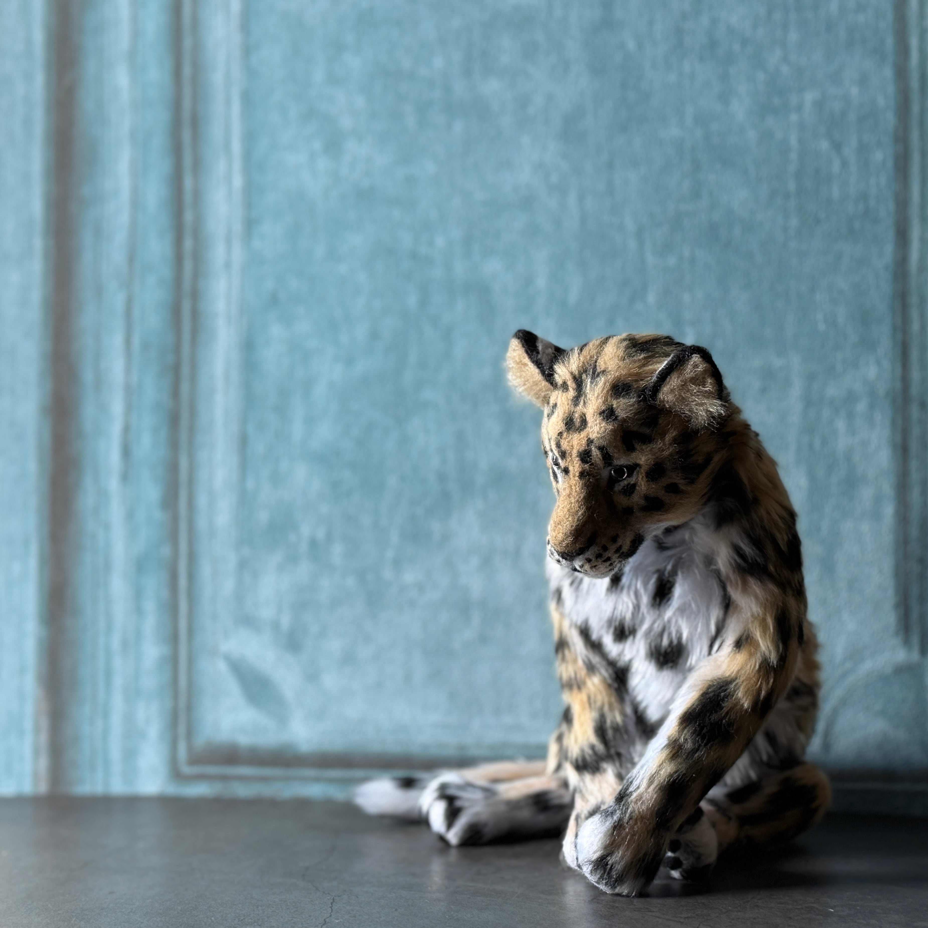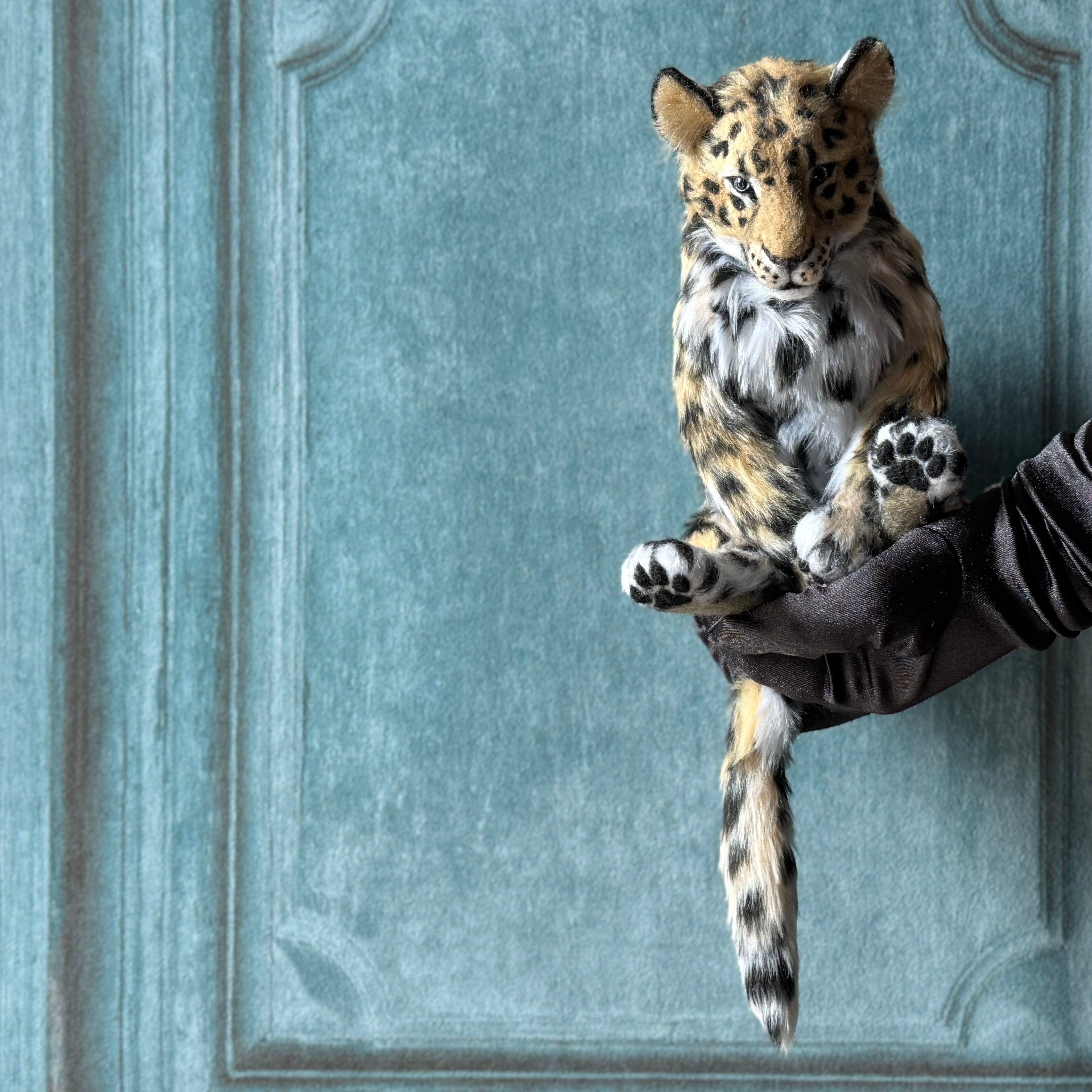 An art plush inspired by the Amur leopard.Its distinctive coat is recreated by sewing together white faux fur with black spots and leopard-print fur.The back features a sculpted form that highlights the trapezius muscles over the shoulder blades—capturing the supple tension and fluid grace unique to feline anatomy.The soft, moist gaze and moderately firm fur convey a mysterious presence, blending wildness with an ethereal allure.