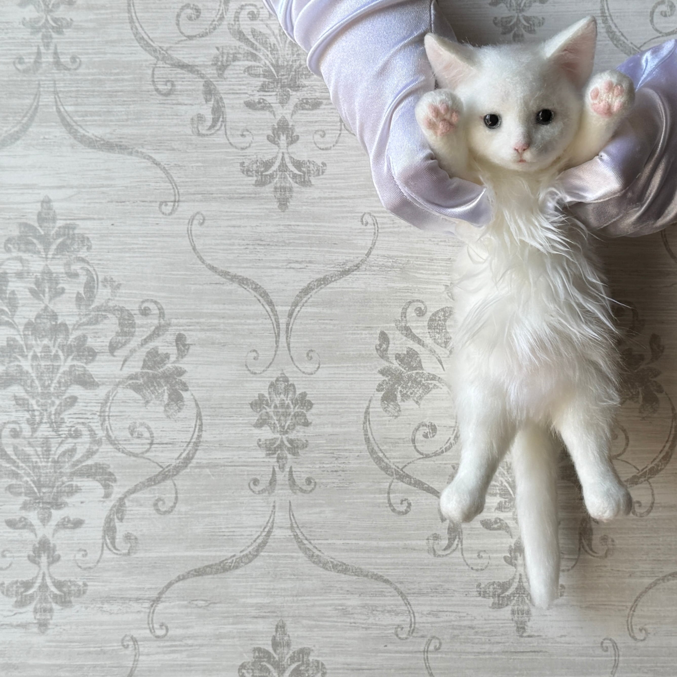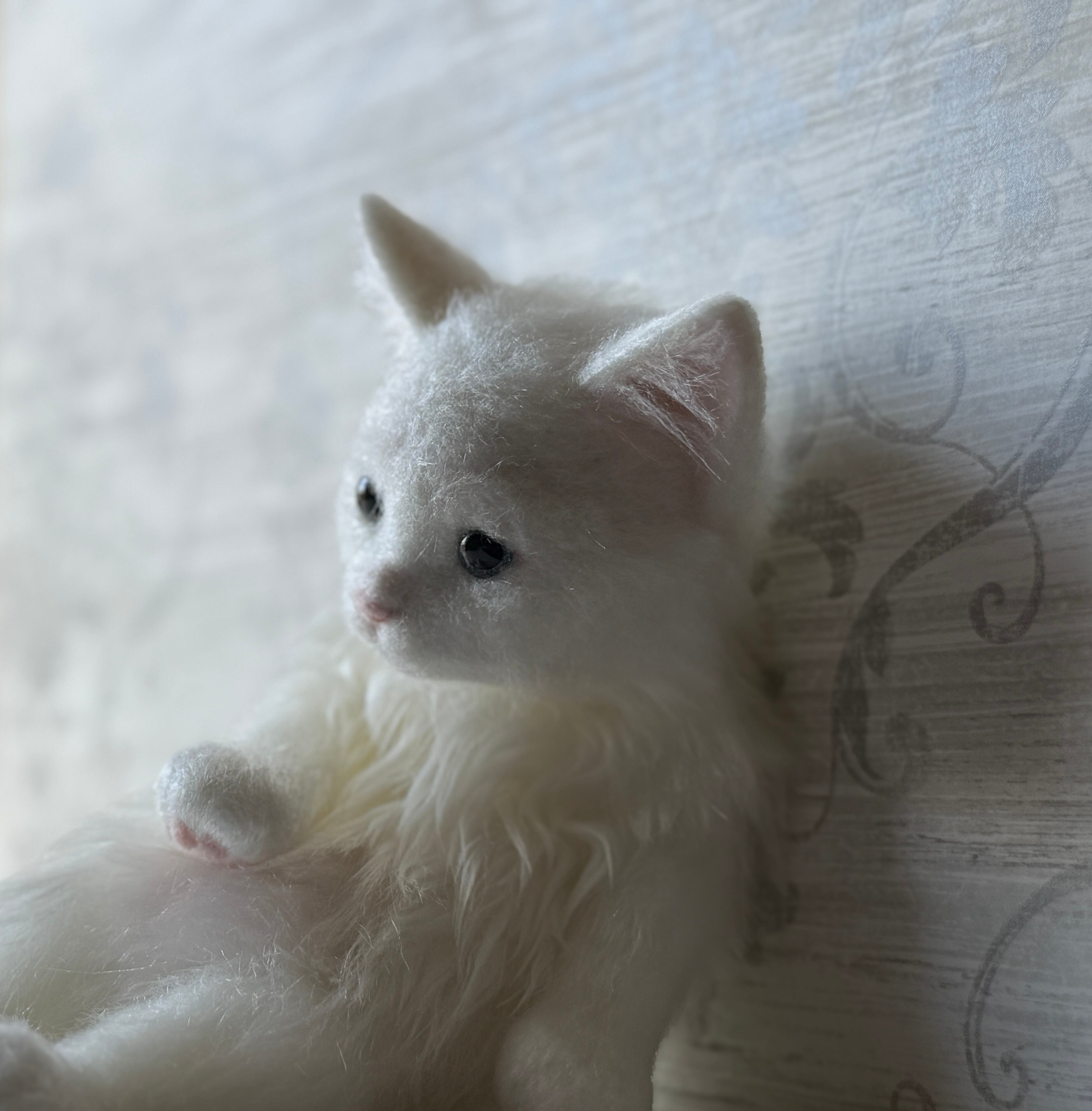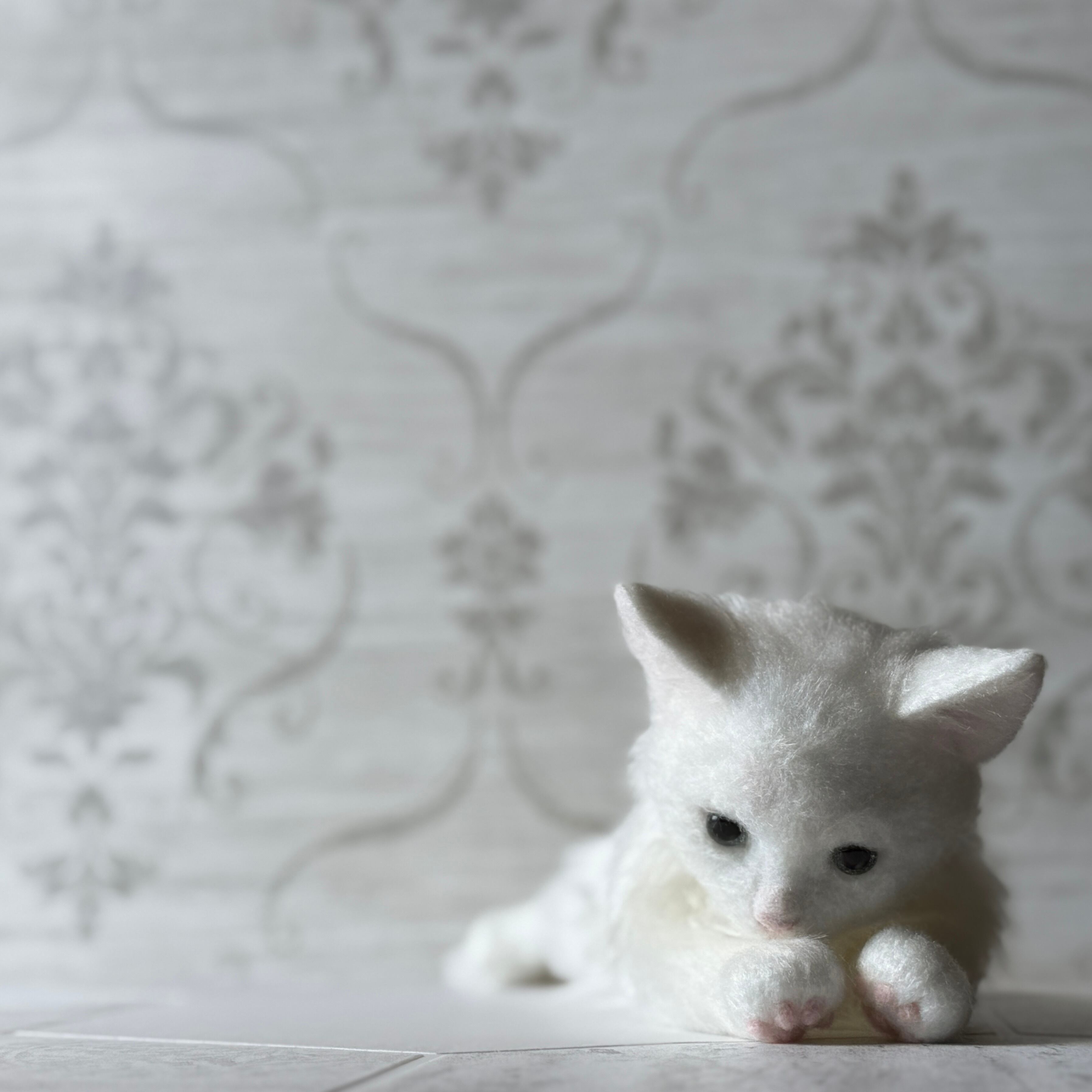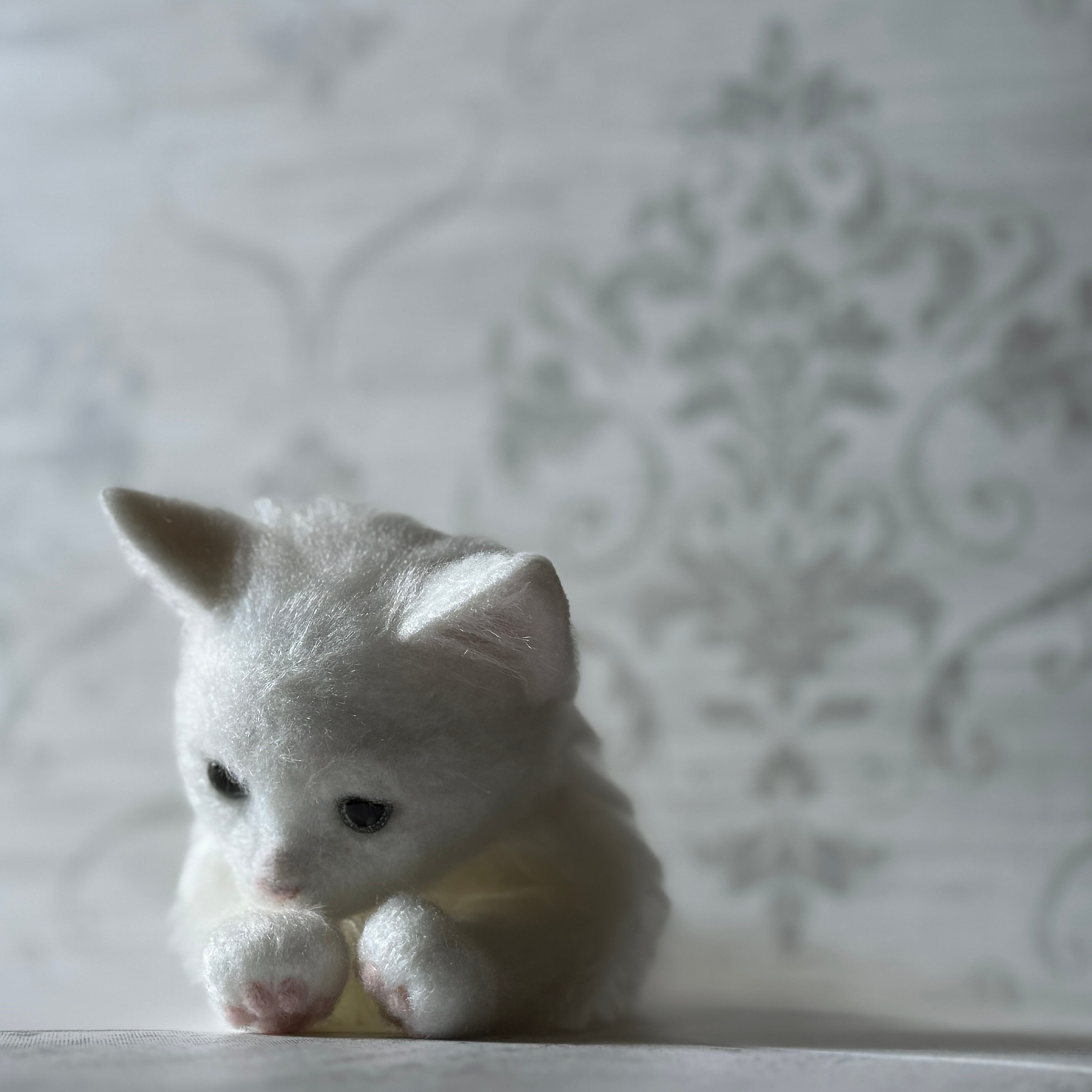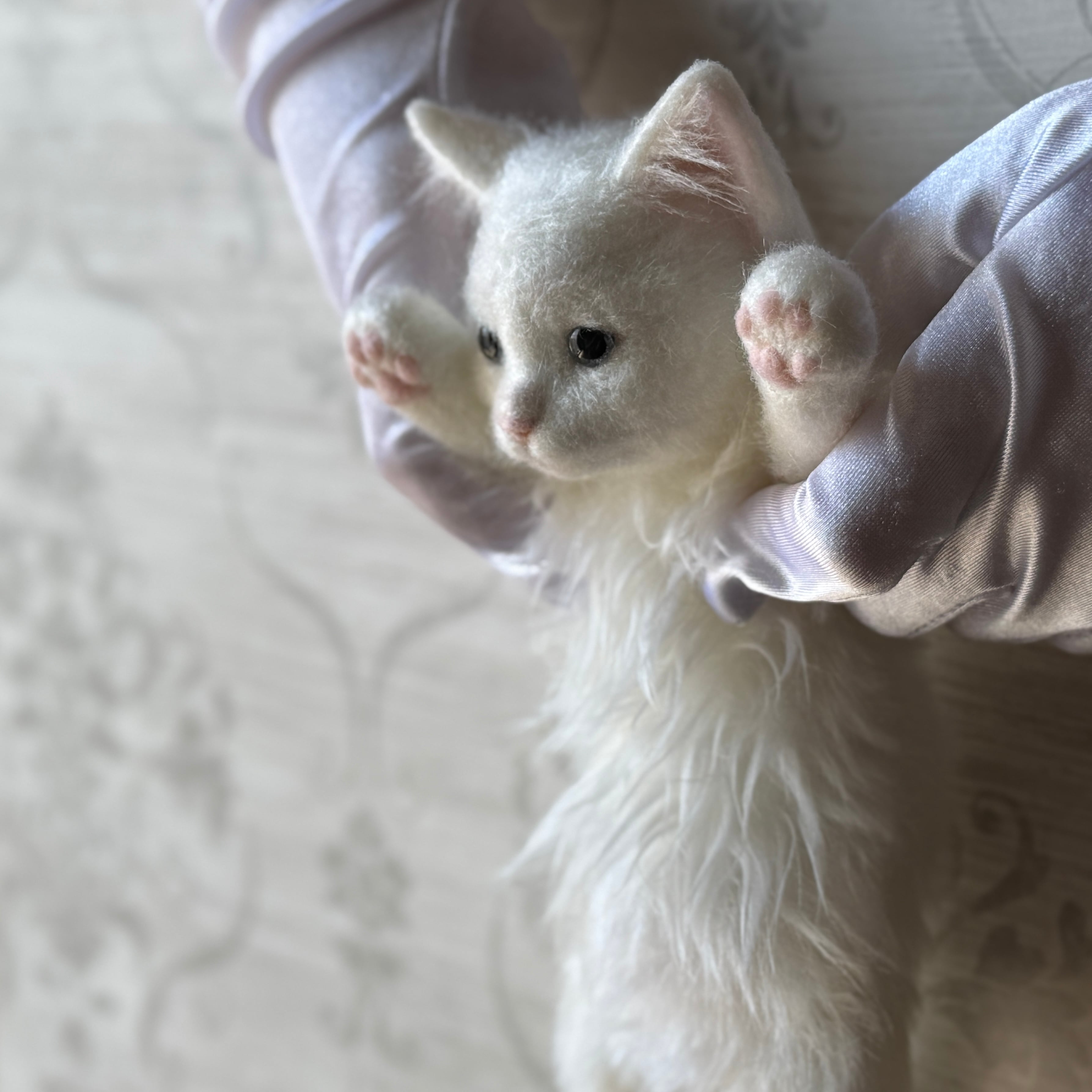 An art-craft plush of a white Japanese kitten, modeled after a one-month-old.The belly fur is backed with hand-dyed pink lining, subtly revealing a rosy hue through the white fur.This is a quintessentially simple, “less-is-more” kitten, with its pure white coat and a soft pink tint on the face and belly suggesting a healthy complexion.Its kitten-blue eyes are especially captivating.