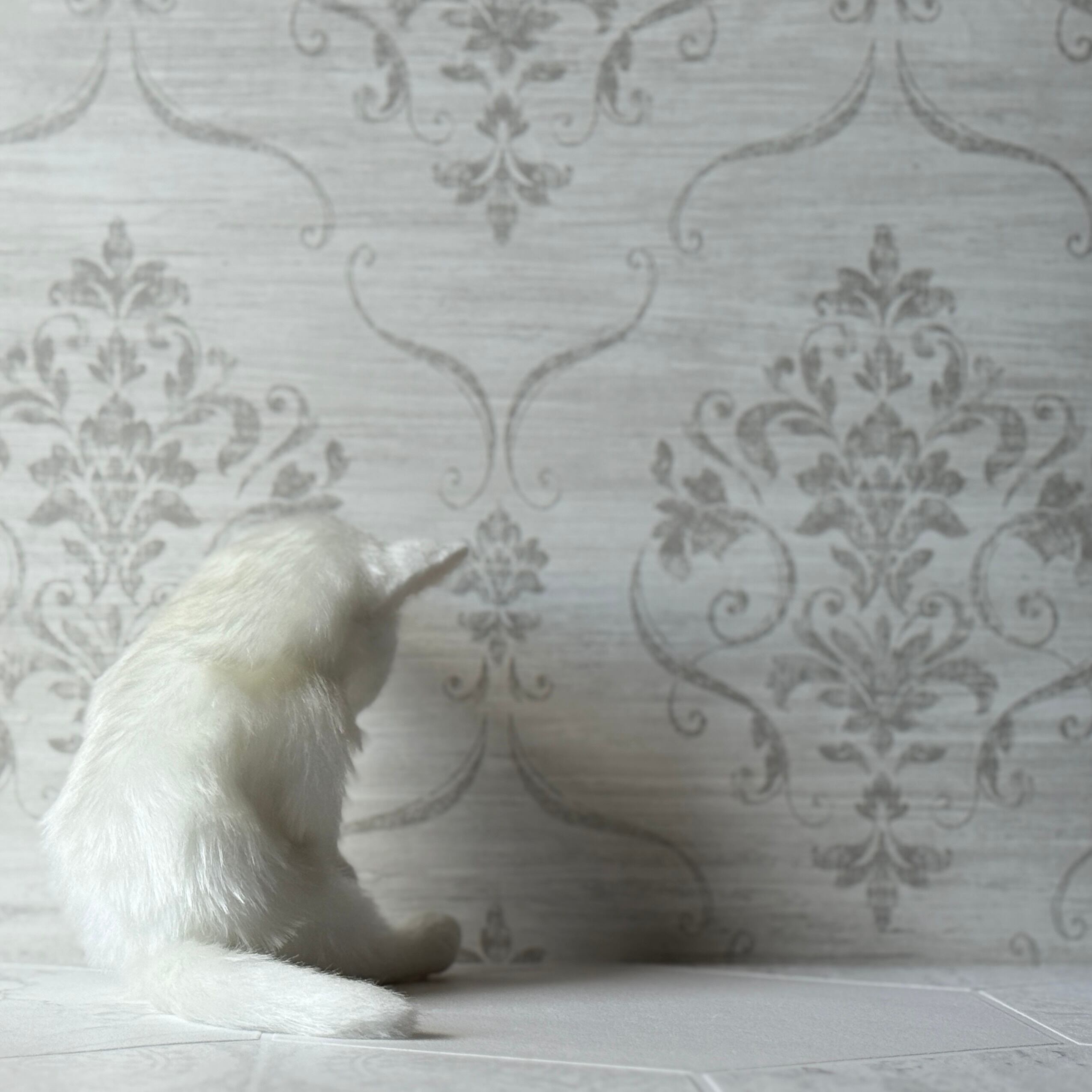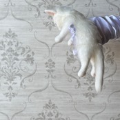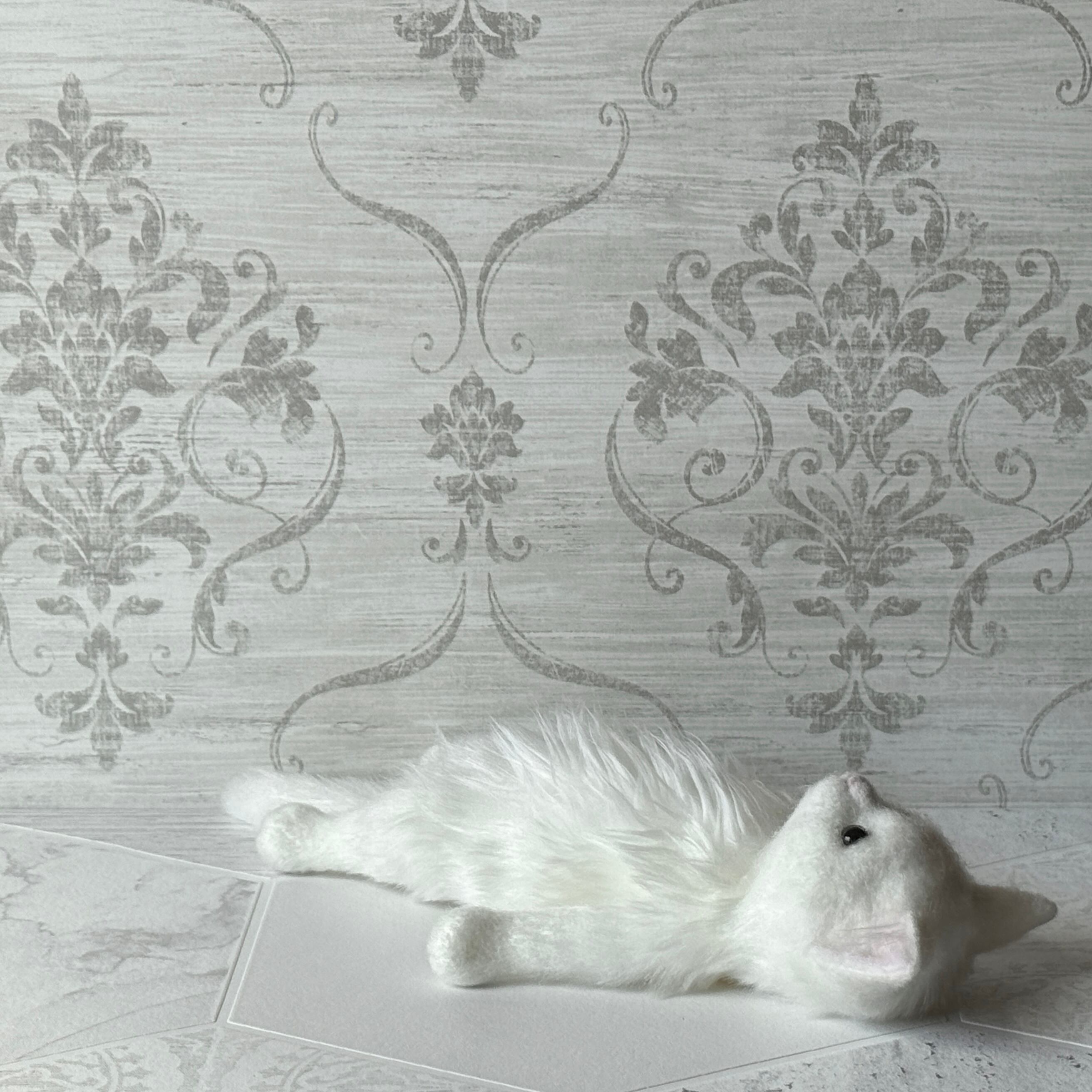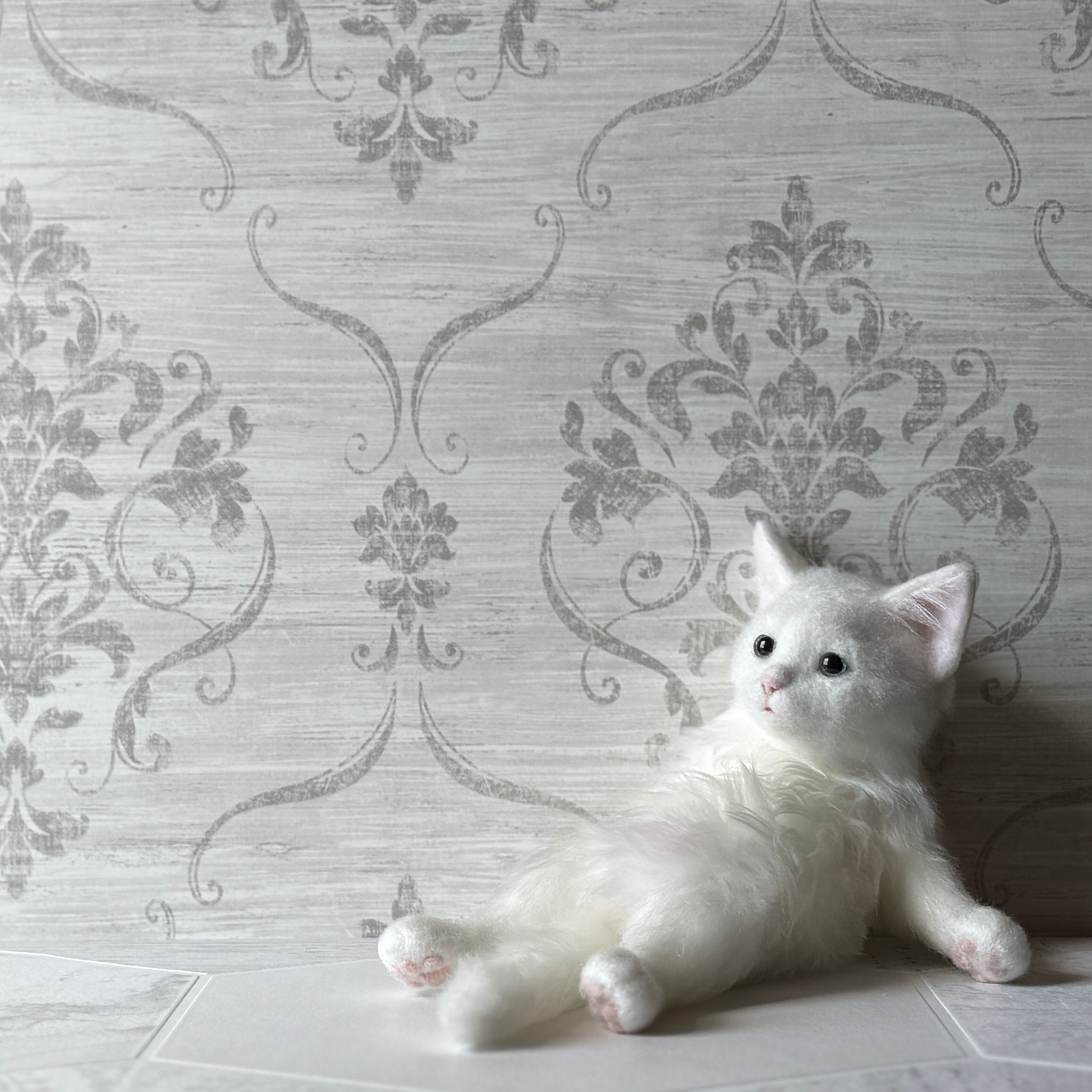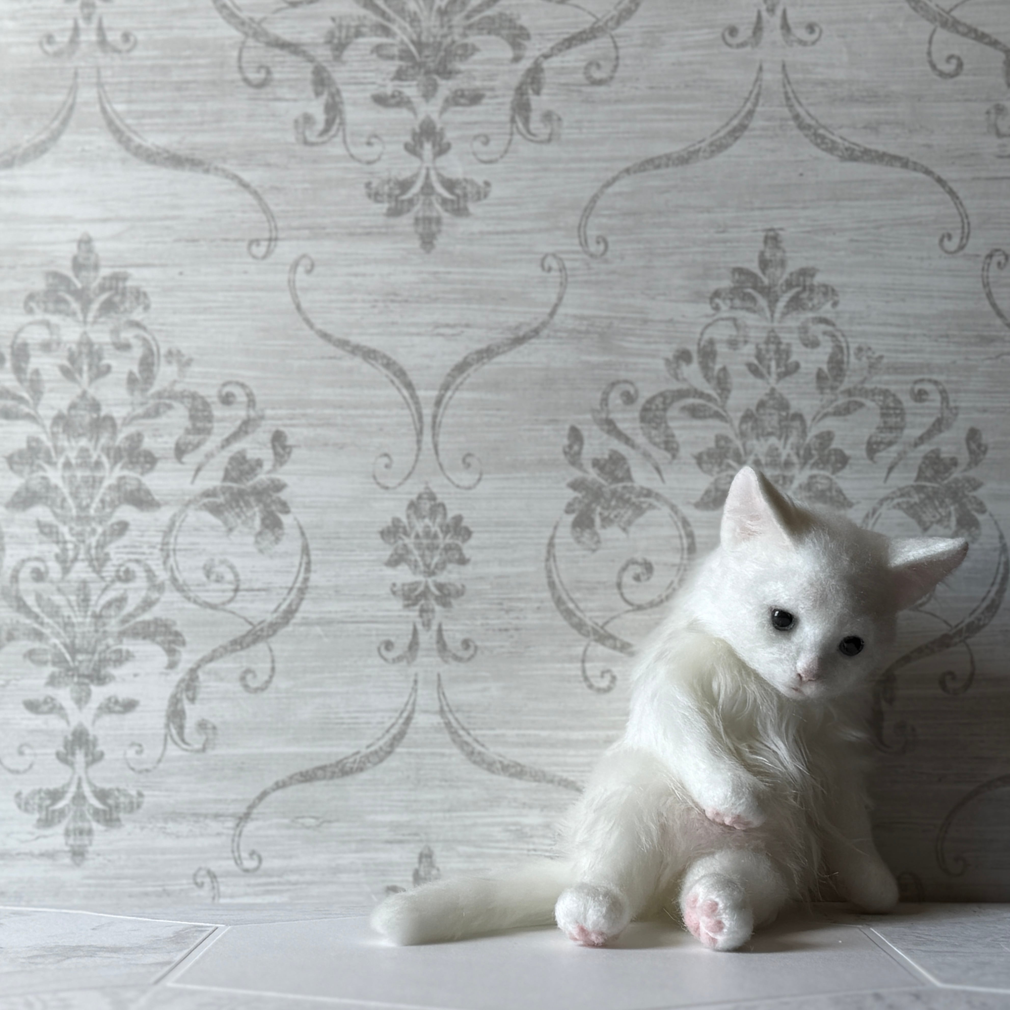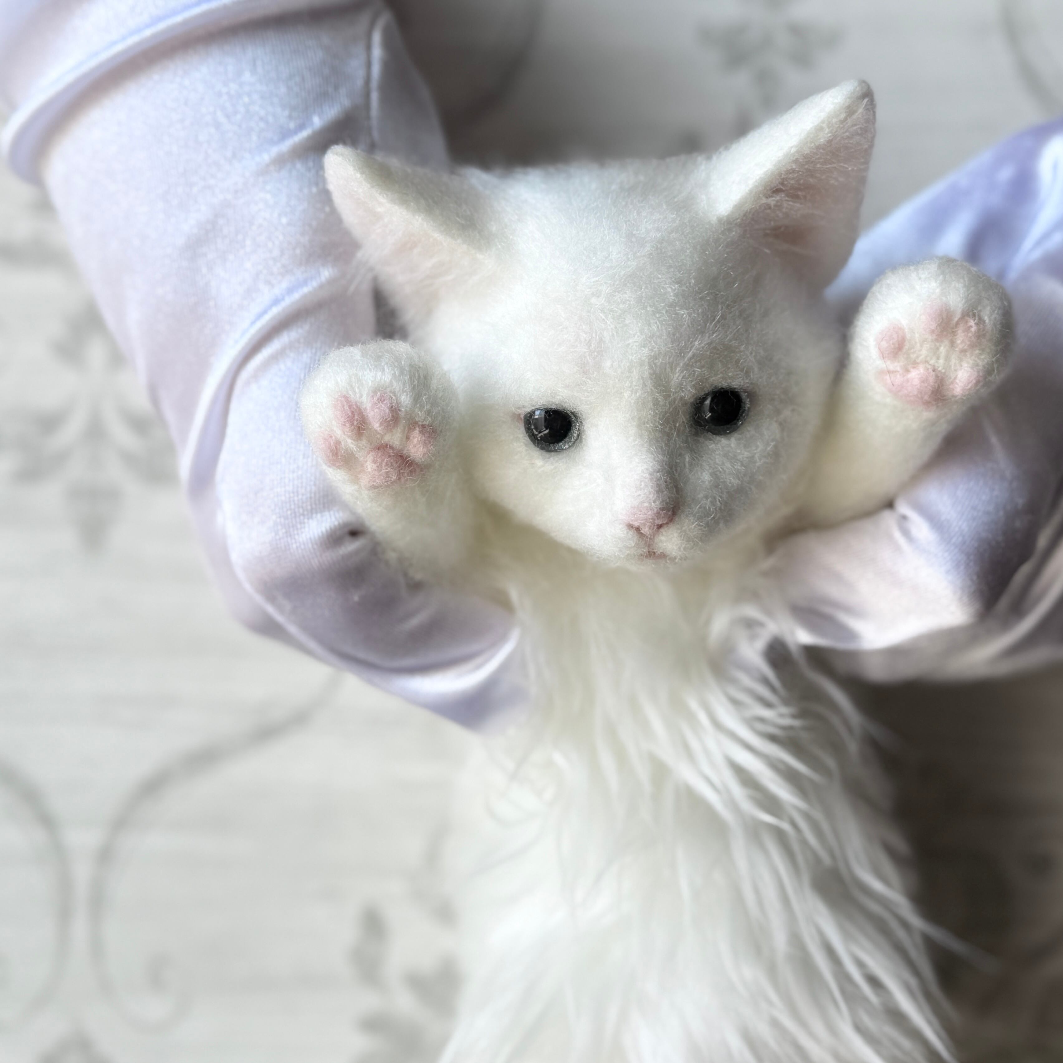 An art-craft plush of a white Japanese kitten, modeled after a one-month-old.The belly fur is backed with hand-dyed pink lining, subtly revealing a rosy hue through the white fur.This is a quintessentially simple, “less-is-more” kitten, with its pure white coat and a soft pink tint on the face and belly suggesting a healthy complexion.Its kitten-blue eyes are especially captivating.