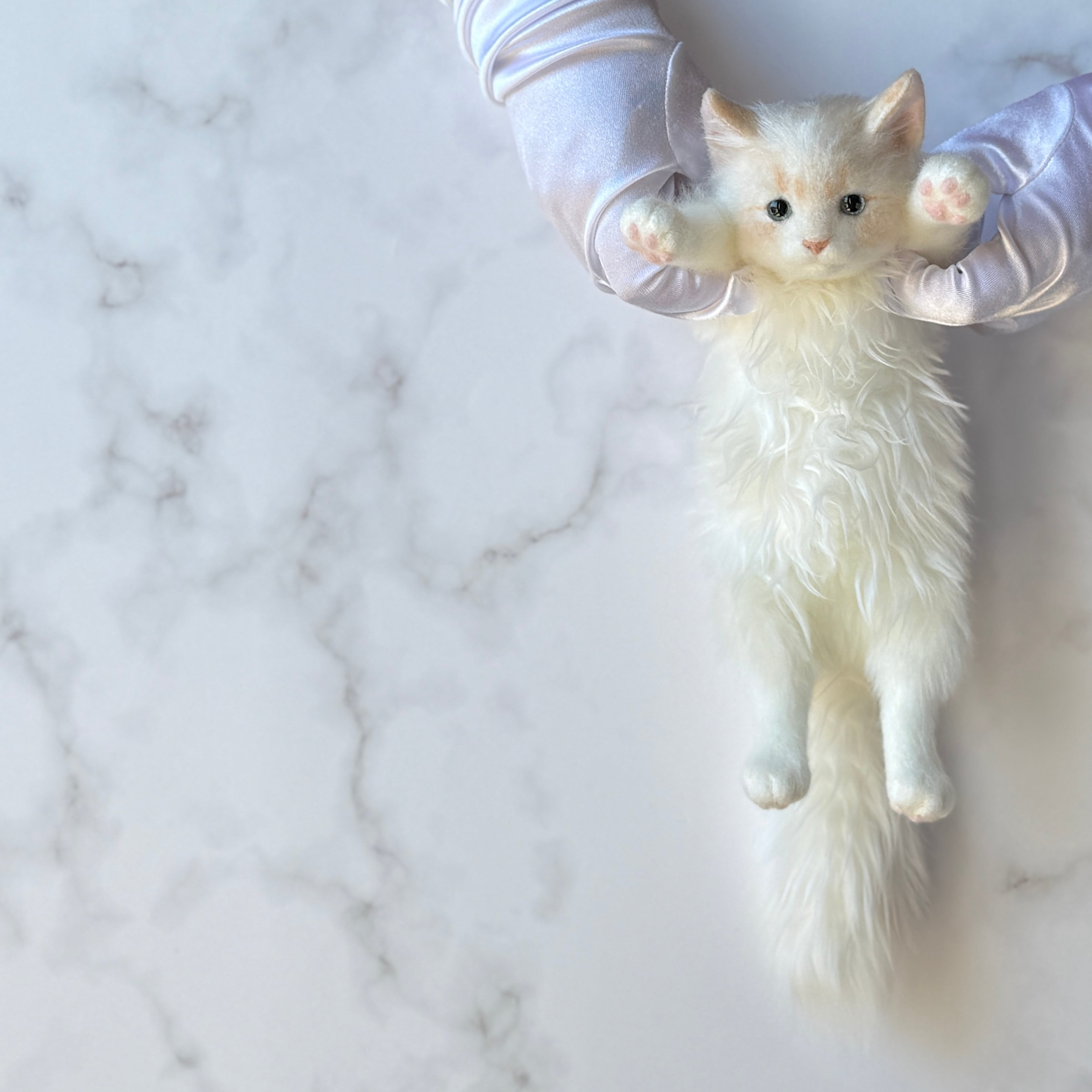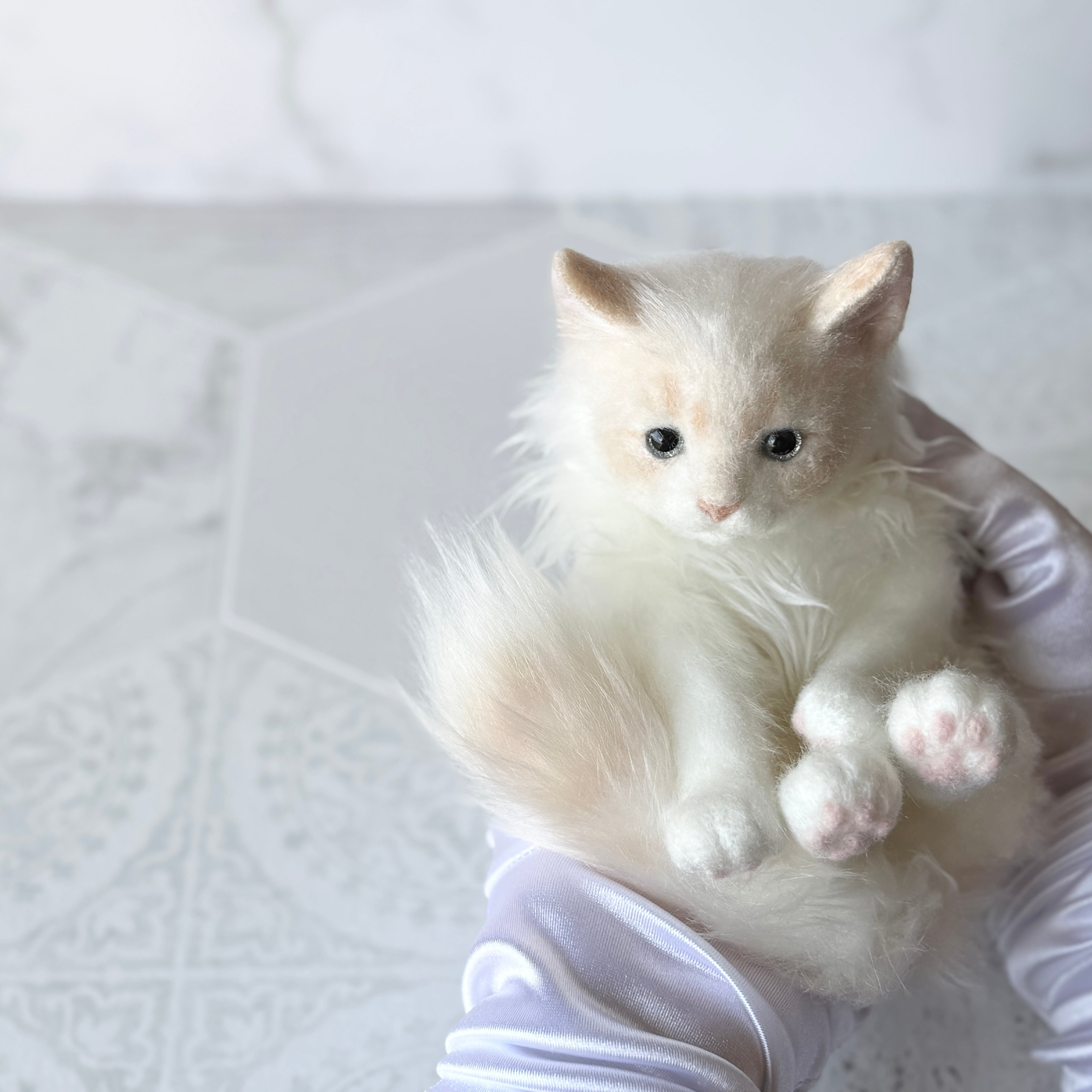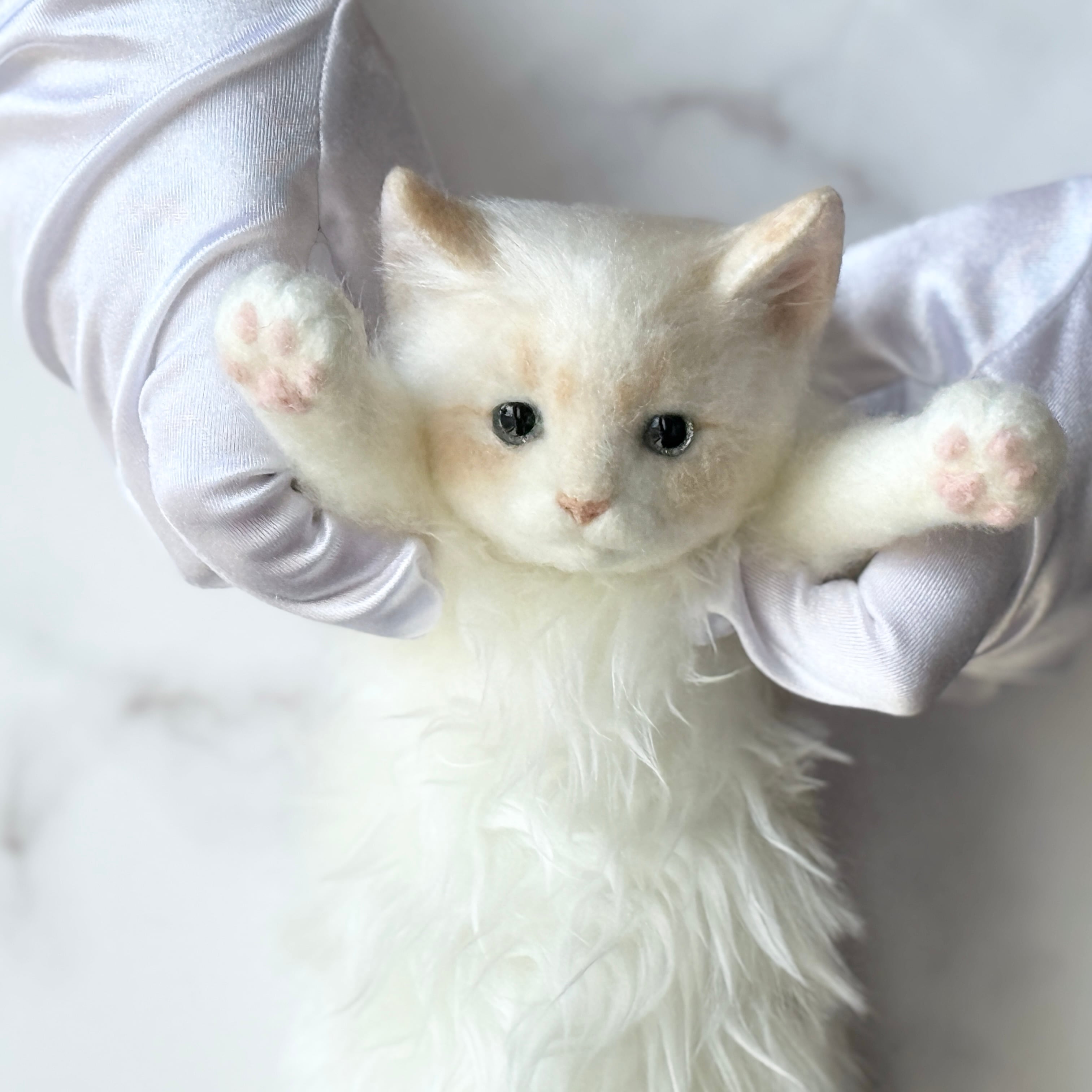 - Blue acrylic eyes and pink needle-felted paw pads