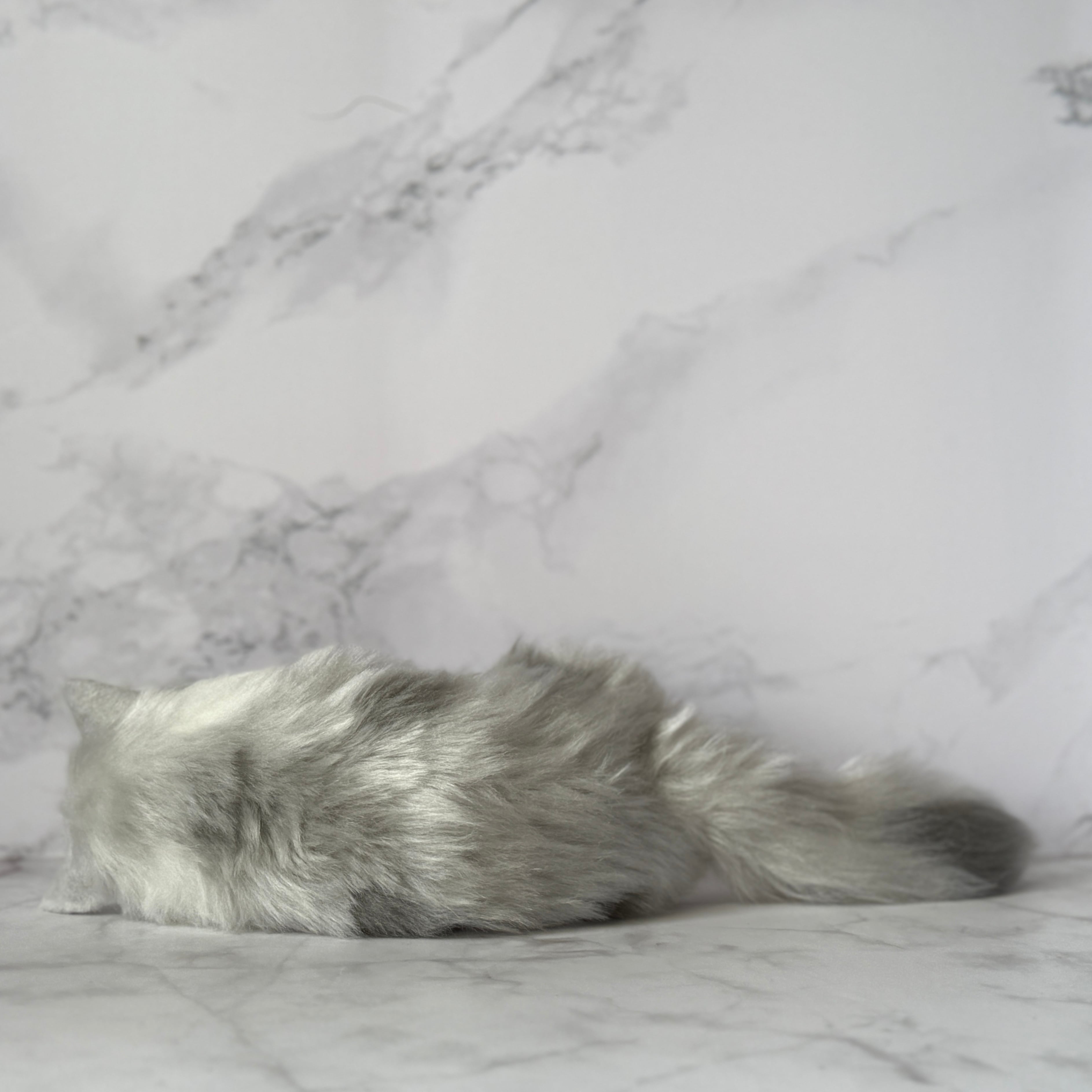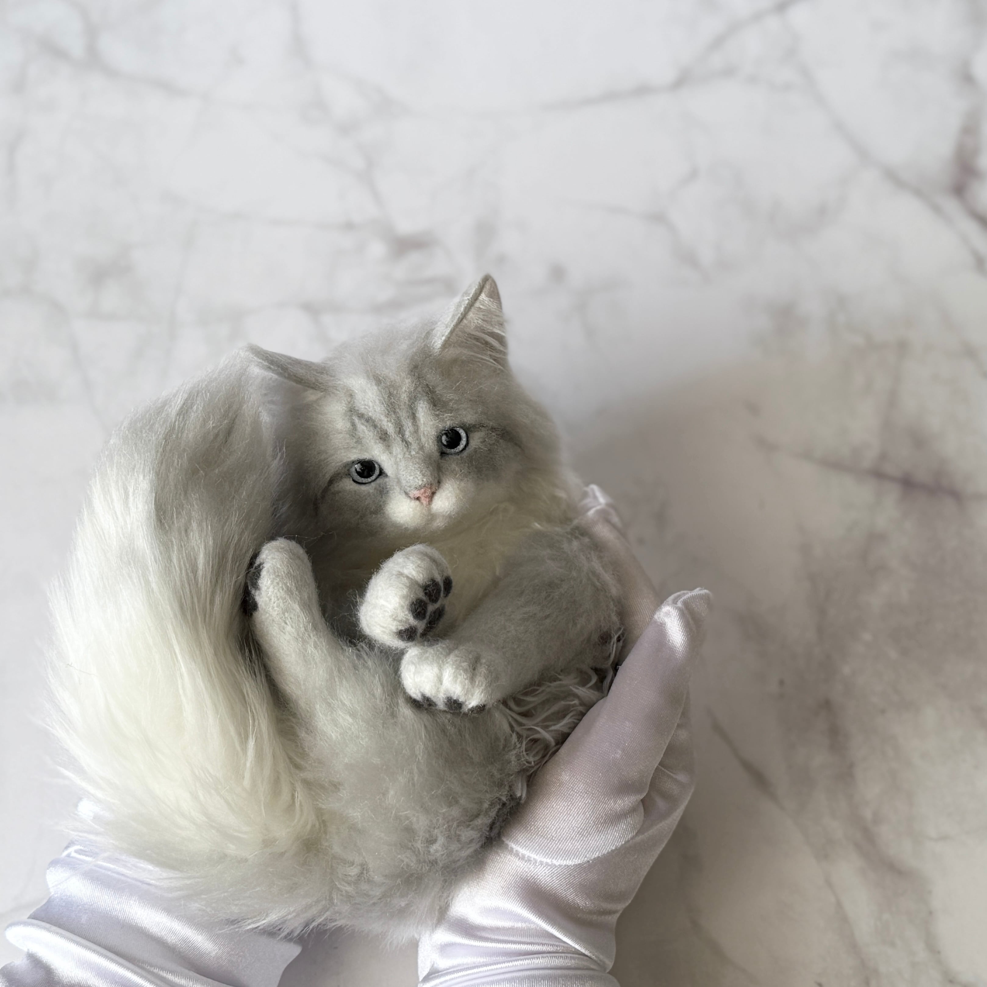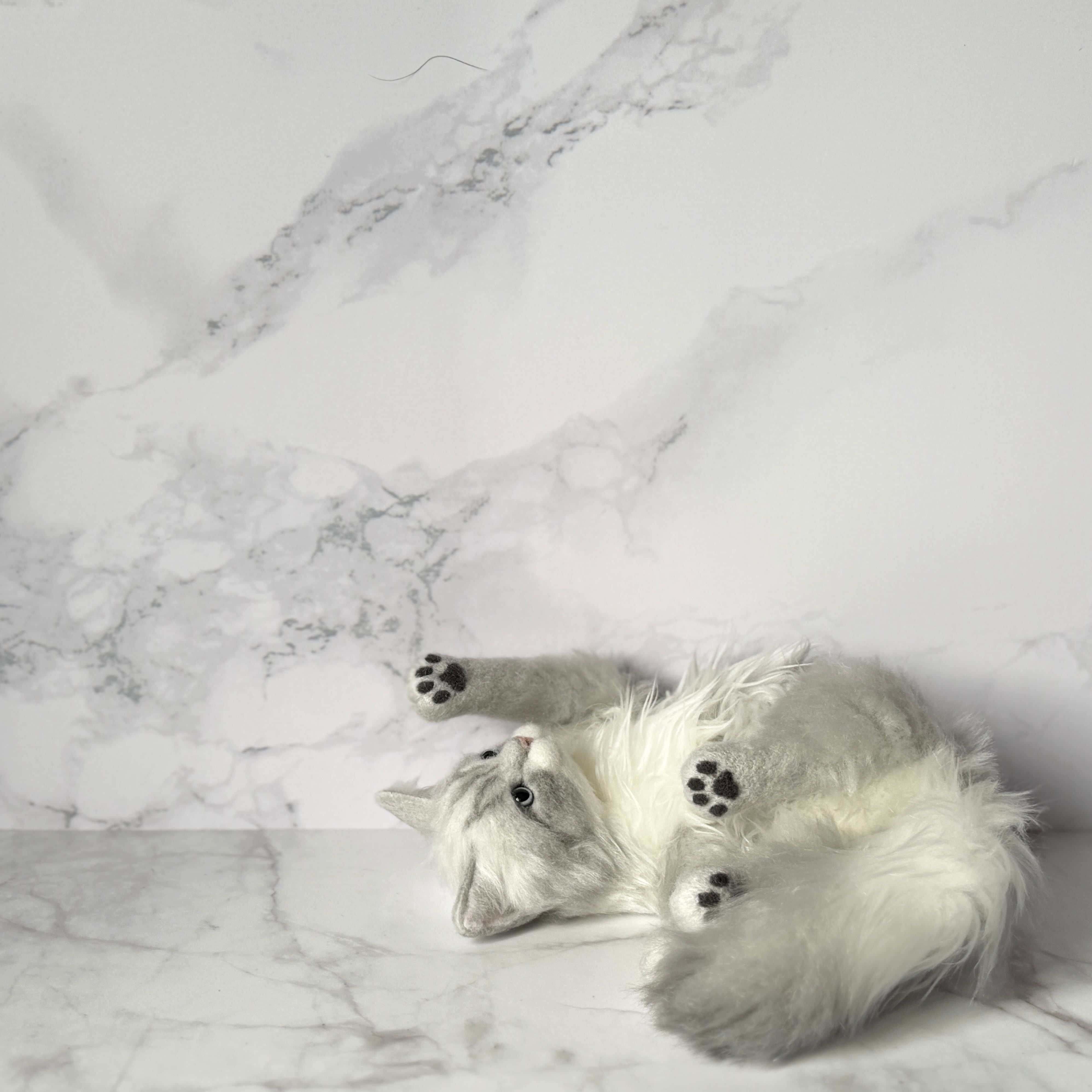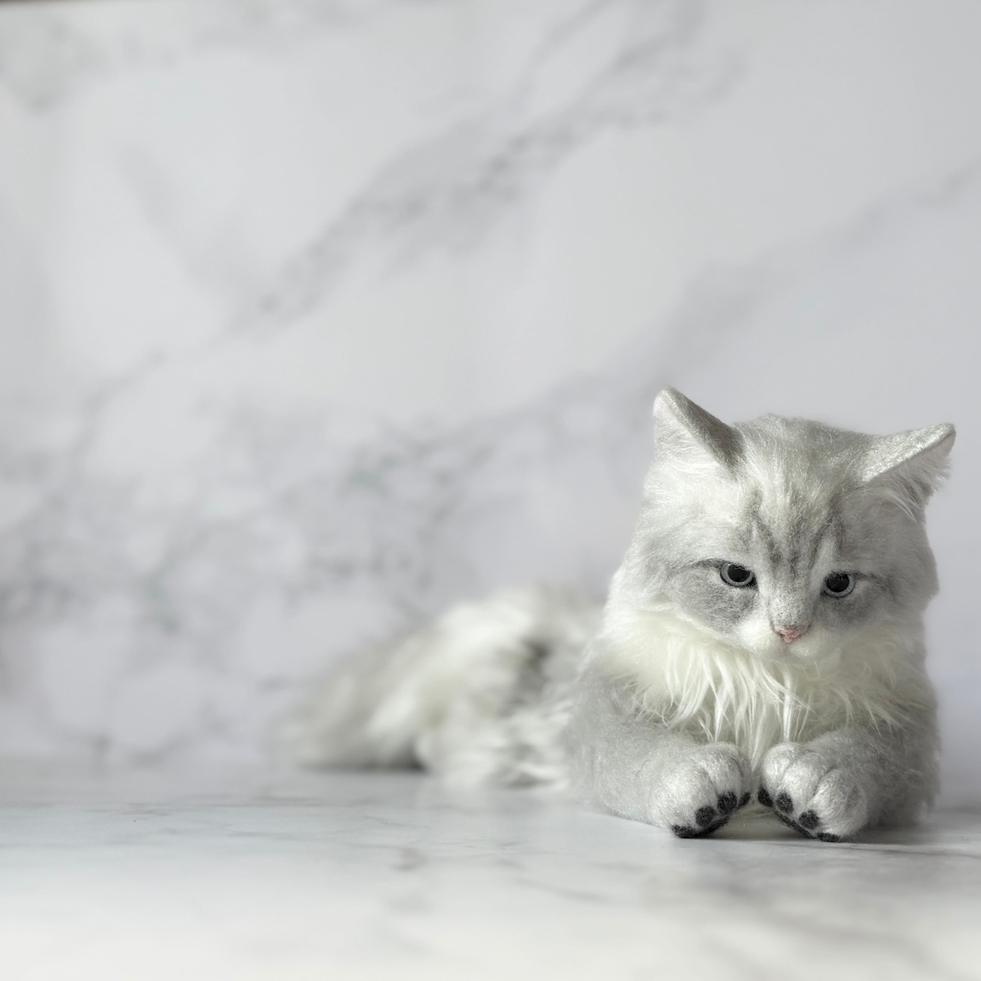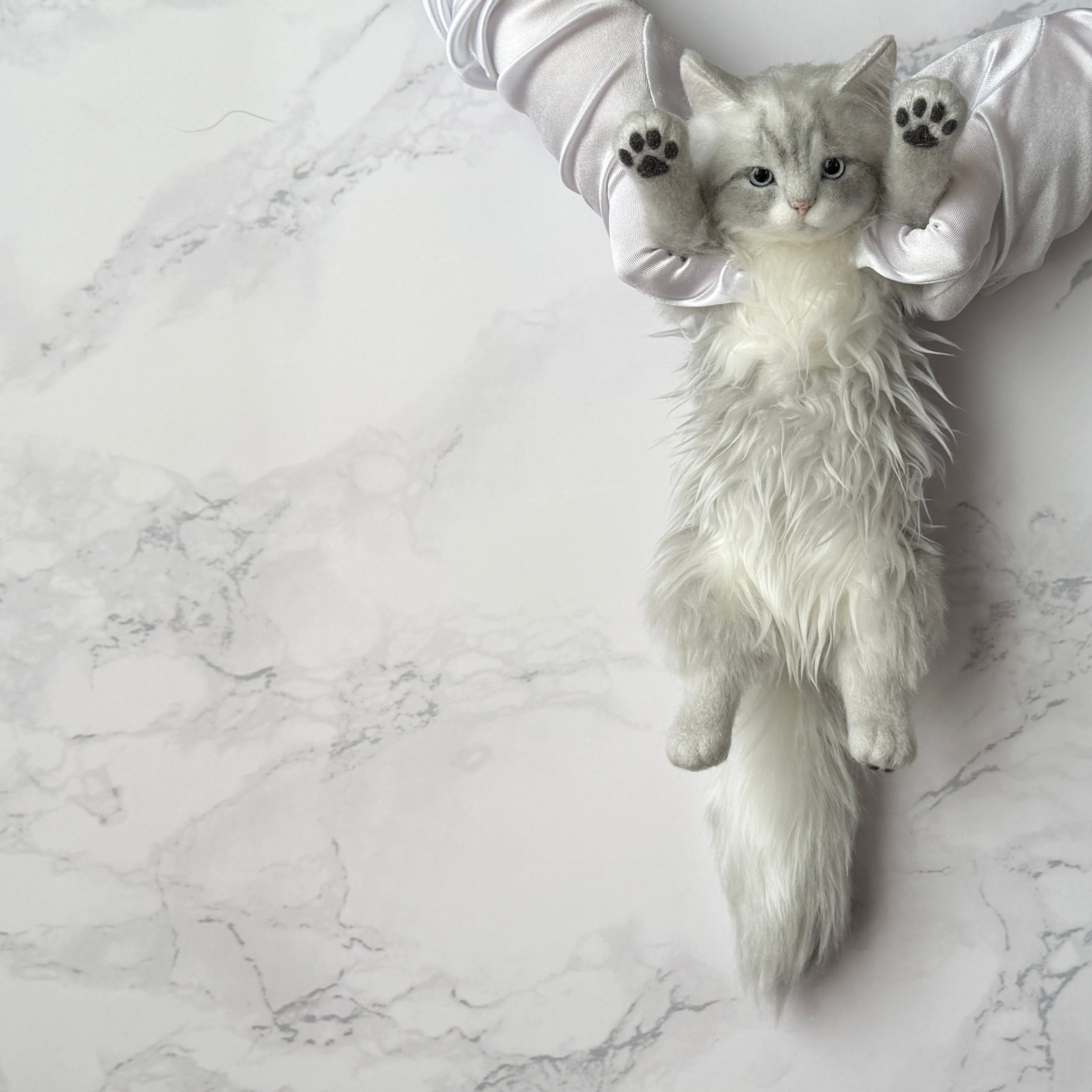 An art-craft plush inspired by a gray, long-haired cat.