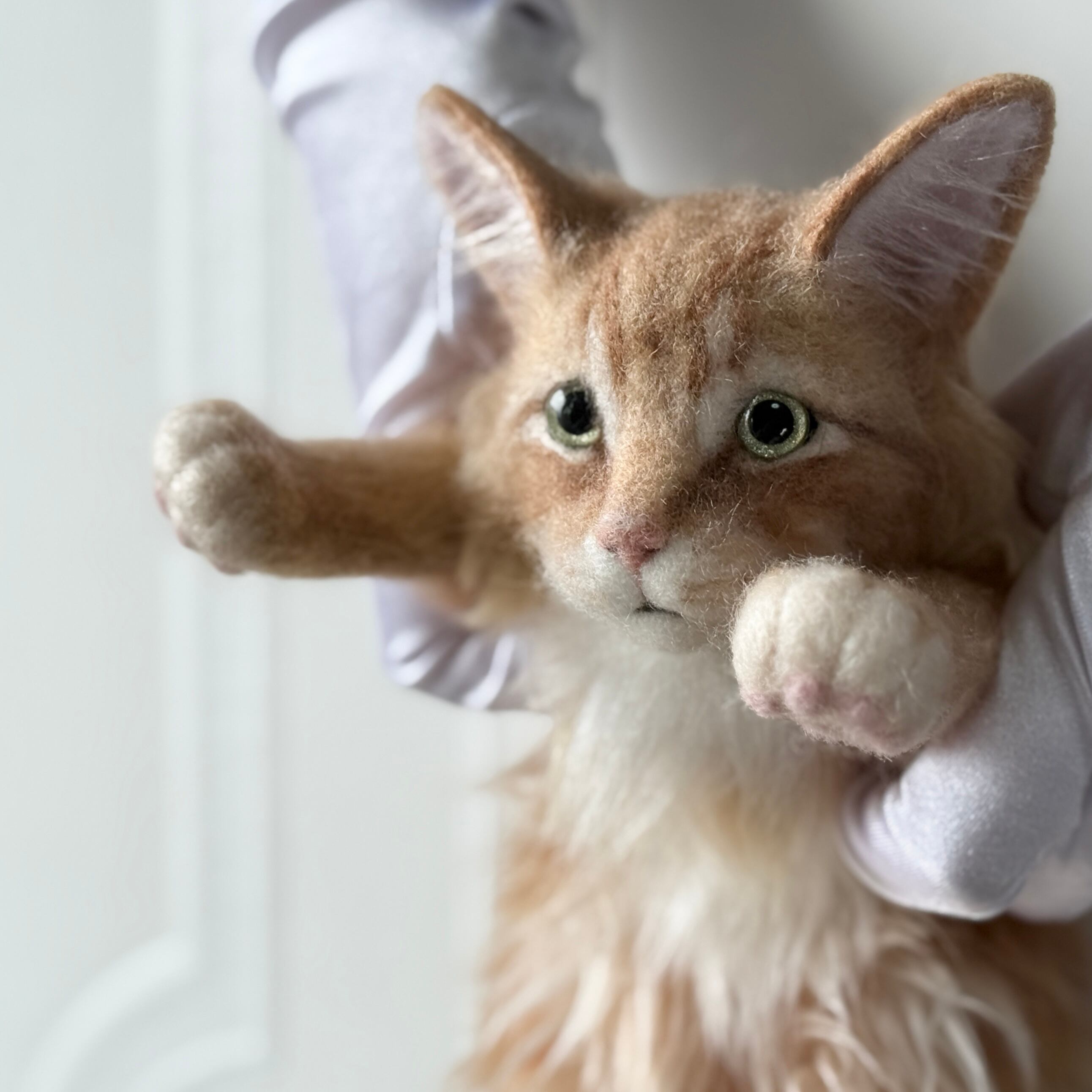 - Green-toned acrylic eyes and pink needle-felt paw pads