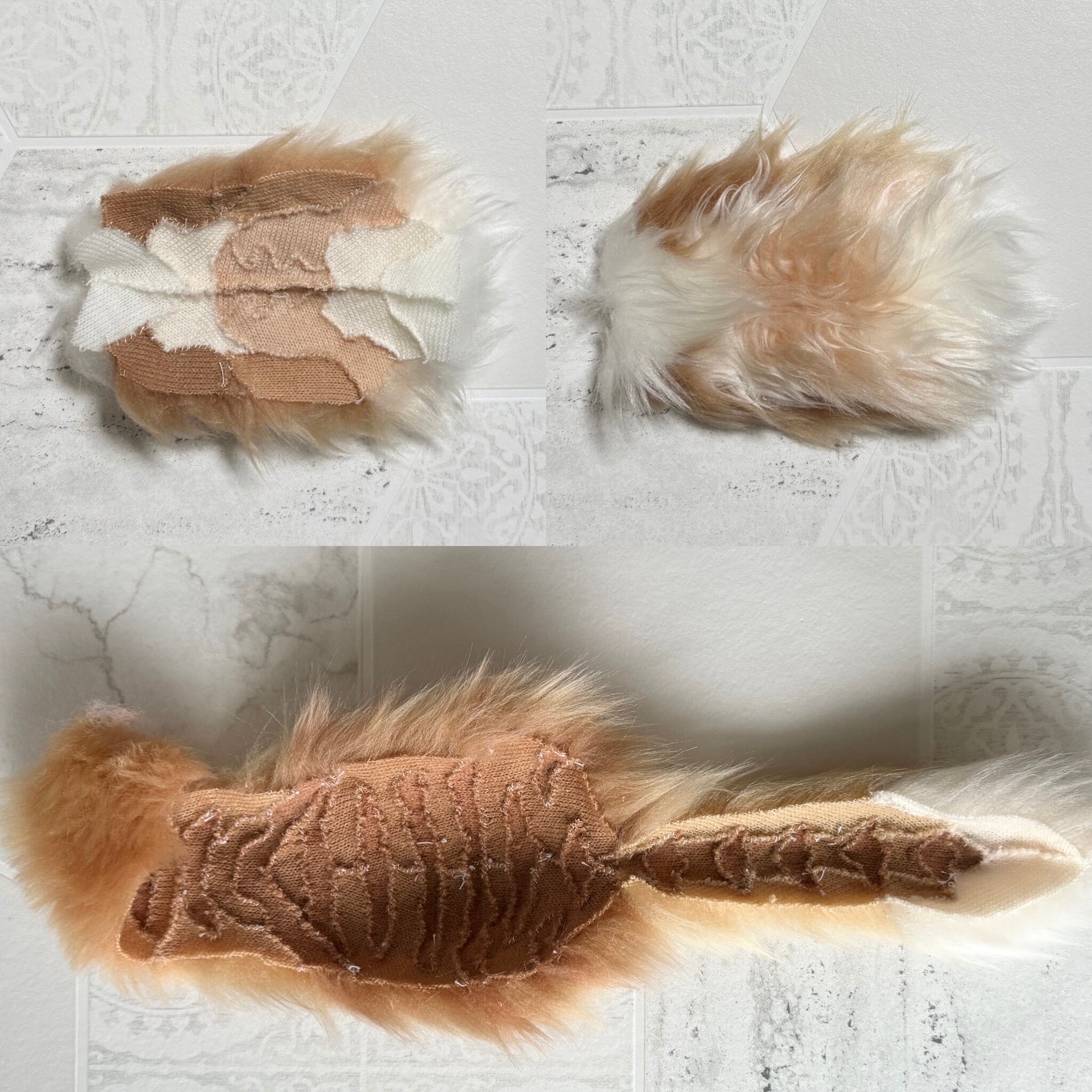 微妙に色味の異なるベージュ系のファーを縫い合わせ、全身を覆うタビーを初め、色彩の変化・グラデーションを再現。