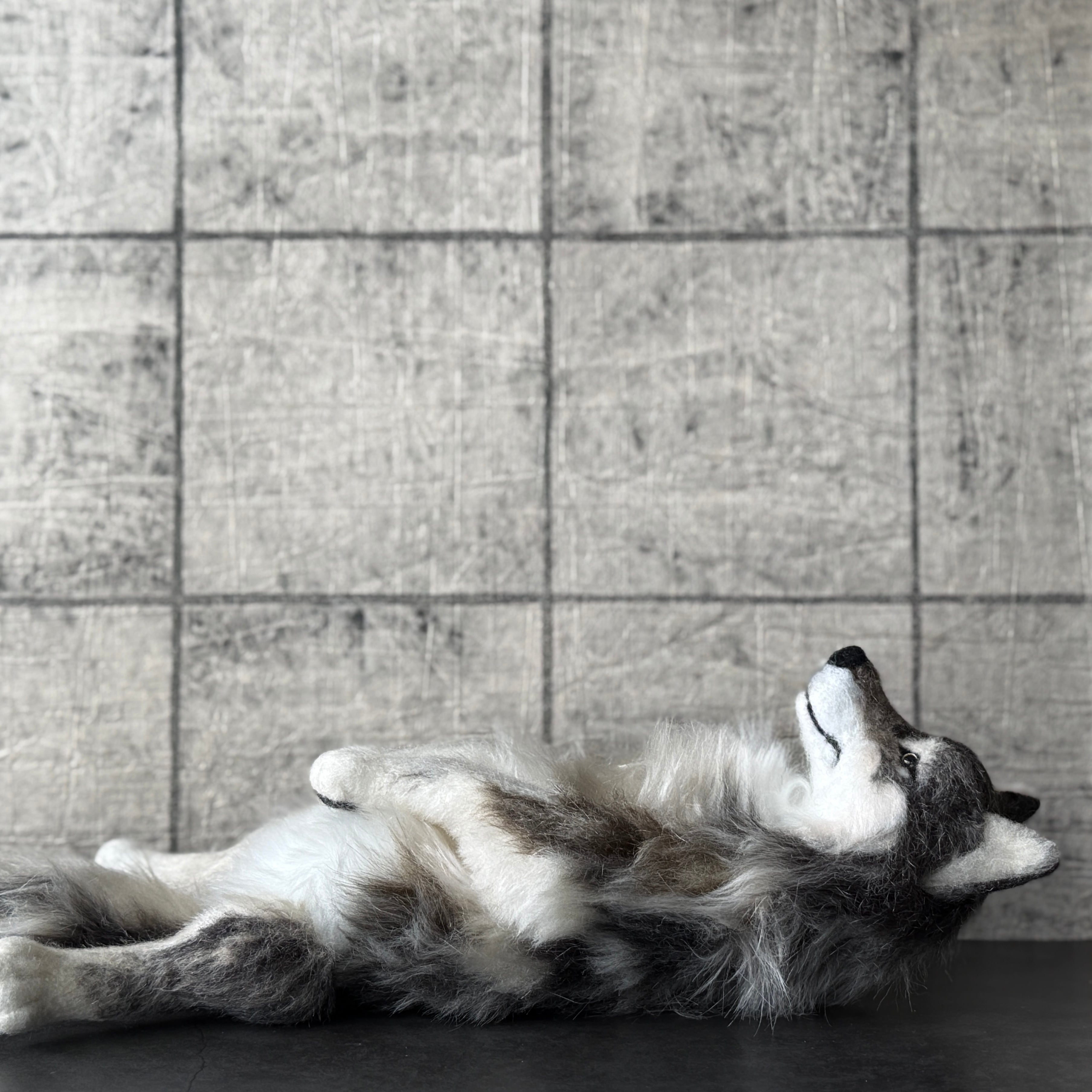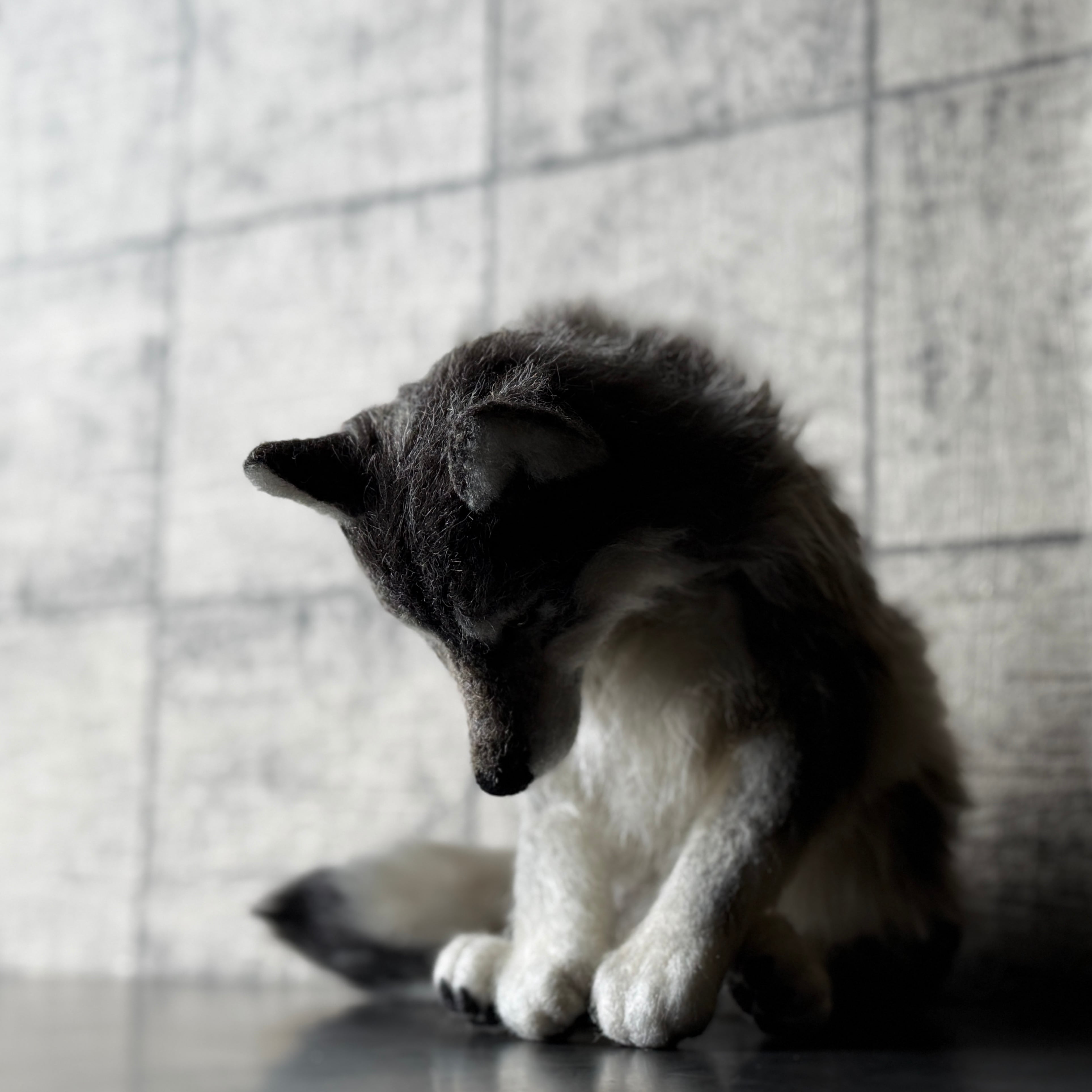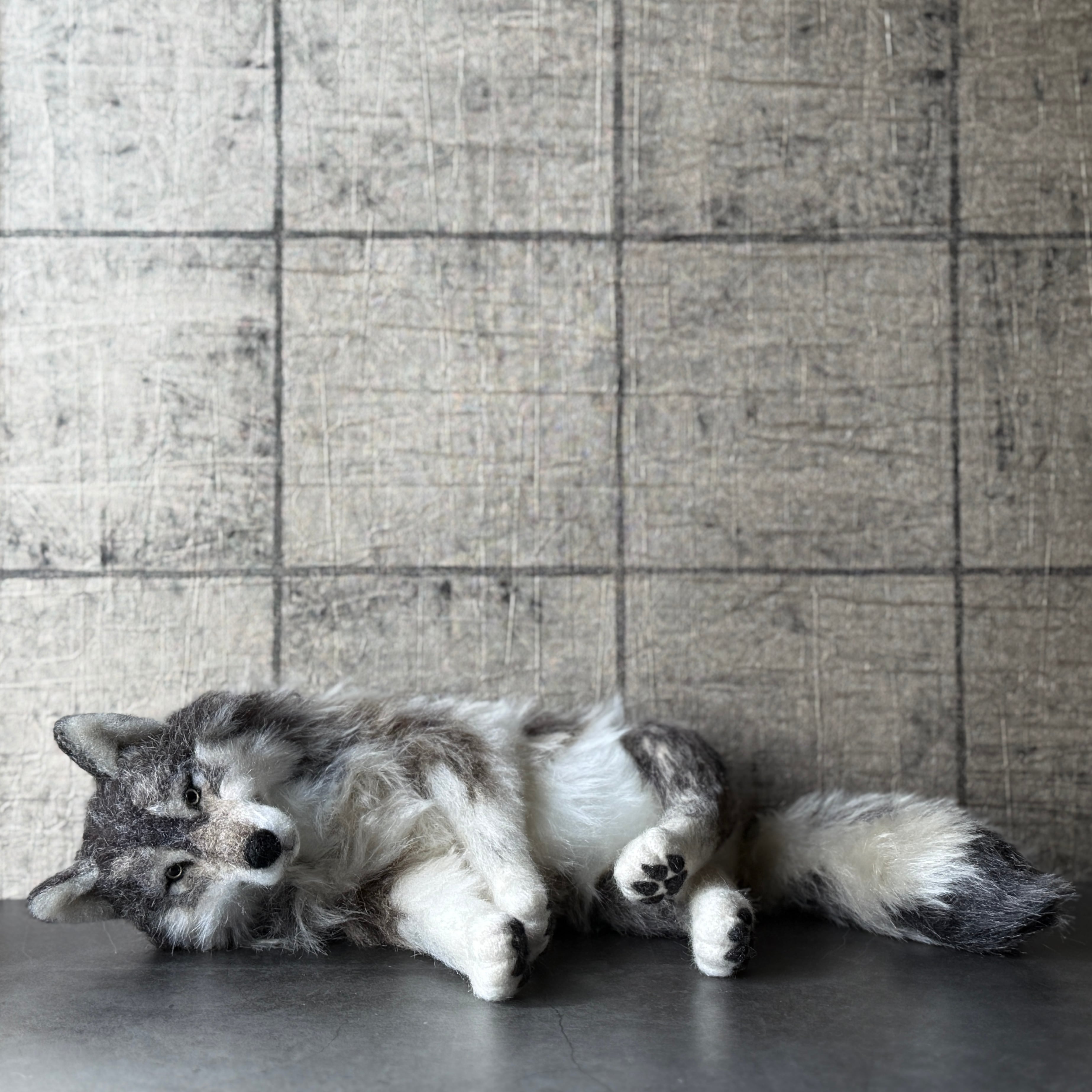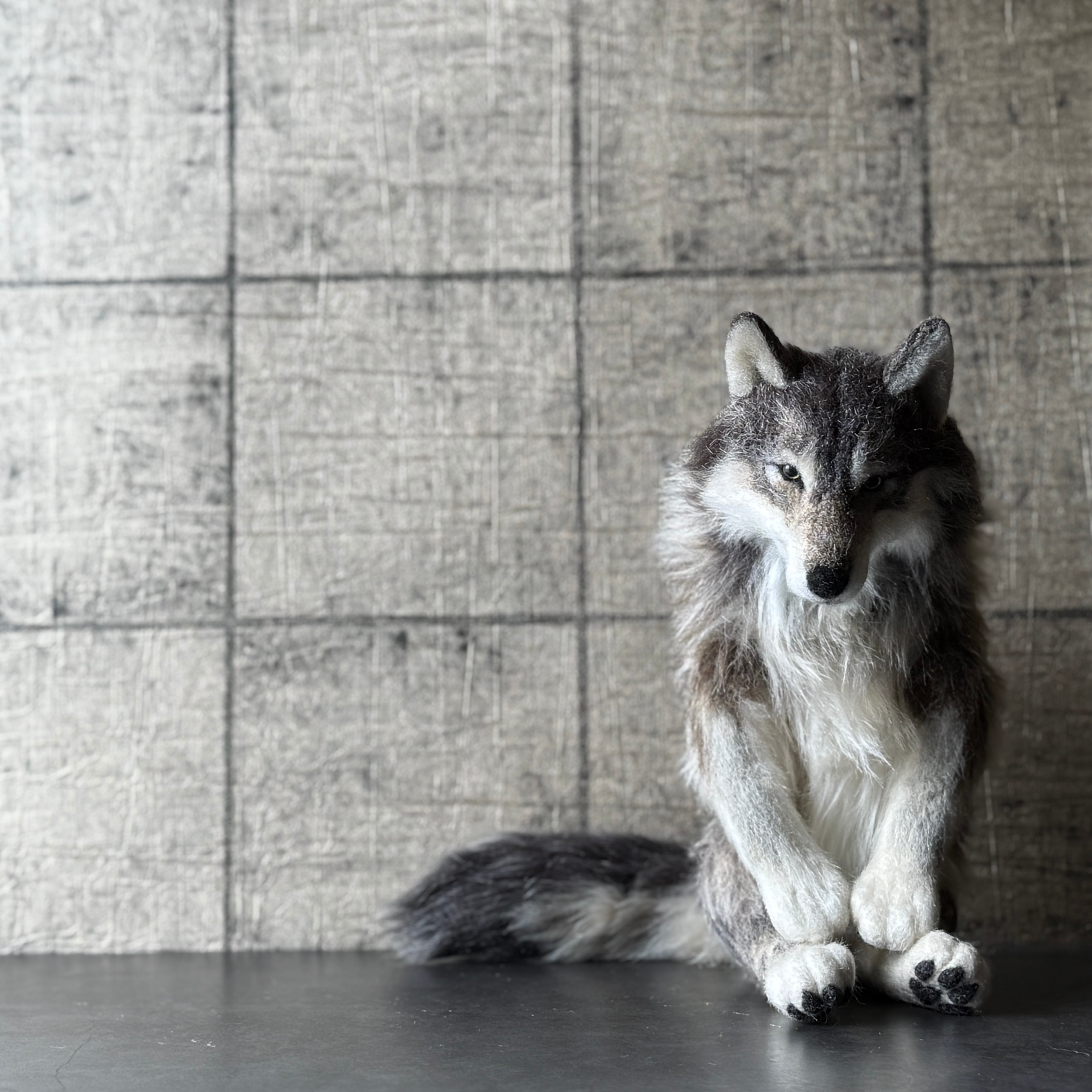 An art-craft plush sculpture of a wolf.