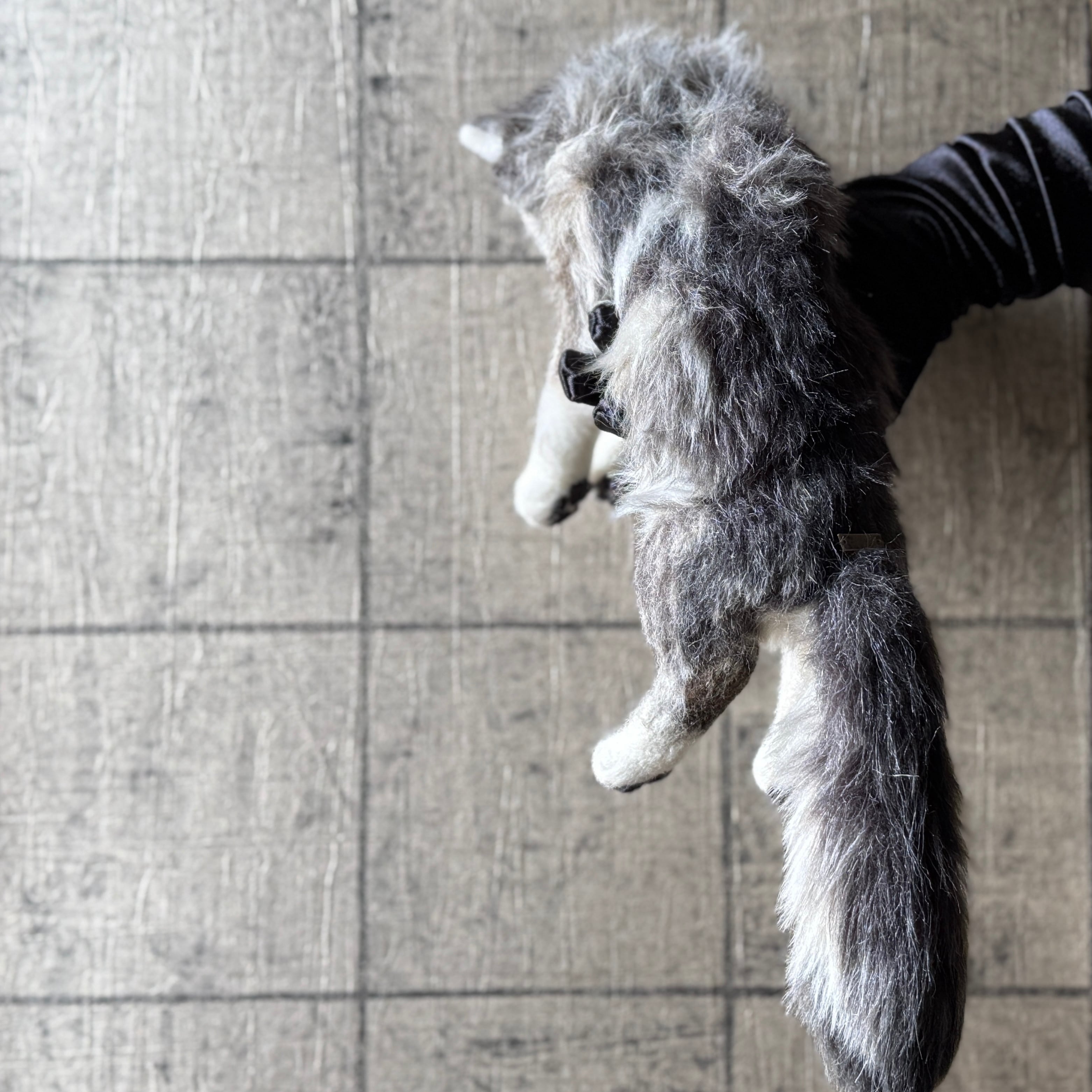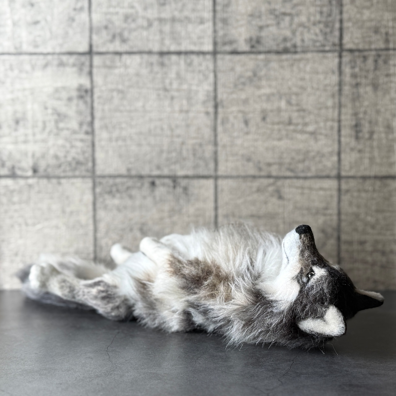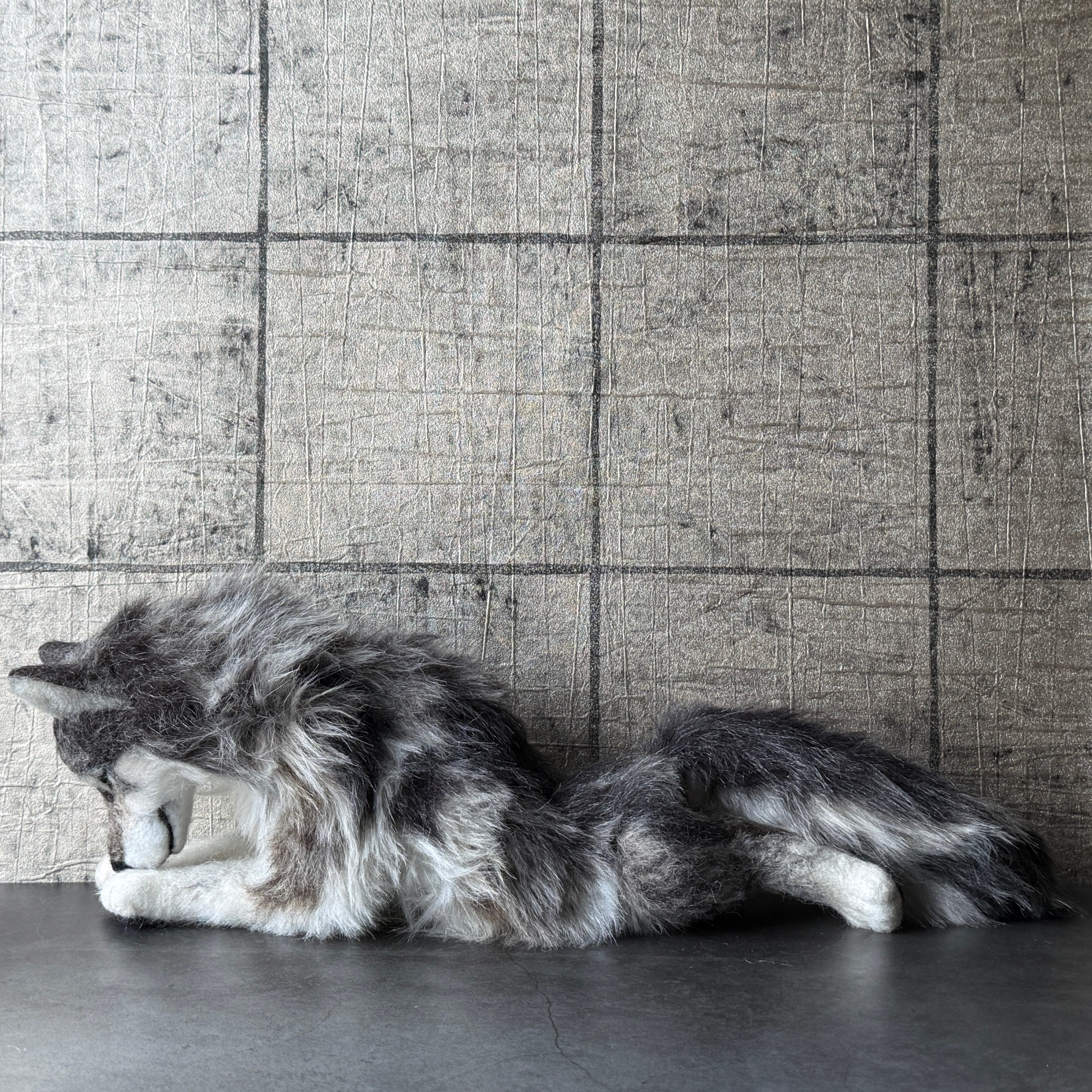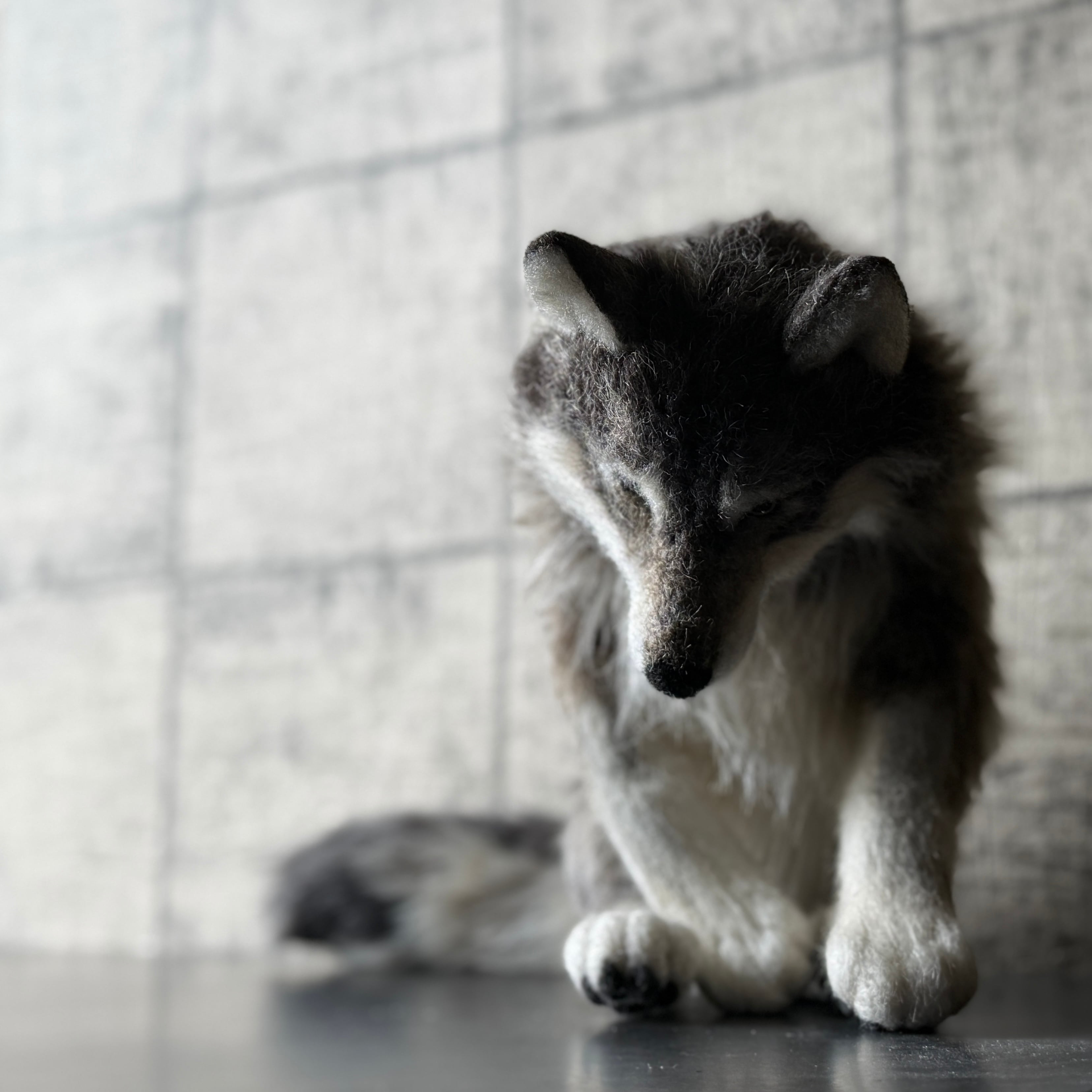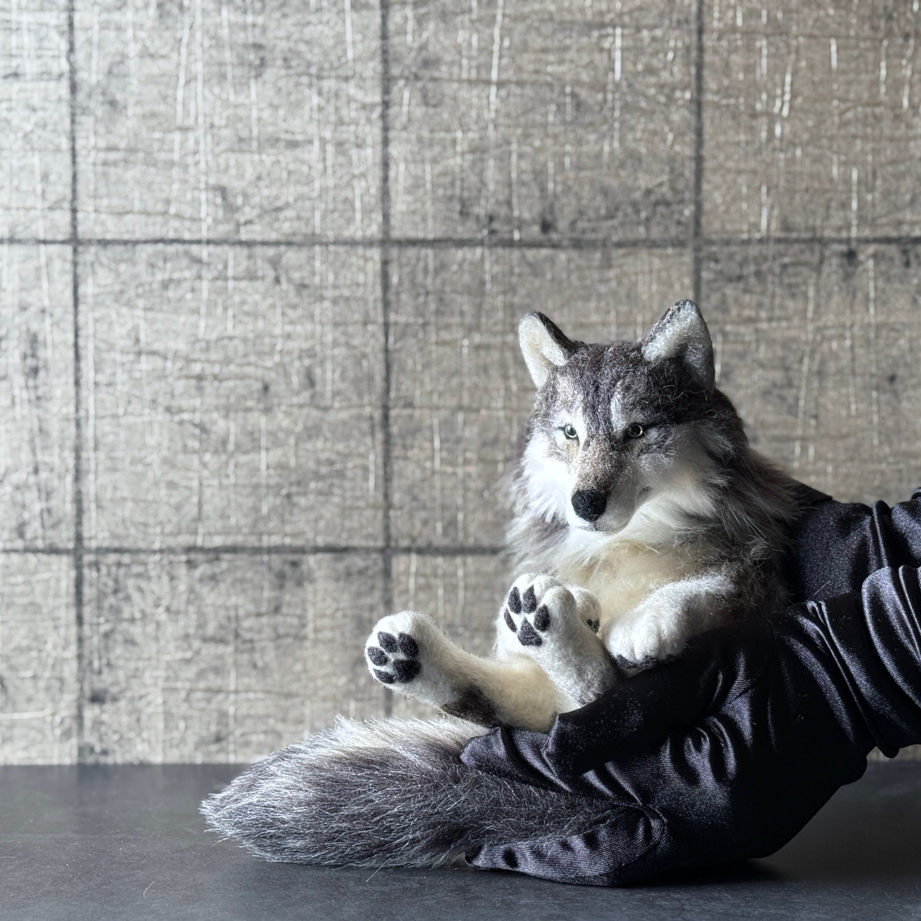 An art-craft plush sculpture of a wolf.