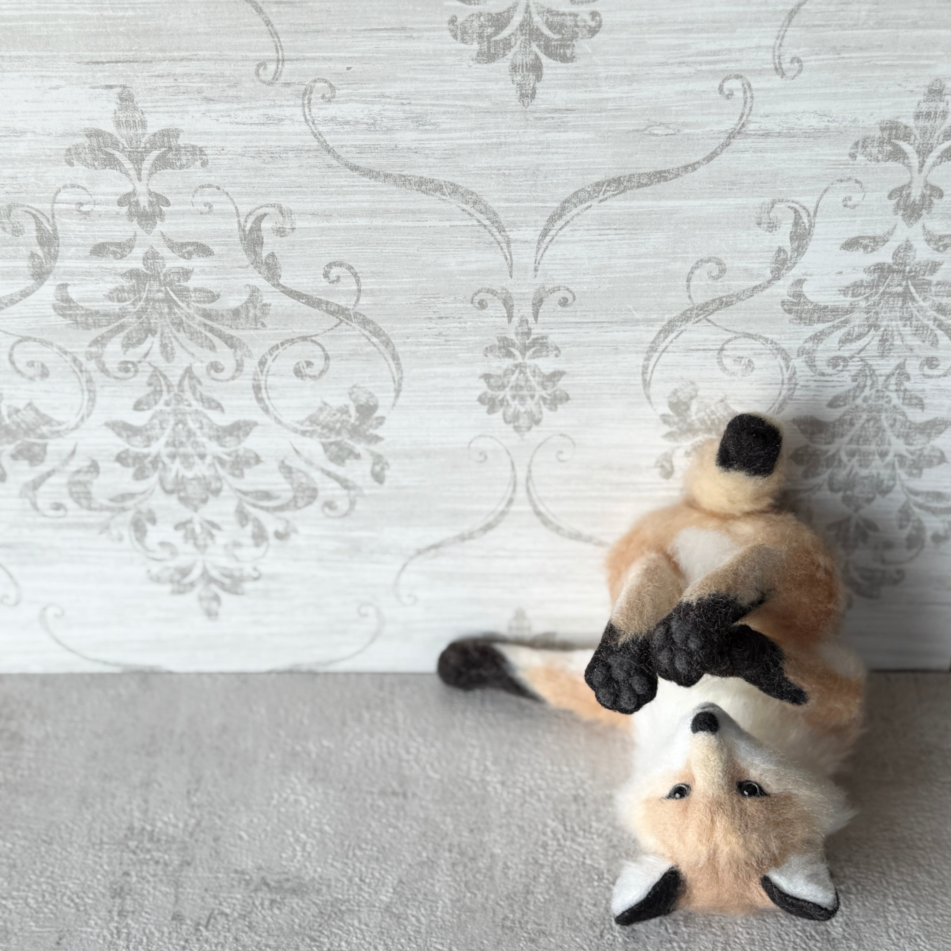 The form captures the distinctive proportions of a fox cub, with a slightly elongated neck and a softly rounded belly.