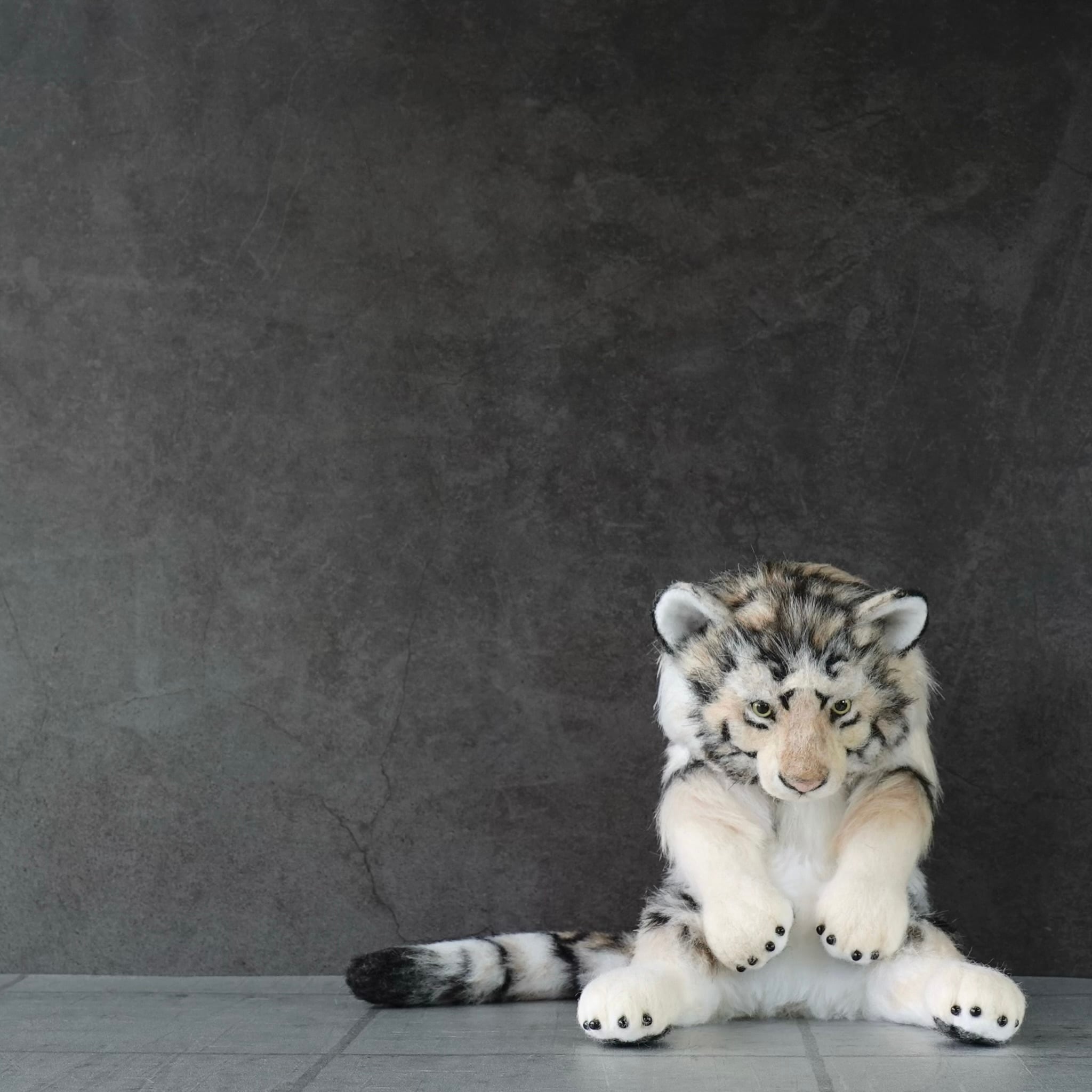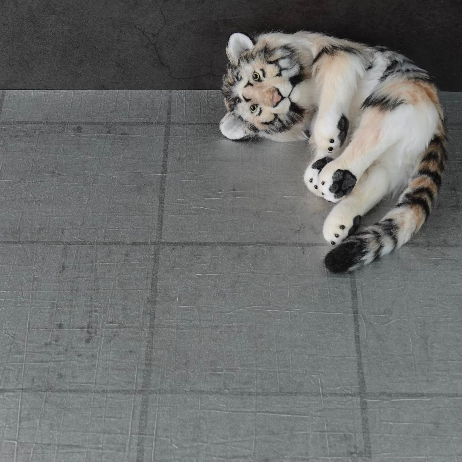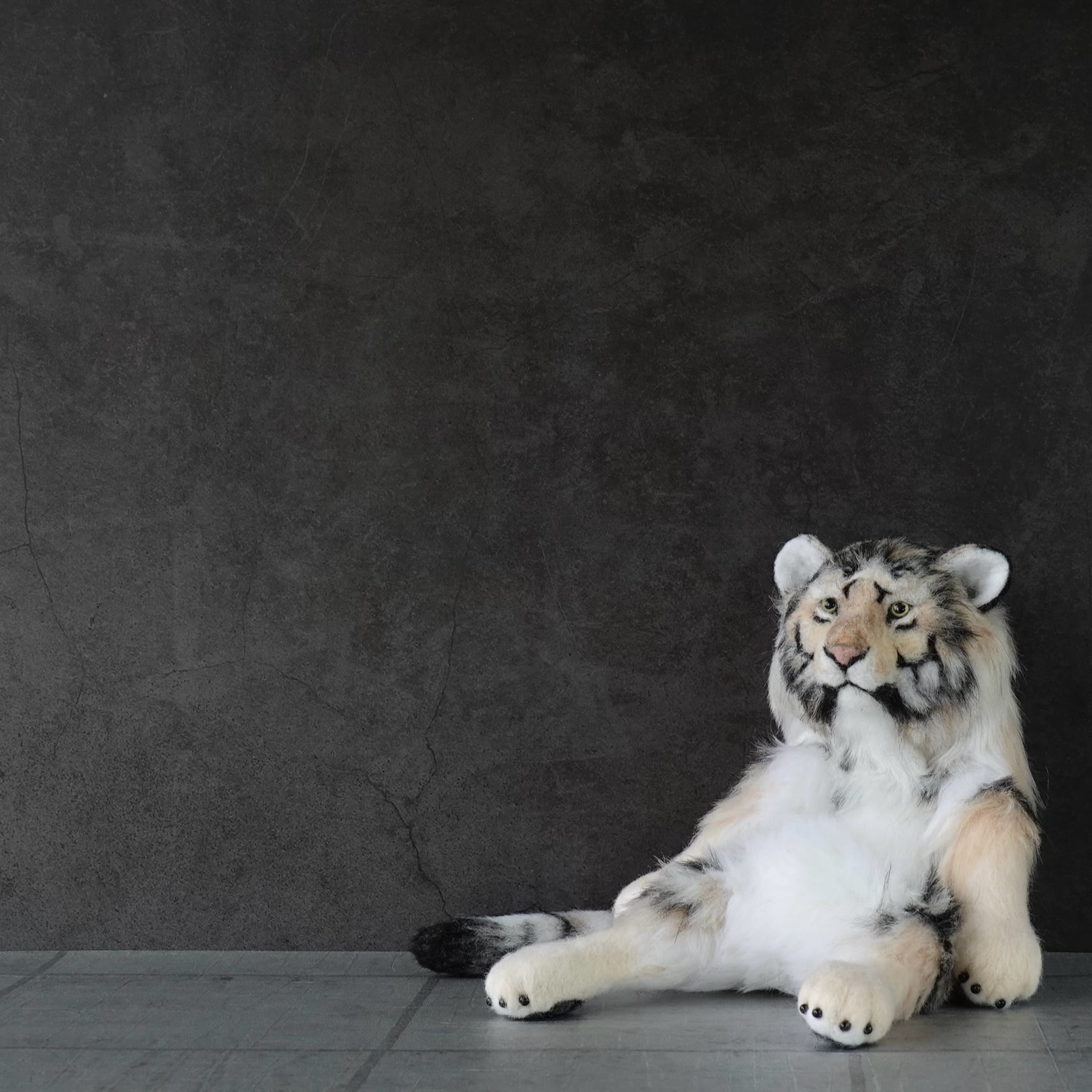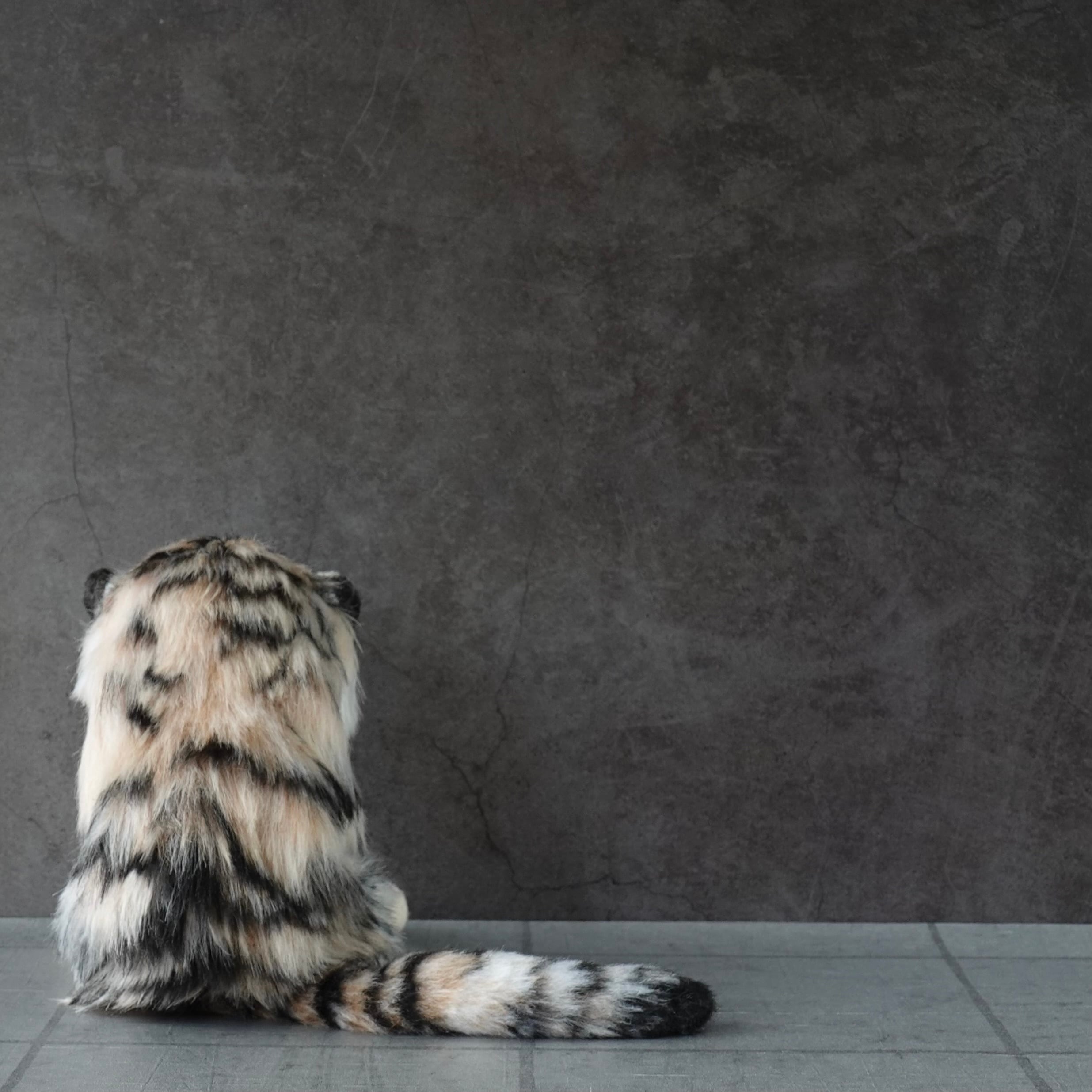 よりみちシリーズのトラのぬいぐるみ。耳から顎にかけて、タテガミがあります。4色のファーを使用。白のファー以外は全て手染めです。肉球はニードルフェルト(ブラックとグレーの混色)で爪はブラックのビーズで表現しています。目の色はイエローです。