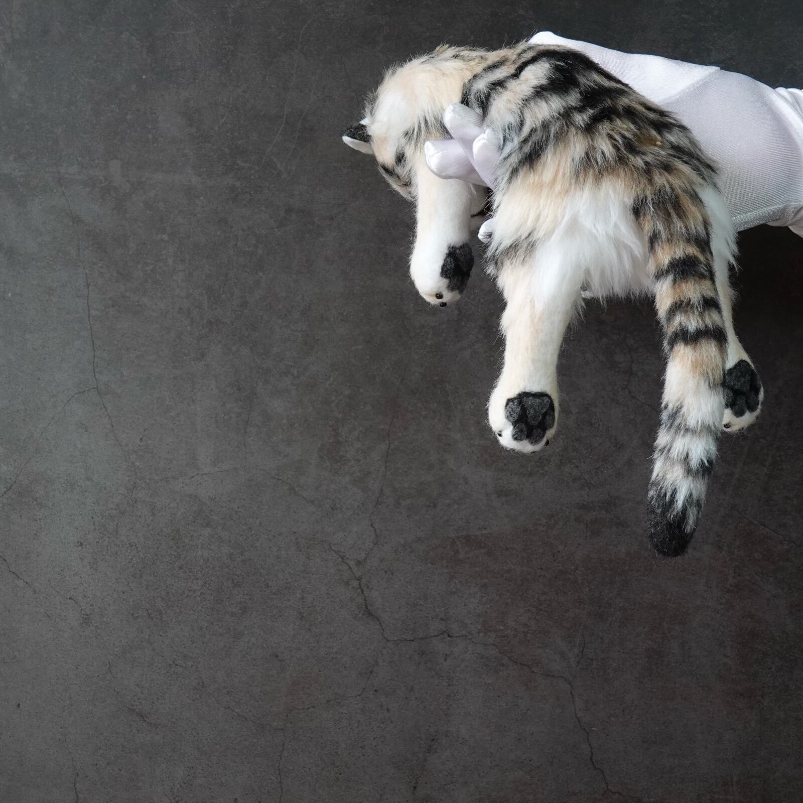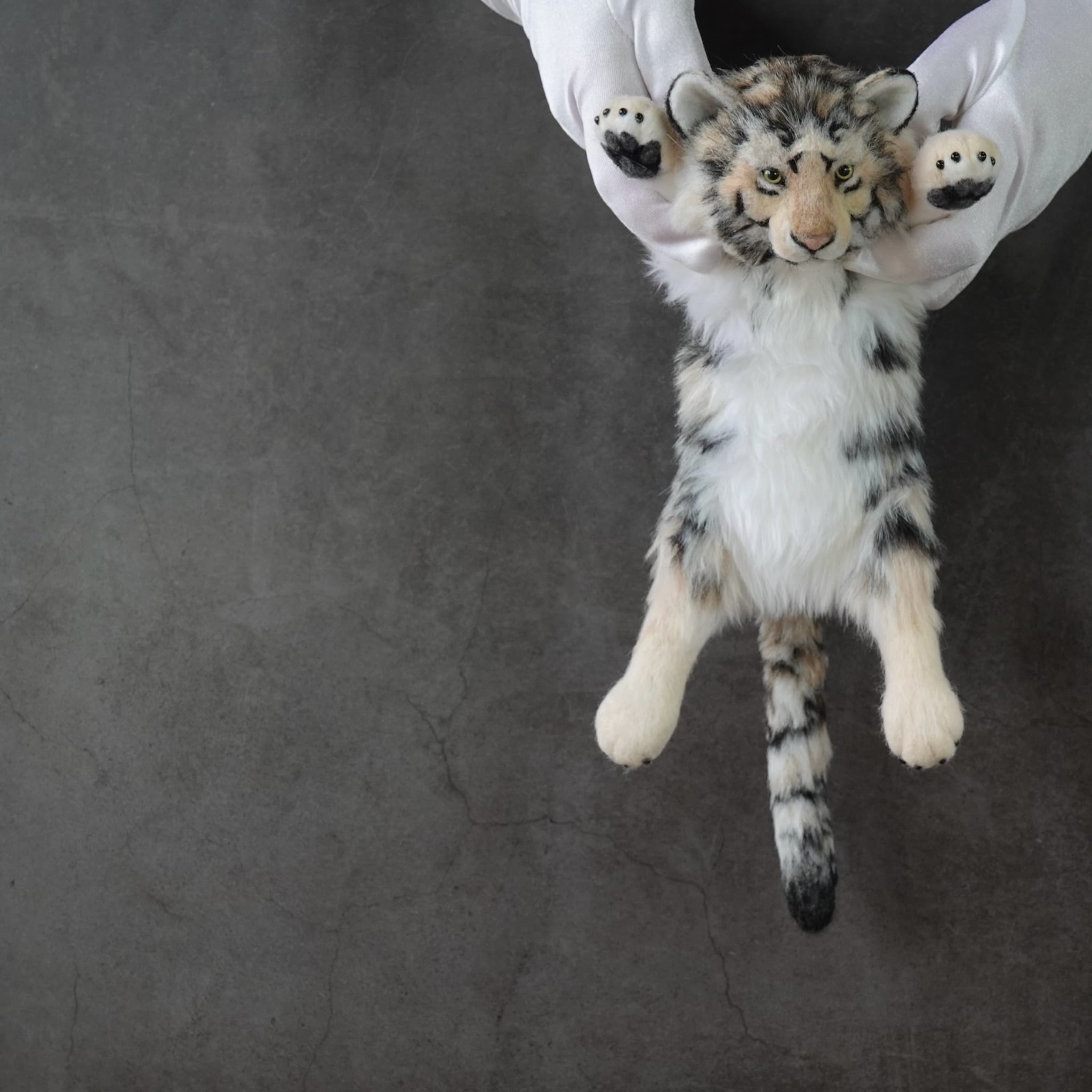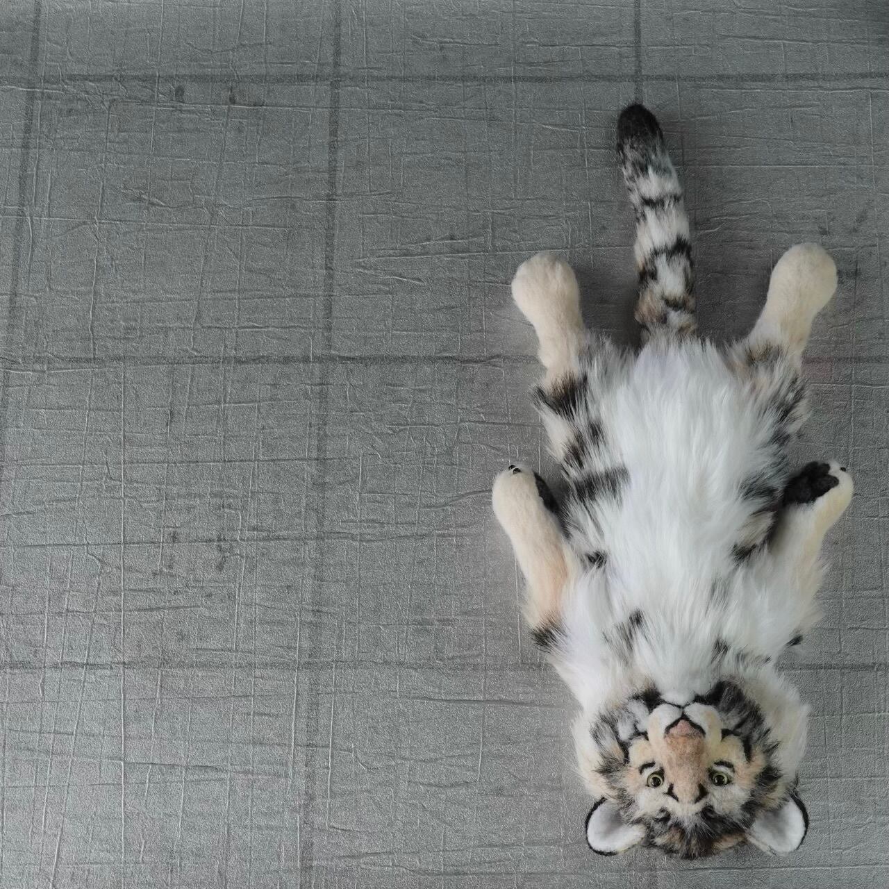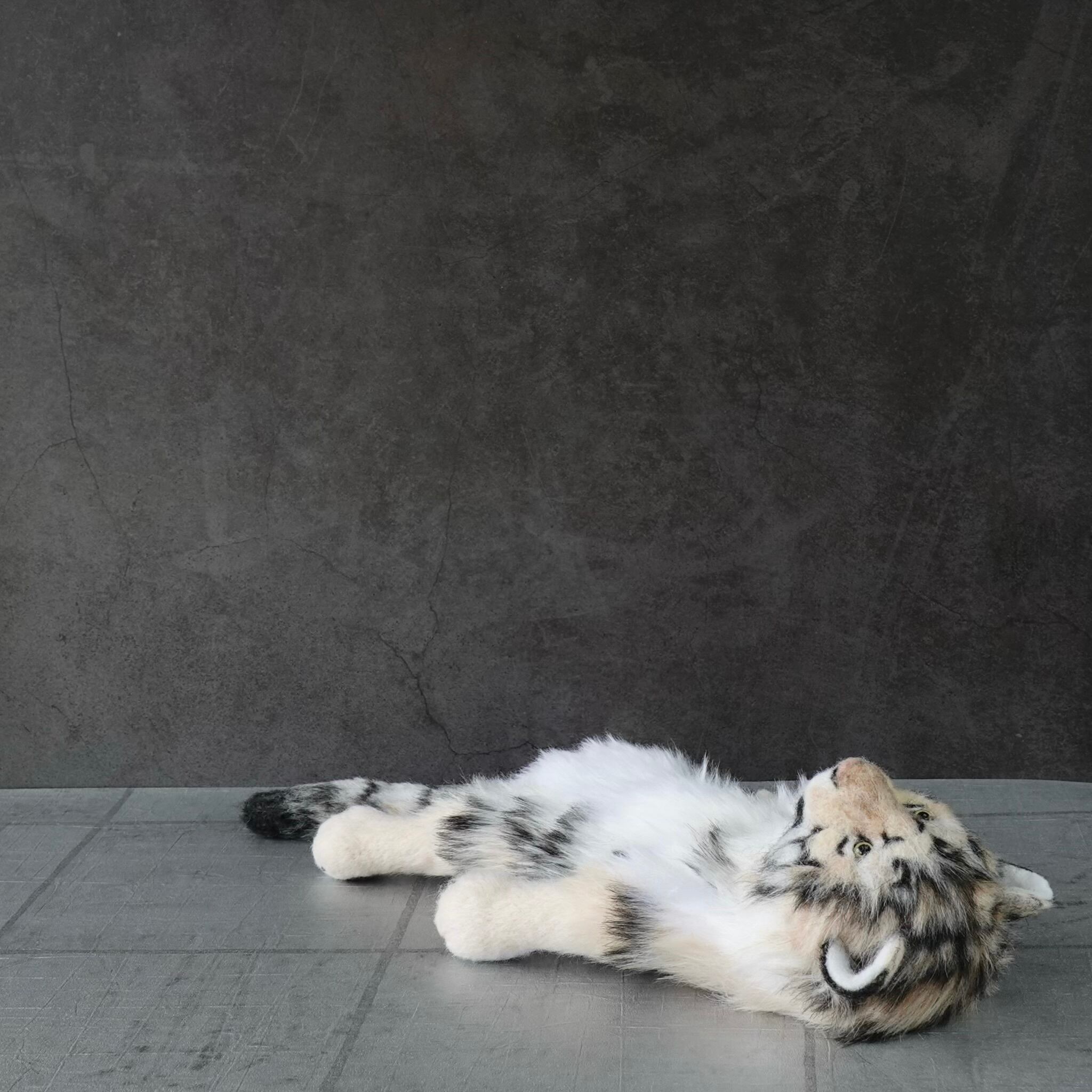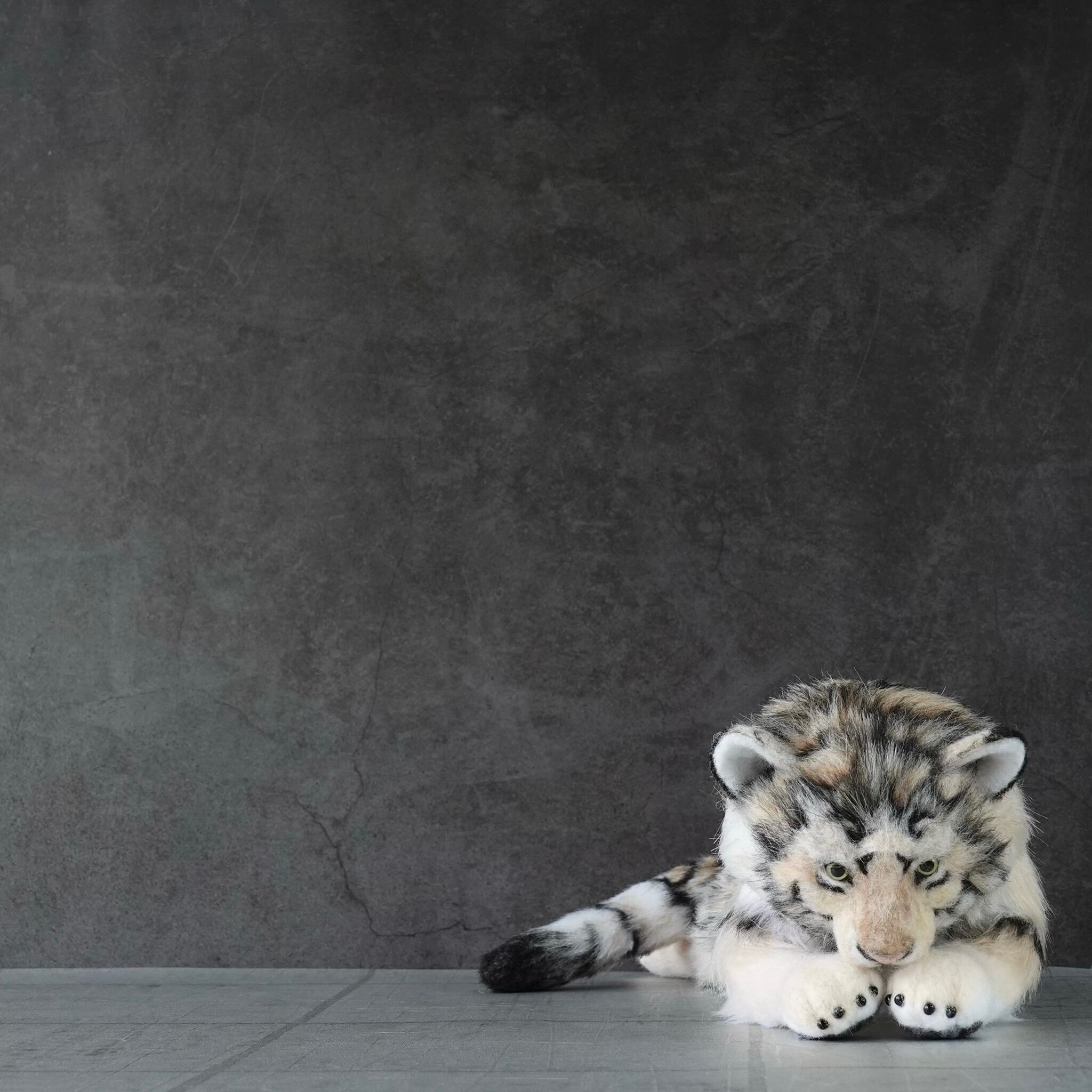 よりみちシリーズのトラのぬいぐるみ。耳から顎にかけて、タテガミがあります。4色のファーを使用。白のファー以外は全て手染めです。肉球はニードルフェルト(ブラックとグレーの混色)で爪はブラックのビーズで表現しています。目の色はイエローです。
